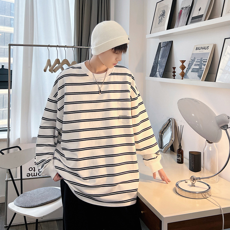 티셔츠 남성용 트렌디하고 다재다능한 봄, 가을 긴팔 홍콩 스타일 루즈한 바닥 셔츠 하이 스트리트 캐주얼 스트라이프 풀오버 탑