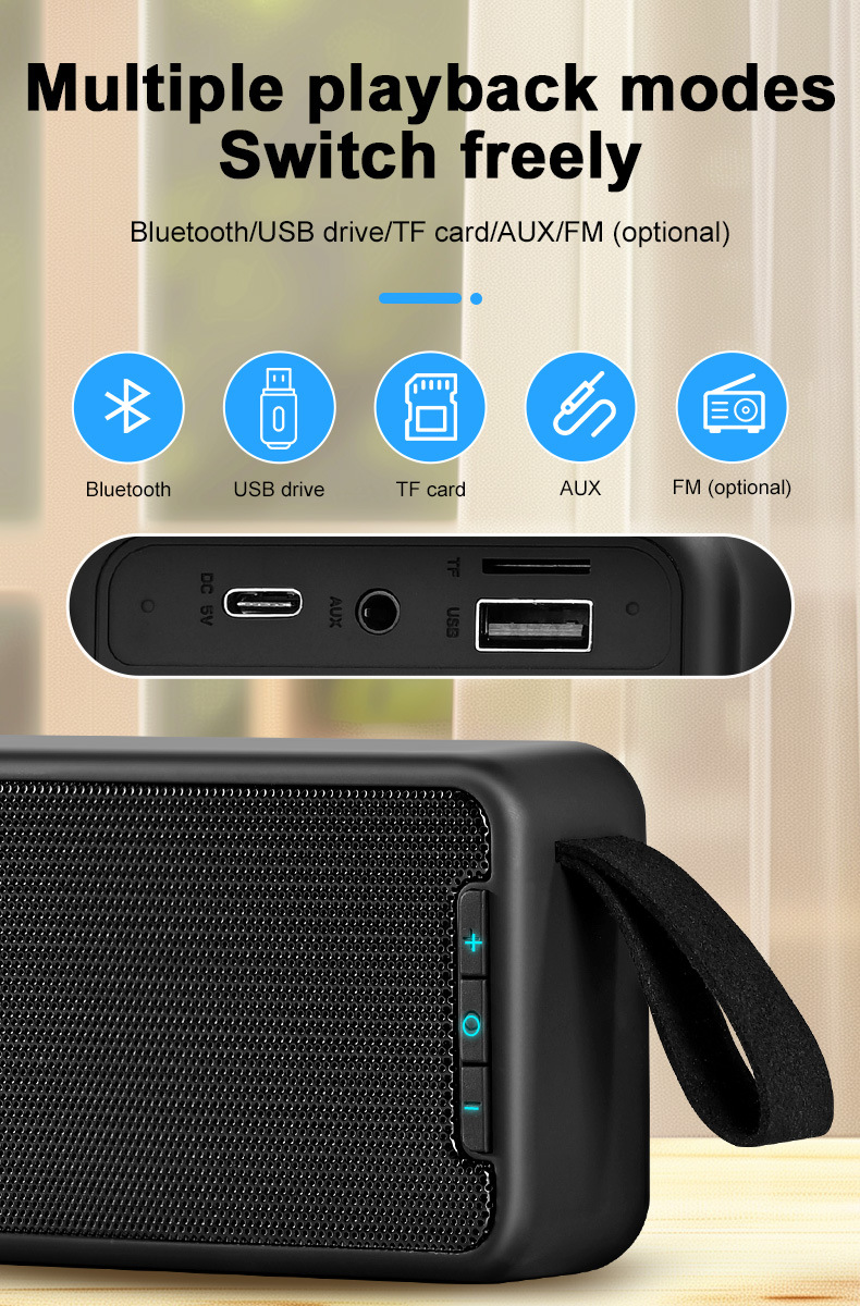 产品功能 蓝牙播放,免提通话,TWS对联,AUX,TF插卡,U盘播放,FM收音机功能
