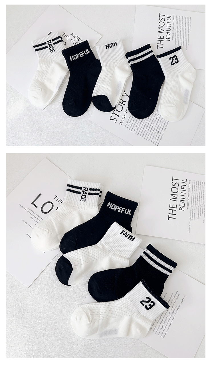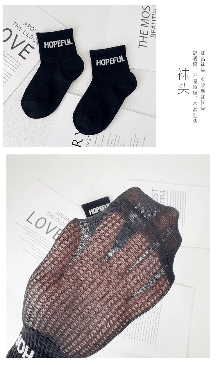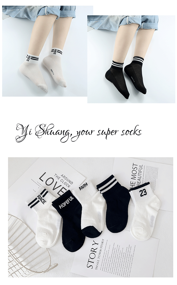 Yi Shuang 어린이 양말 여름 큰그물 초박형 유행 브랜드 편지 짧은 양말 코튼 블랙과 화이트 소년의 에어컨 양말