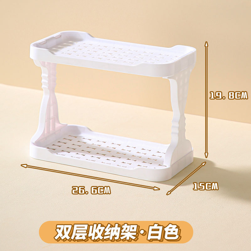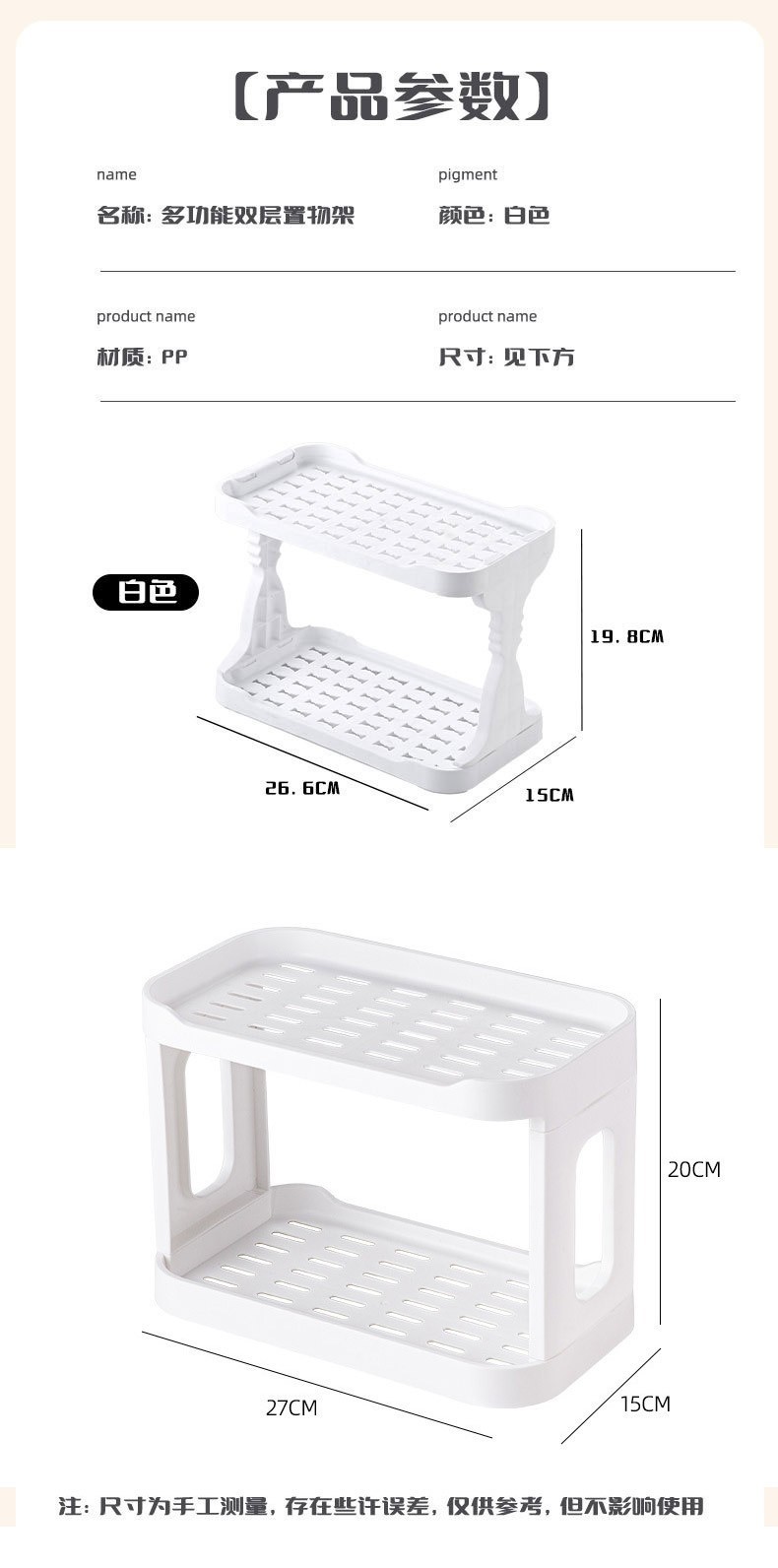 品名:QY2105双层置物架 | 单品重量:306.2克 | 单品含纸盒重量:400克 | 产品材质:PP | 包装方式:独立纸箱