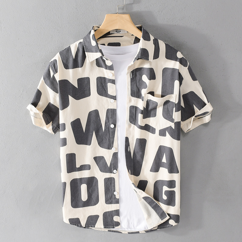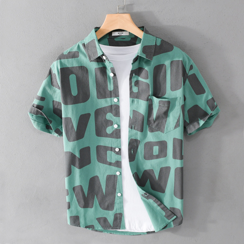 여름 남성 반팔 프린트 셔츠 비치 트렌디 남성 편안한 인기 청소년 느슨한 면 캐주얼 셔츠 9766