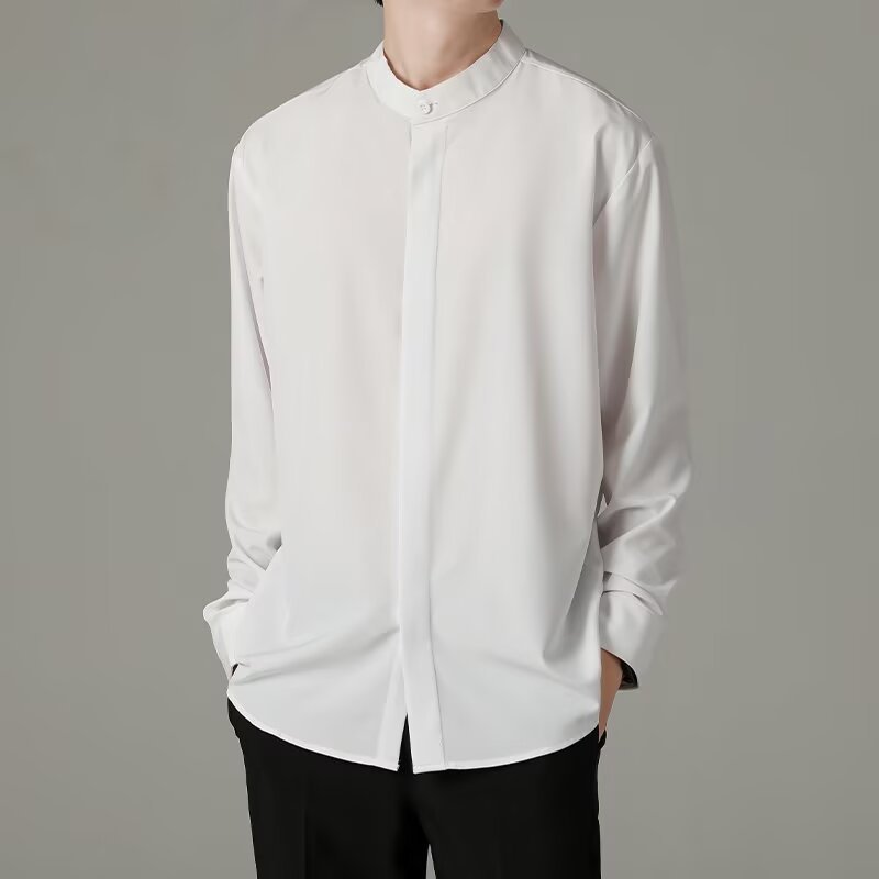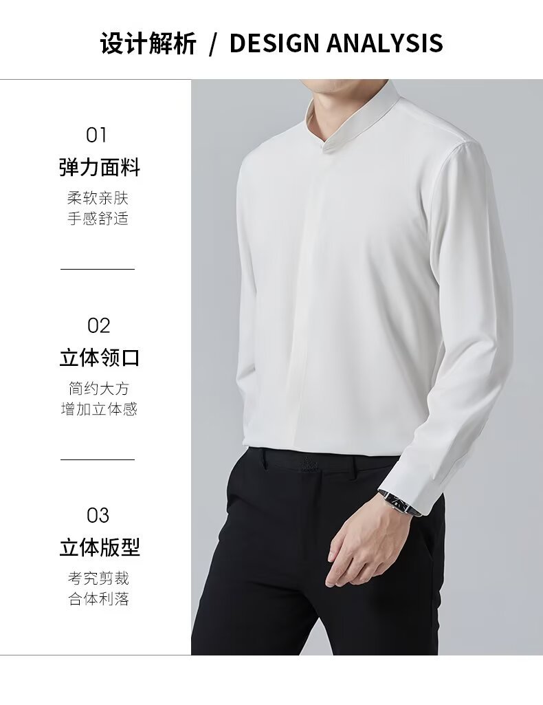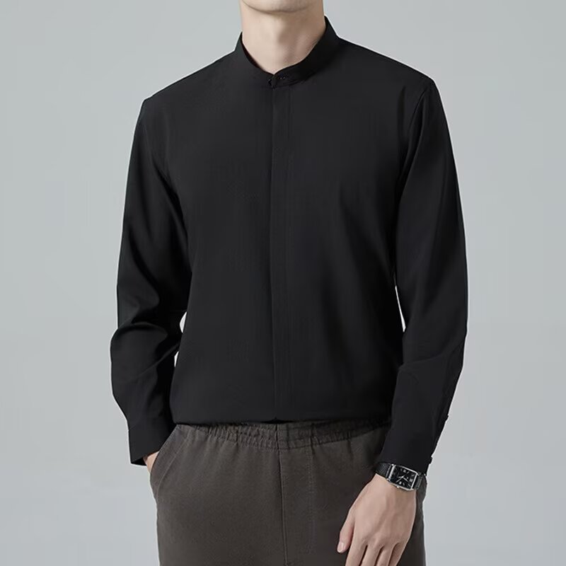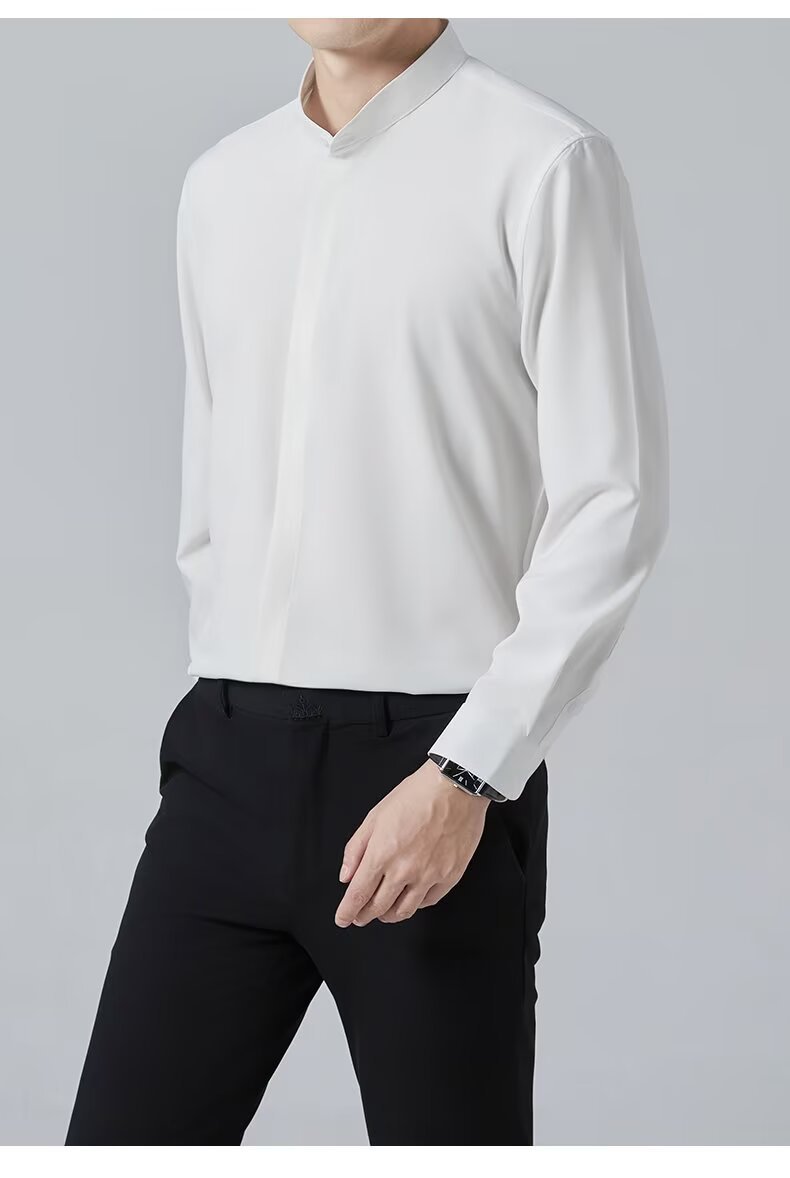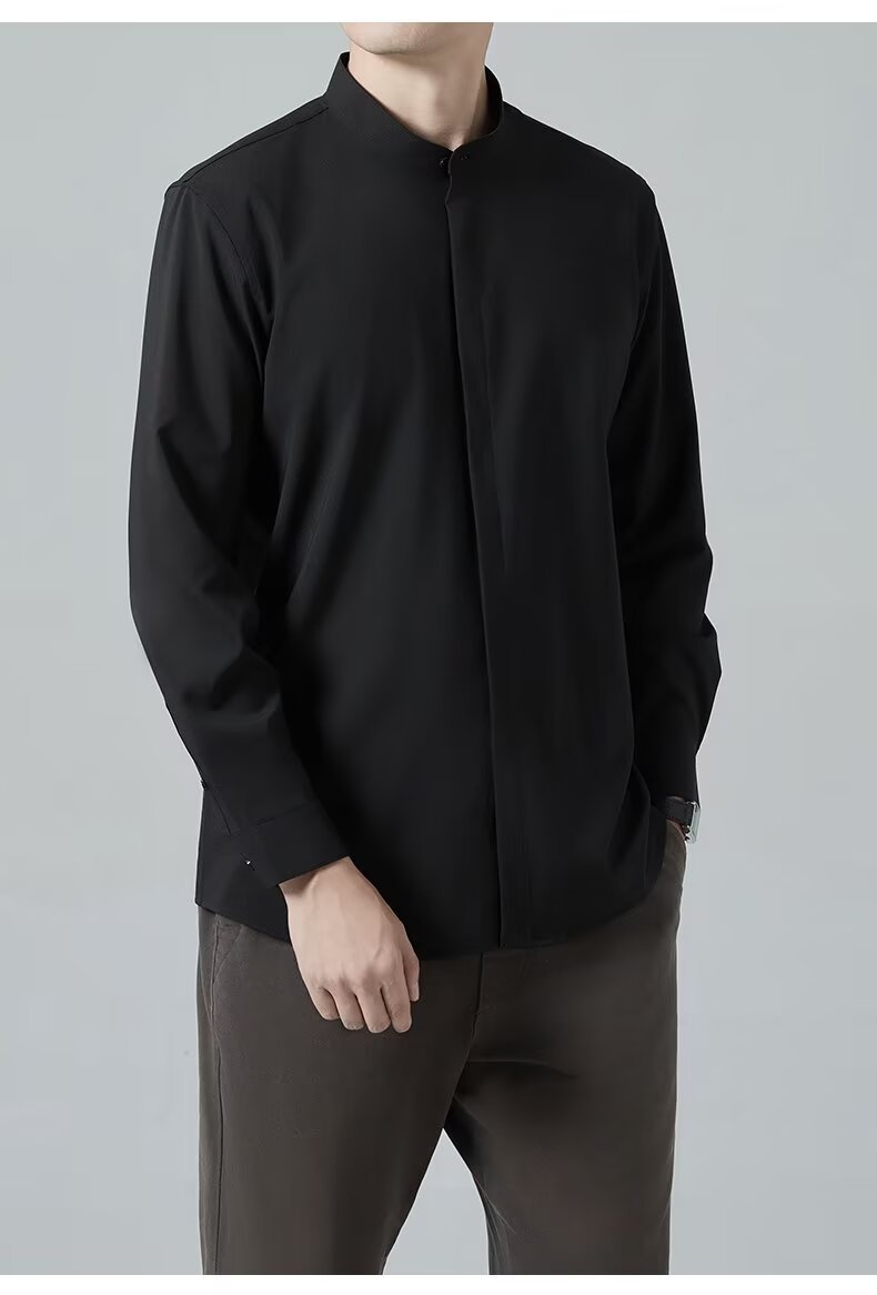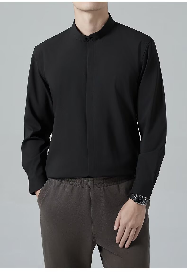 긴팔 셔츠 남자의 새로운 중국 스탠드 칼라 가벼운 성숙한 스타일 남자 여름 한국 슬림 핏 비 다림질 얇은 아이스 실크 셔츠