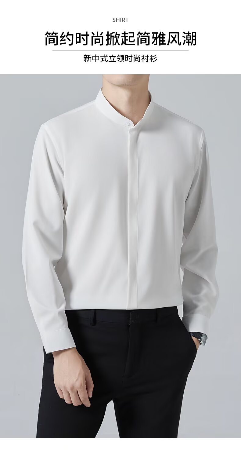 긴팔 셔츠 남자의 새로운 중국 스탠드 칼라 가벼운 성숙한 스타일 남자 여름 한국 슬림 핏 비 다림질 얇은 아이스 실크 셔츠스토어 가기