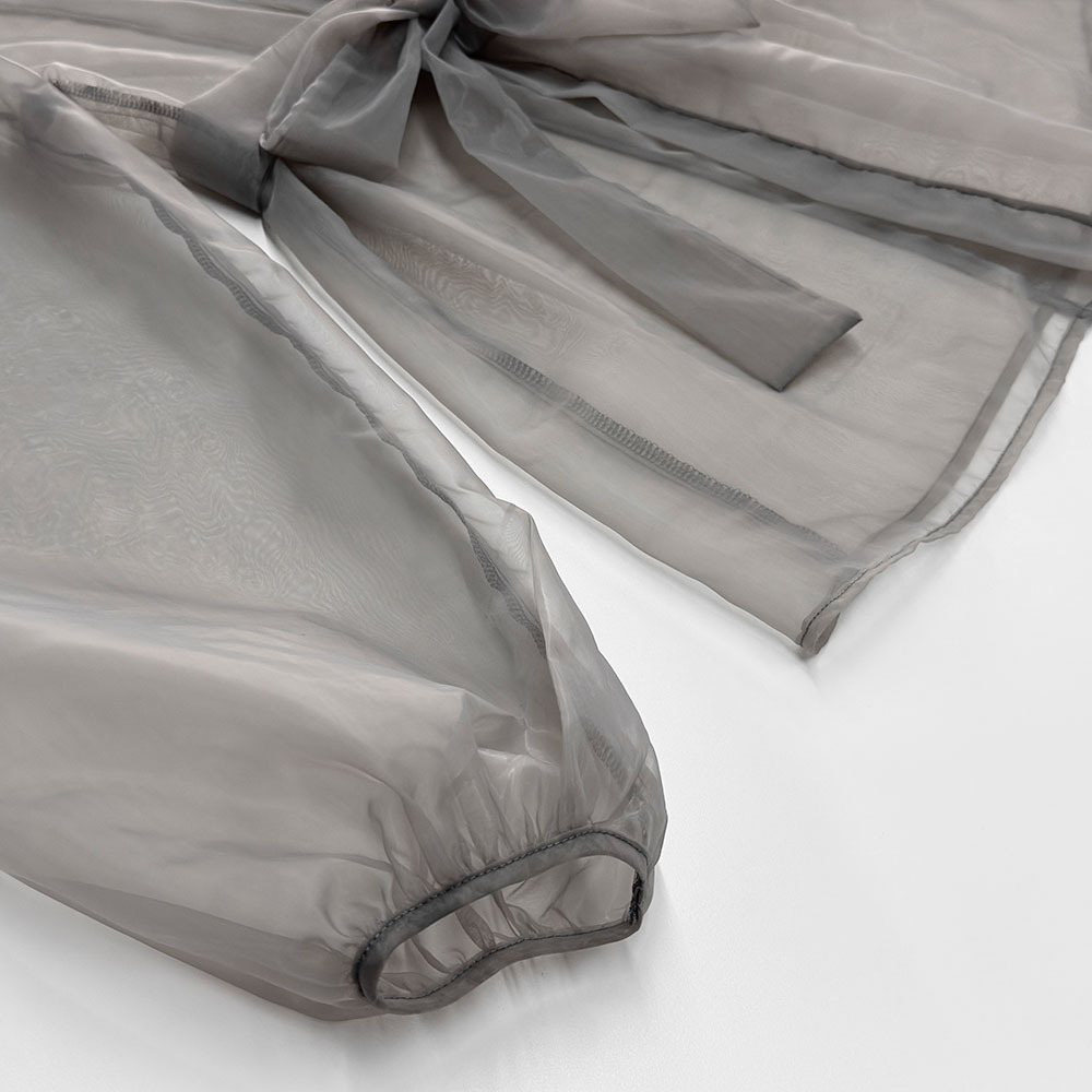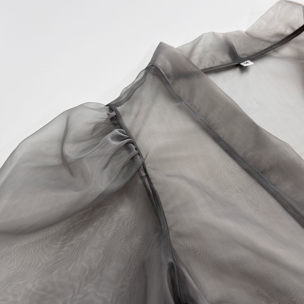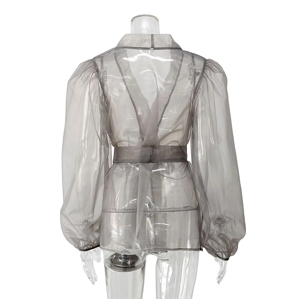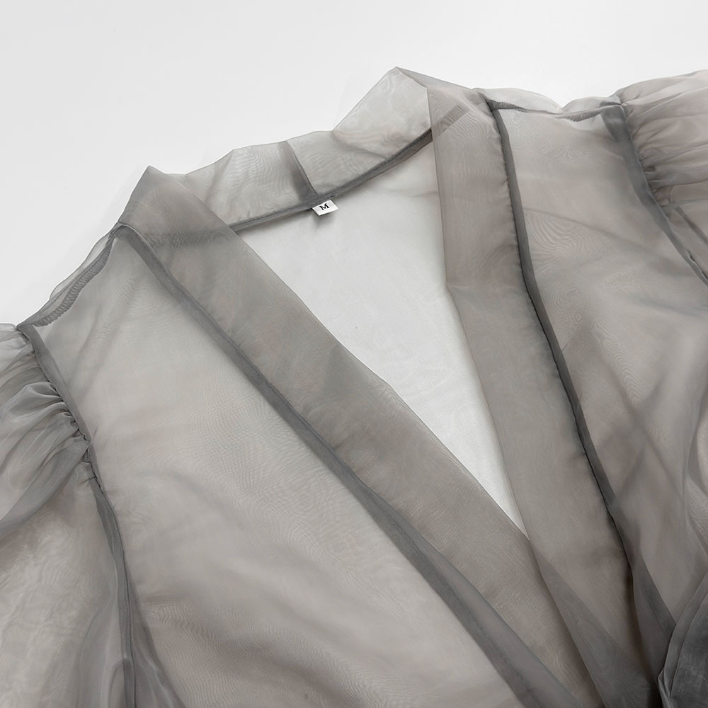 2025 봄 여름 유럽 및 미국 패션 여성복 루즈핏 시스루 섹시 블라우스 퍼프 소매 셔츠 레이스업 메쉬 탑
