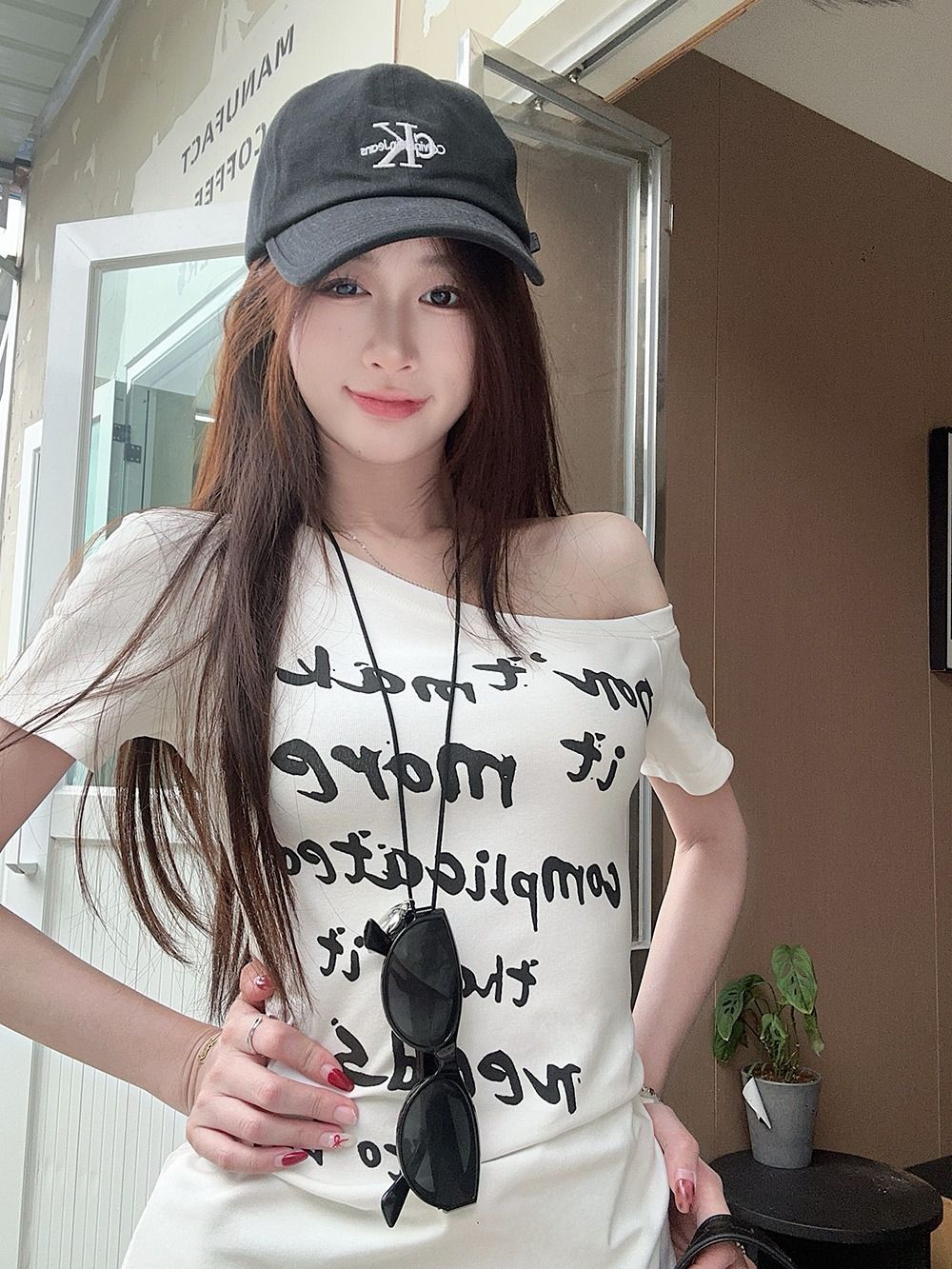 미국 스타일의 뜨거운 소녀 편지 인쇄 경사 어깨 반팔 티셔츠 여성의 여름 디자인 감각 단단한 허리 어깨 상단스토어 가기