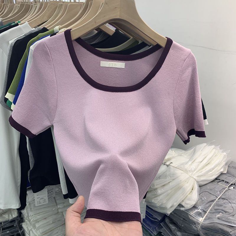 플러스 사이즈 명암 컬러 아이스 실크 반팔 티셔츠 여성 여름 새로운 2025u 니트 베이스 셔츠 디자인 짧은 탑스토어 가기