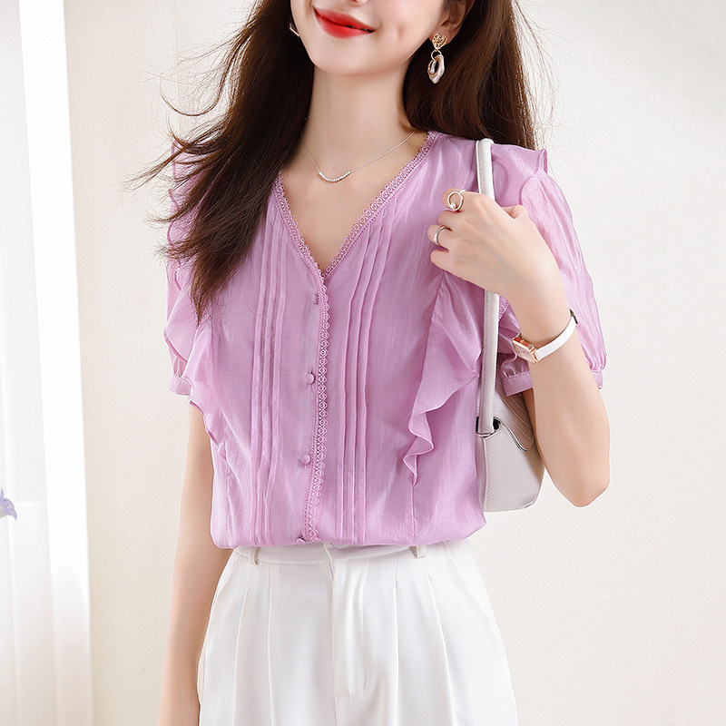 Real Shot Chic French Tencel Cool Shirt Women's 2023 Summer New V 넥 러플 핑크 스몰 탑스토어 가기
