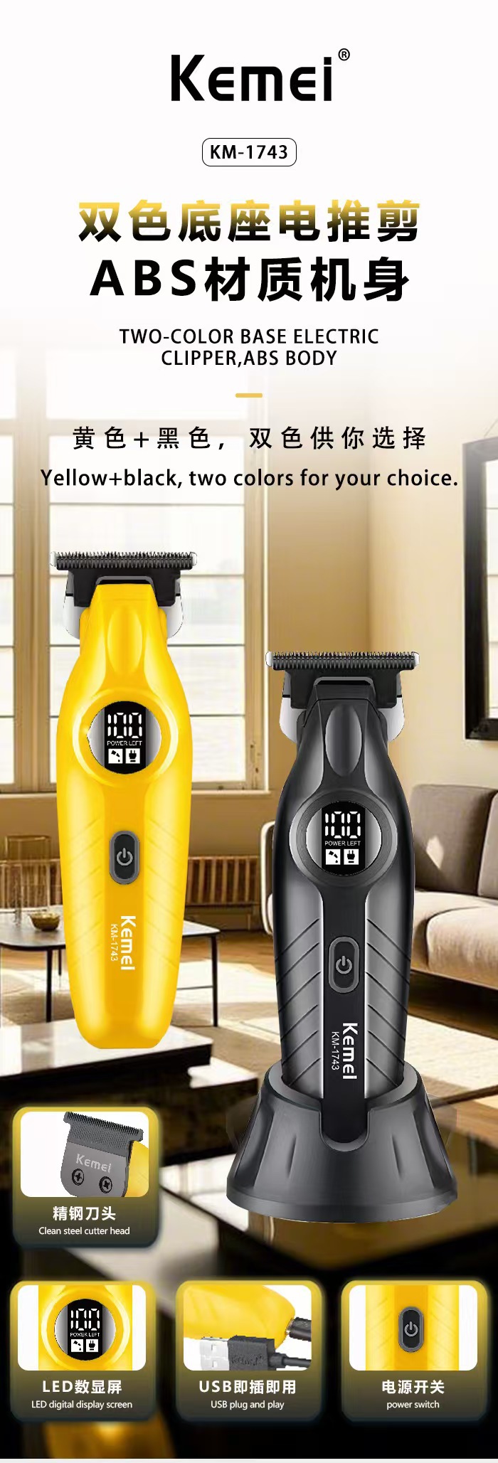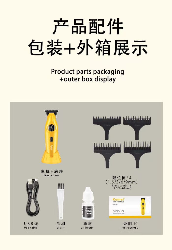 KM-1743 미용실 전문 전기 클리퍼 다기능 USB 베이스 전기 머리 깎기 고출력 면도기