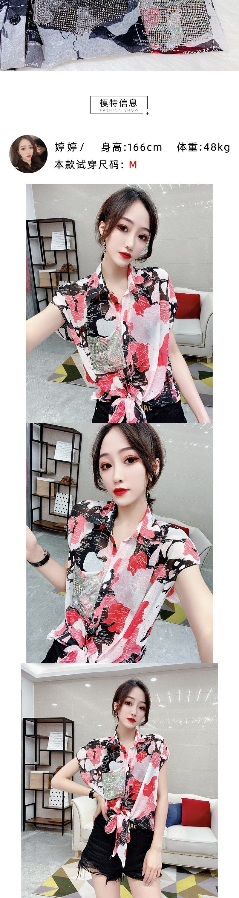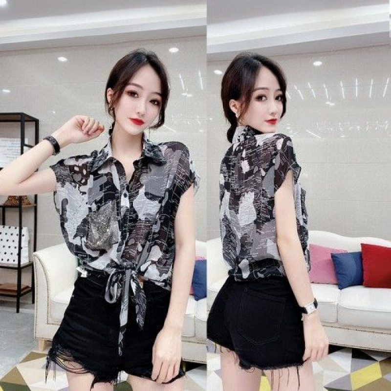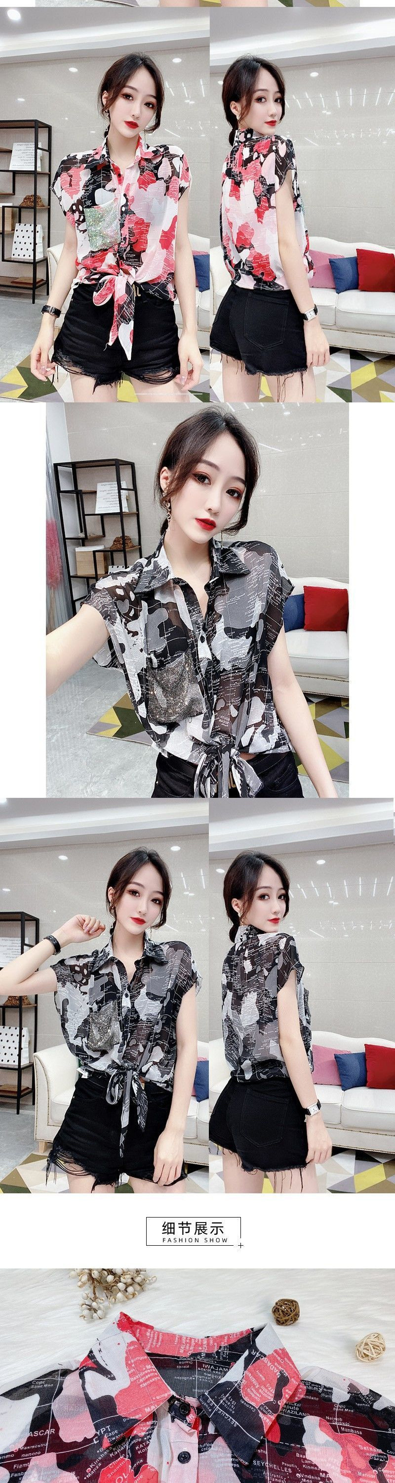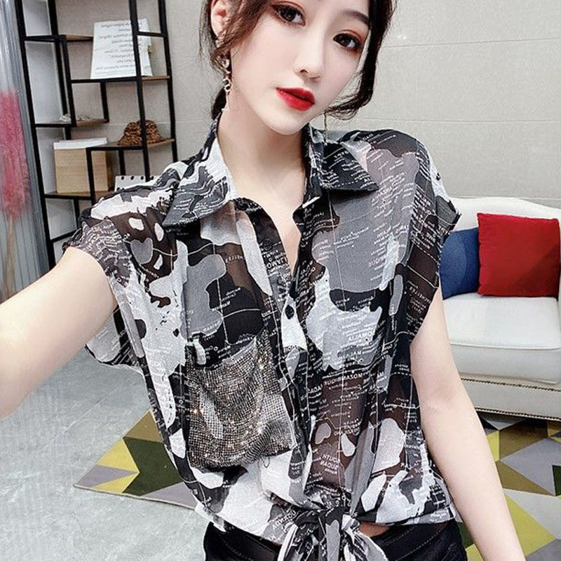쉬폰 셔츠 여성의 2025 여름 셔츠 새로운 패션 매듭 인쇄 짧은 소매 꽃 서양식 우아한 플러스 사이즈 탑스토어 가기