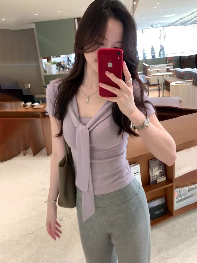 한국식 퍼플 숄더 반팔 티셔츠 여성 여름 디자인 센스 니스 레이스업 슬림핏 짧은 목도리 탑스토어 가기