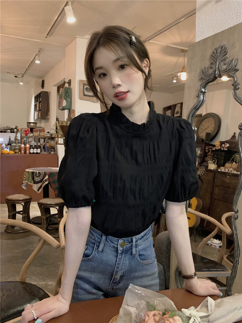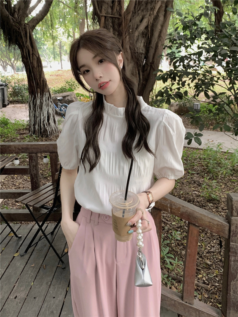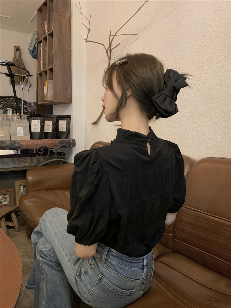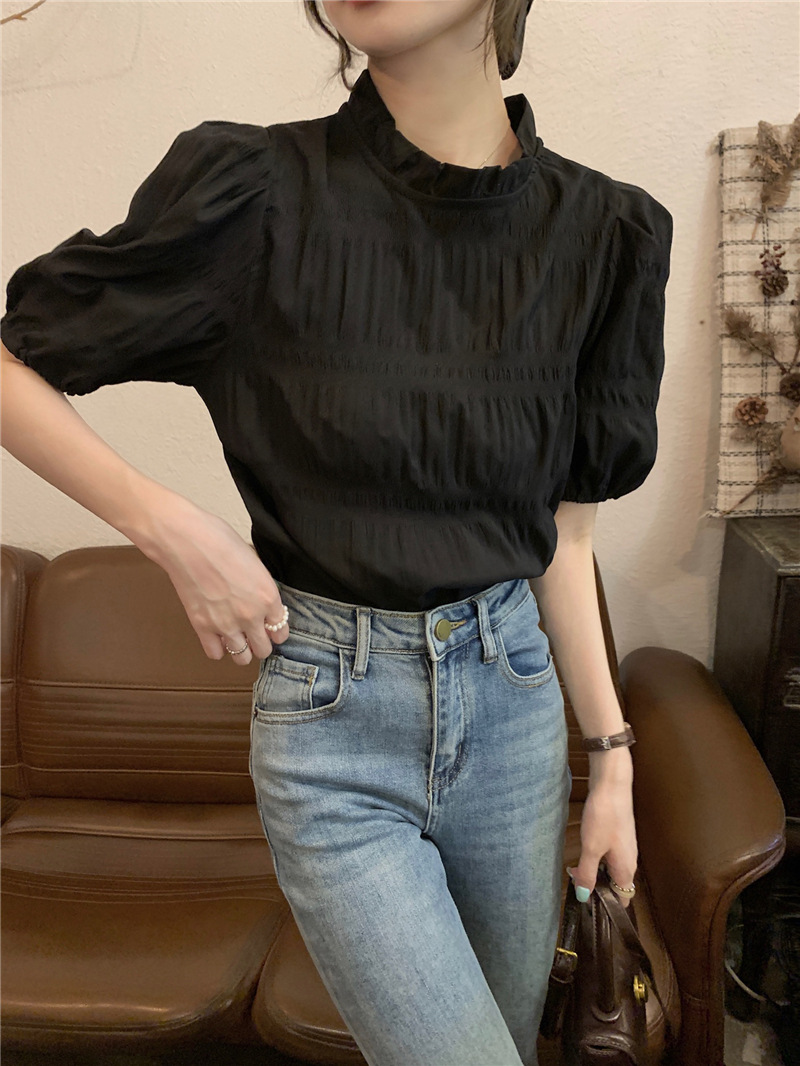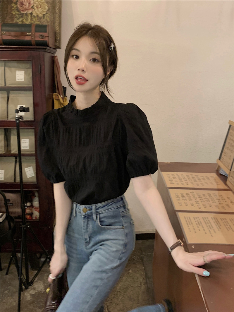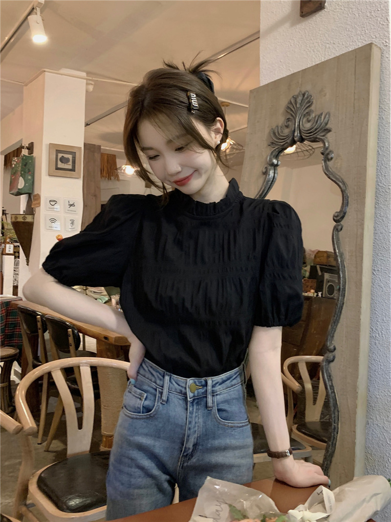 리얼 샷 심플 프렌치 플리츠 퍼프 슬리브 탑 여성용 레트로 니치 세련된 셔츠 루즈 셔츠 81287