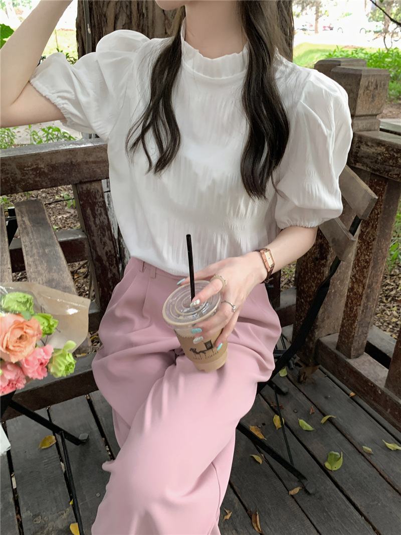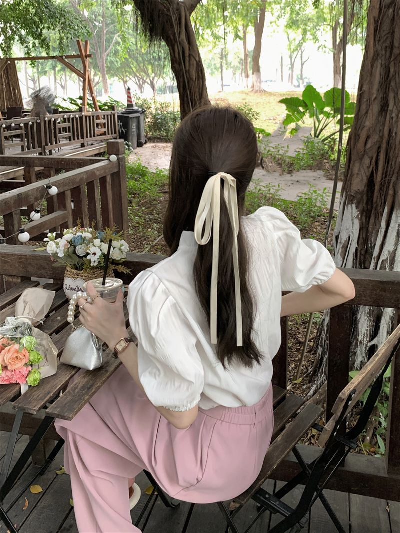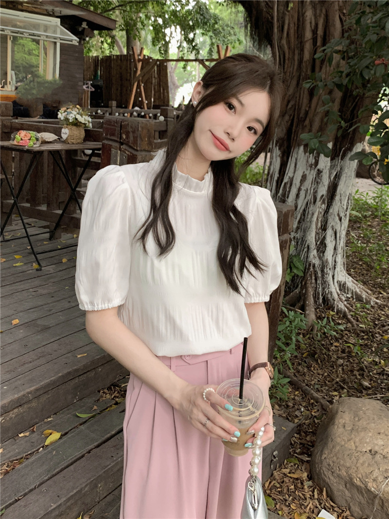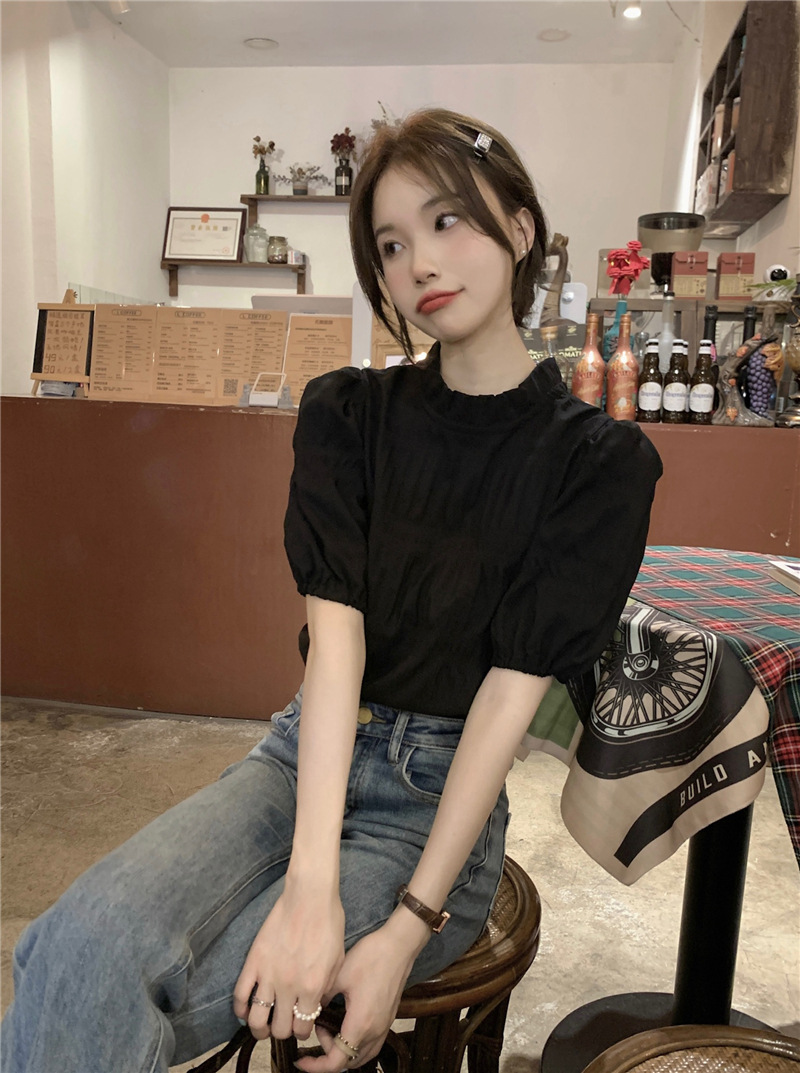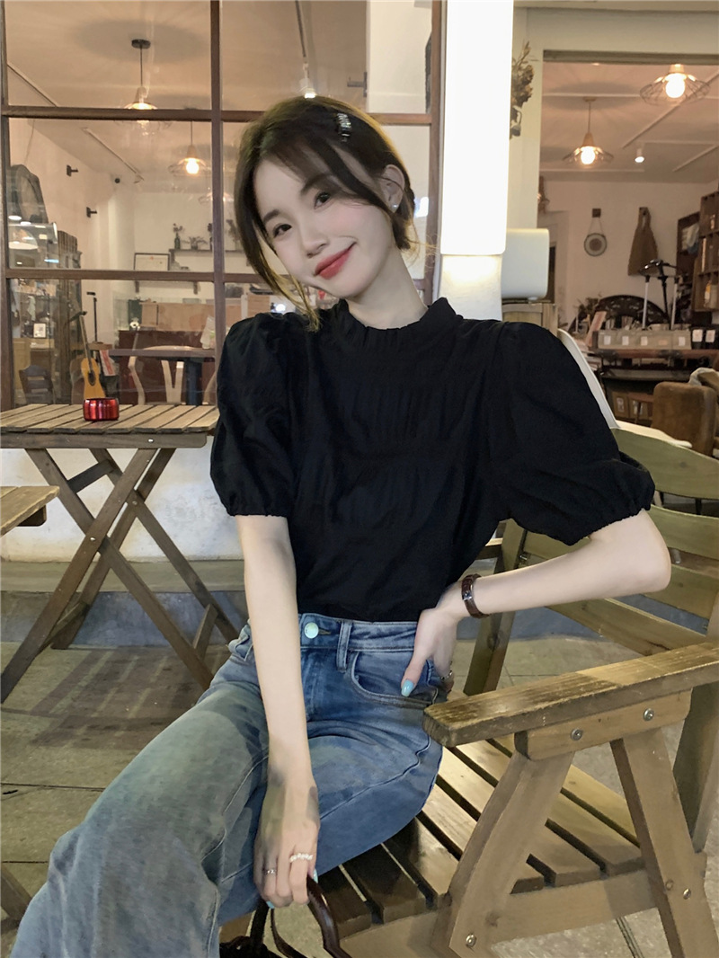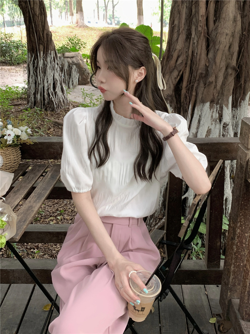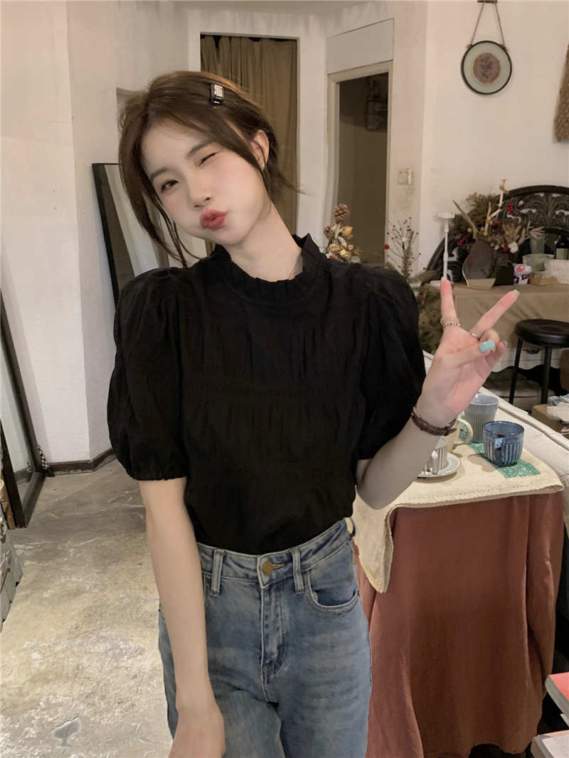 리얼 샷 심플 프렌치 플리츠 퍼프 슬리브 탑 여성용 레트로 니치 세련된 셔츠 루즈 셔츠 81287
