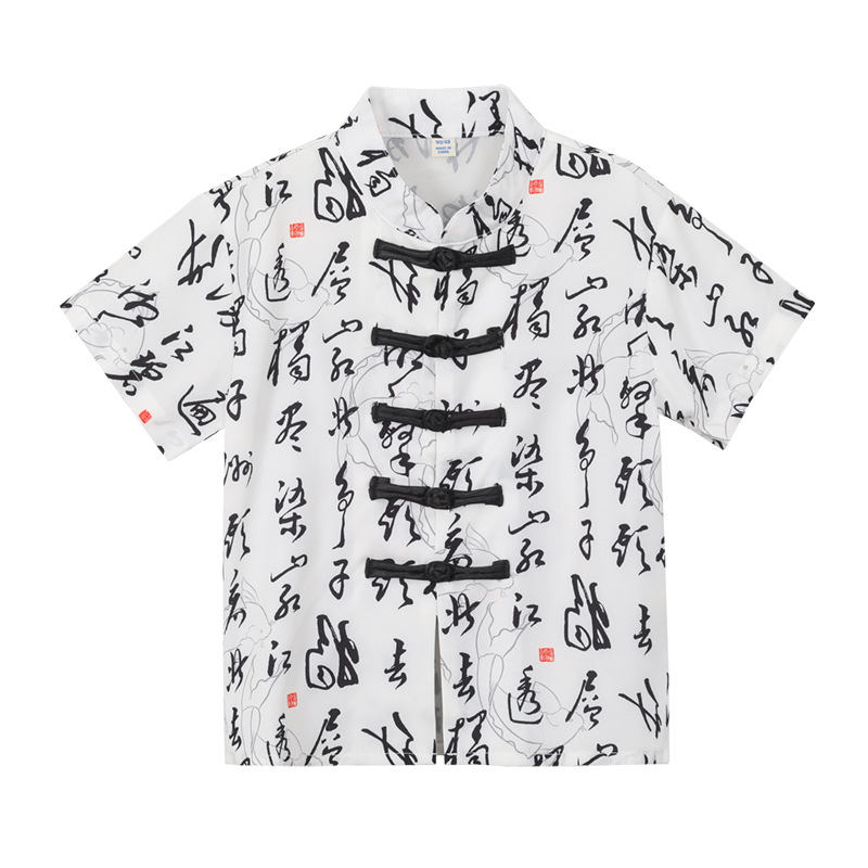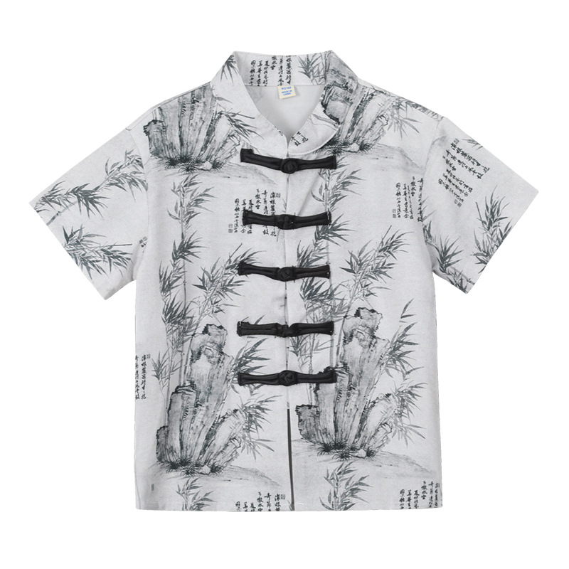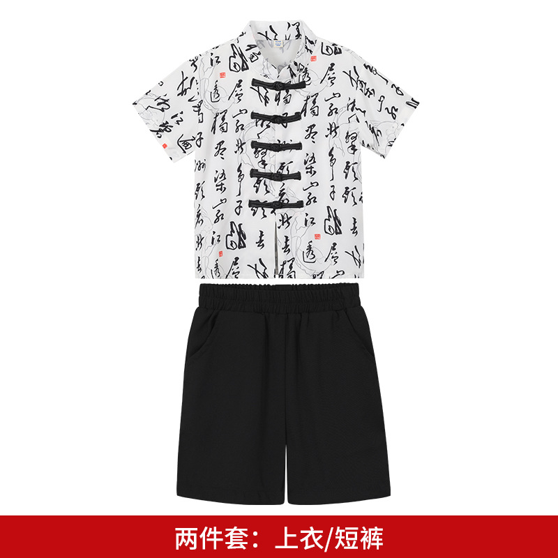 소년의 새로운 중국 스타일 공연 의상, 중국 스타일 Hanfu 어린이 날 공연 정장, 트렌디 한 반팔 수묵화 셔츠, 당나라 정장