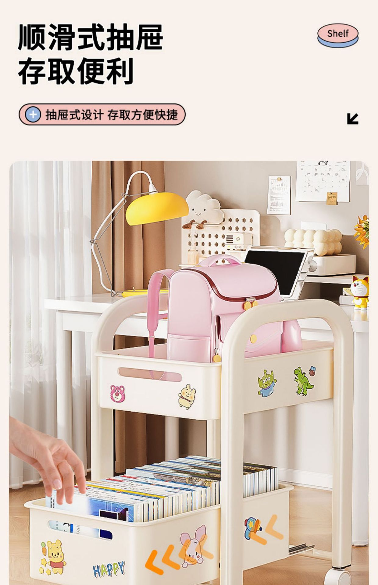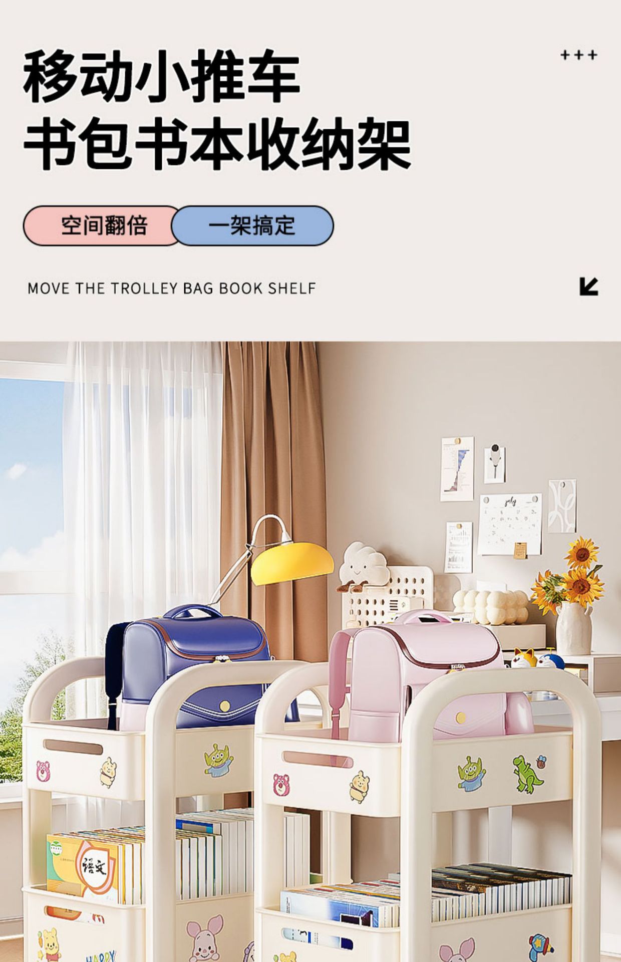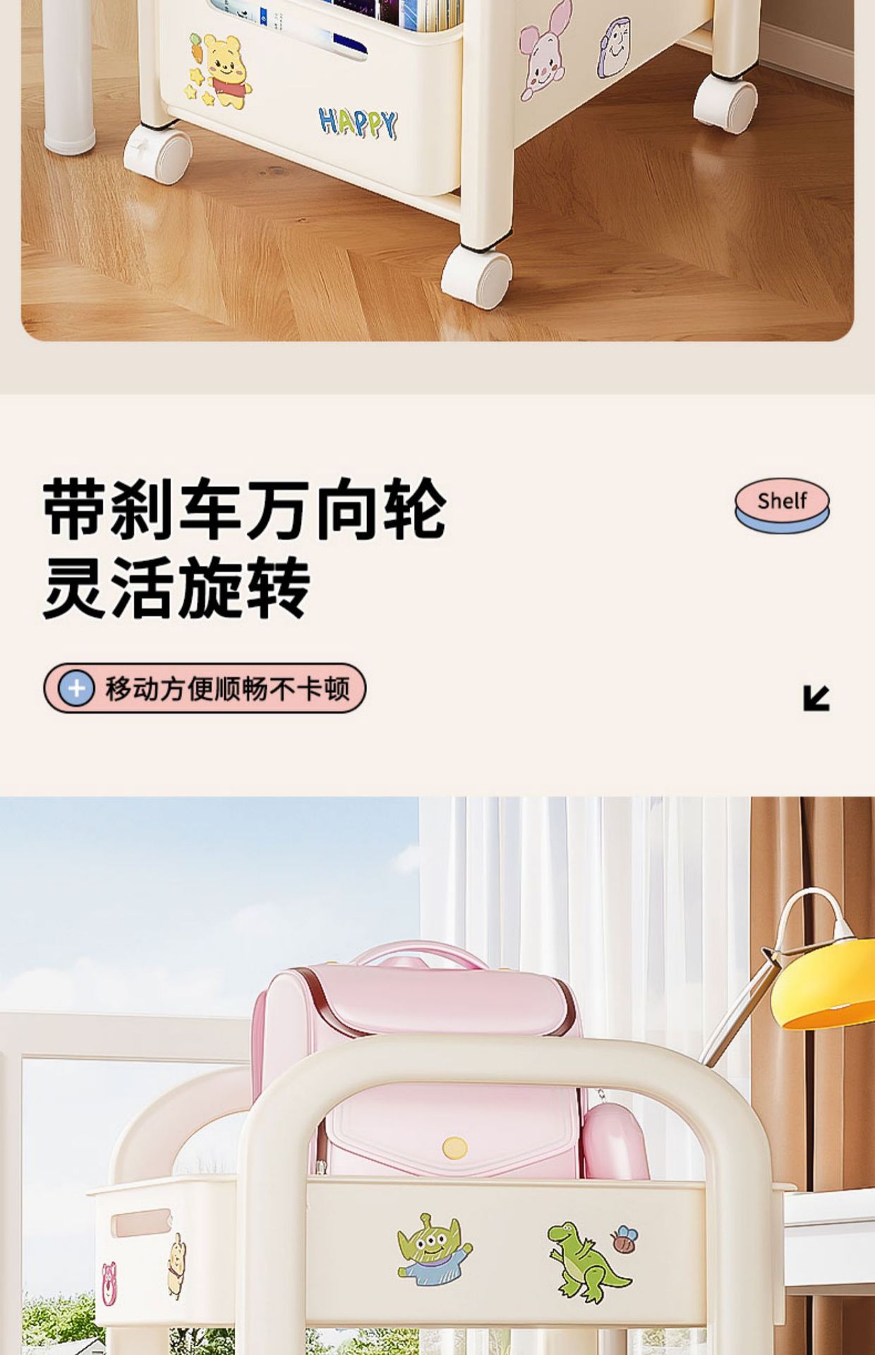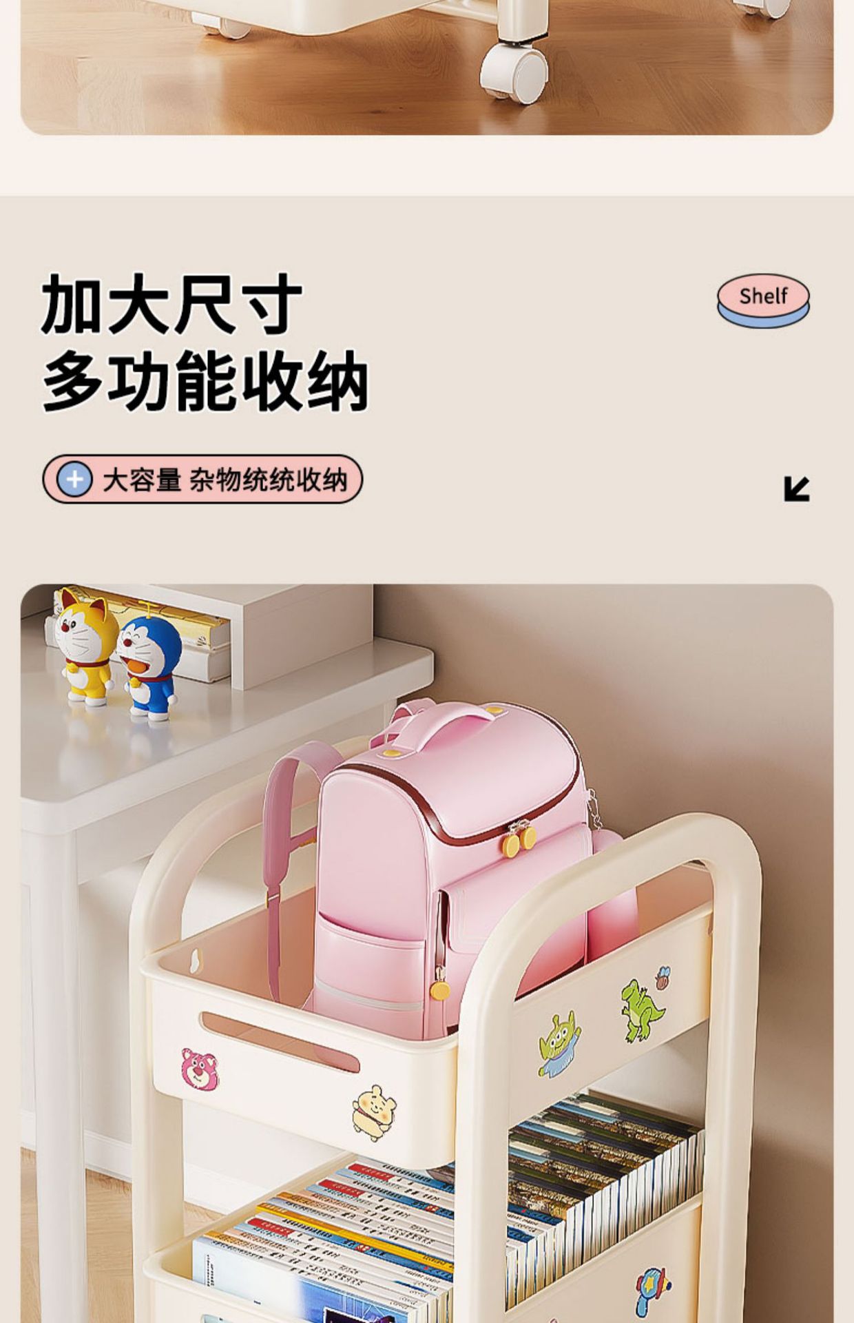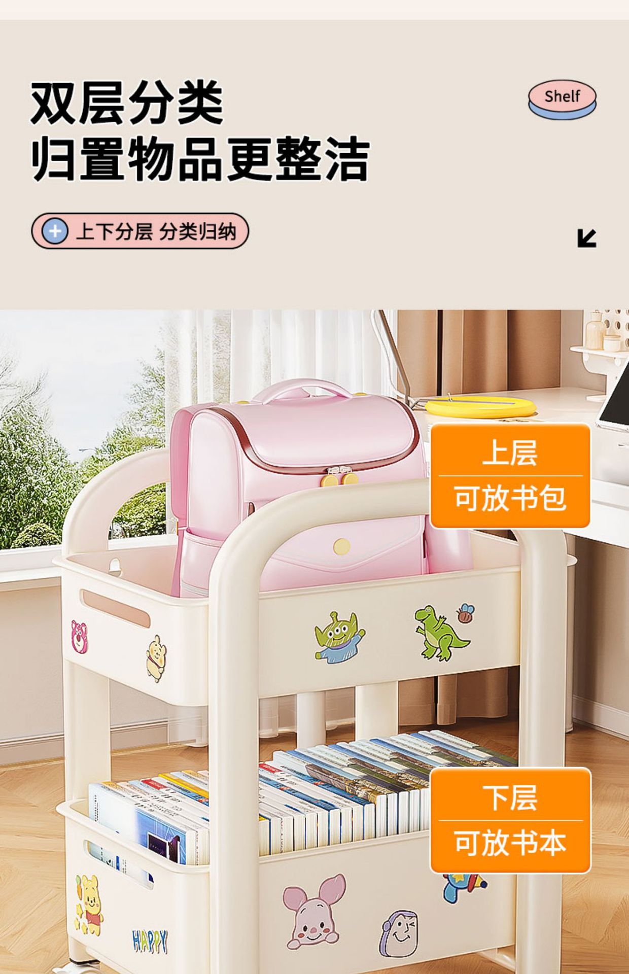 바퀴가 달린 Schoolbag 보관 랙 움직일 수있는 책상 바닥 카트 책 배치 랙 유물 책장 보관 캐비닛