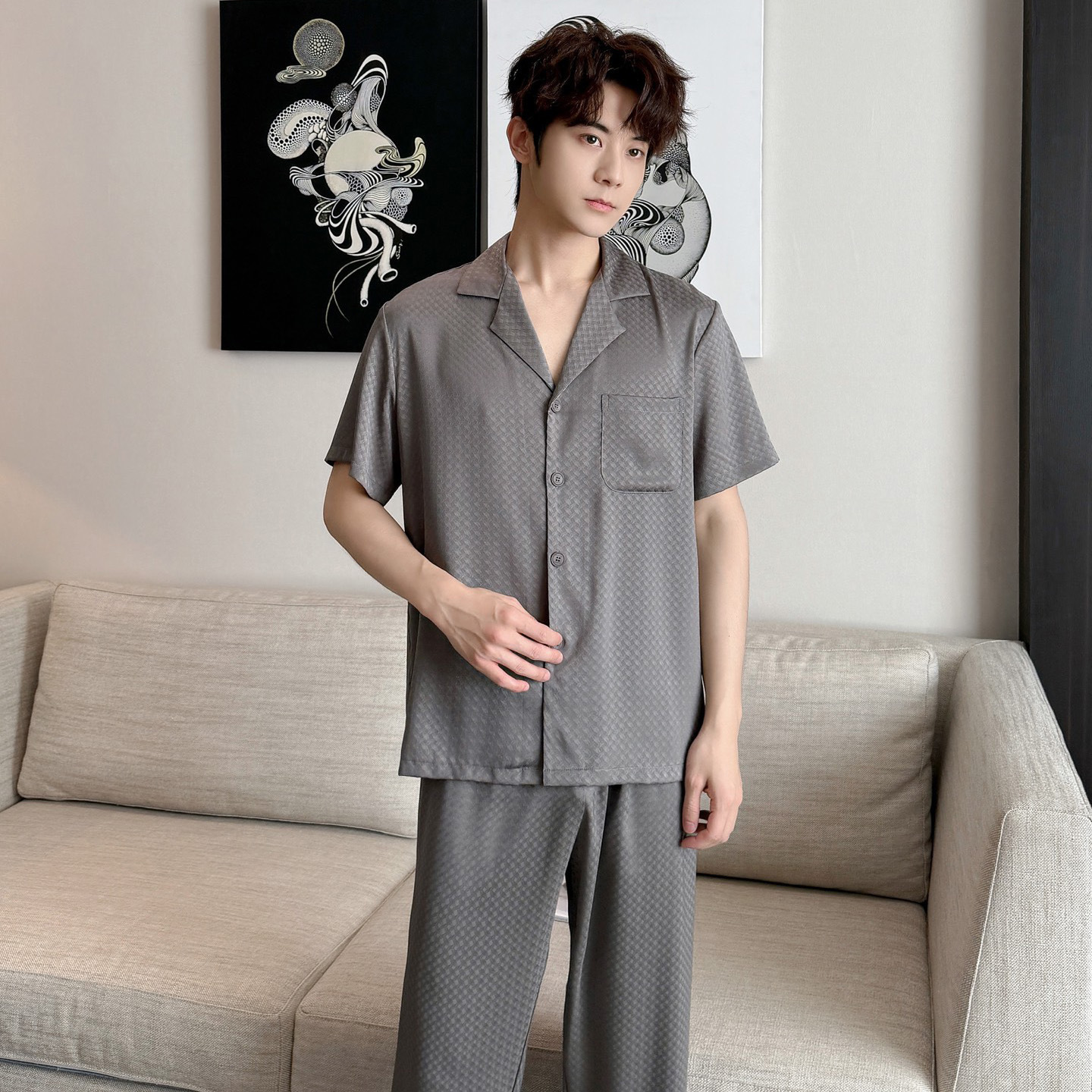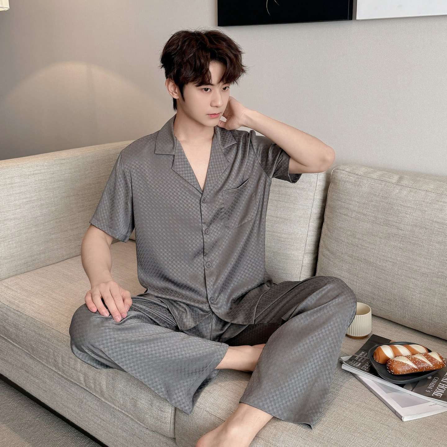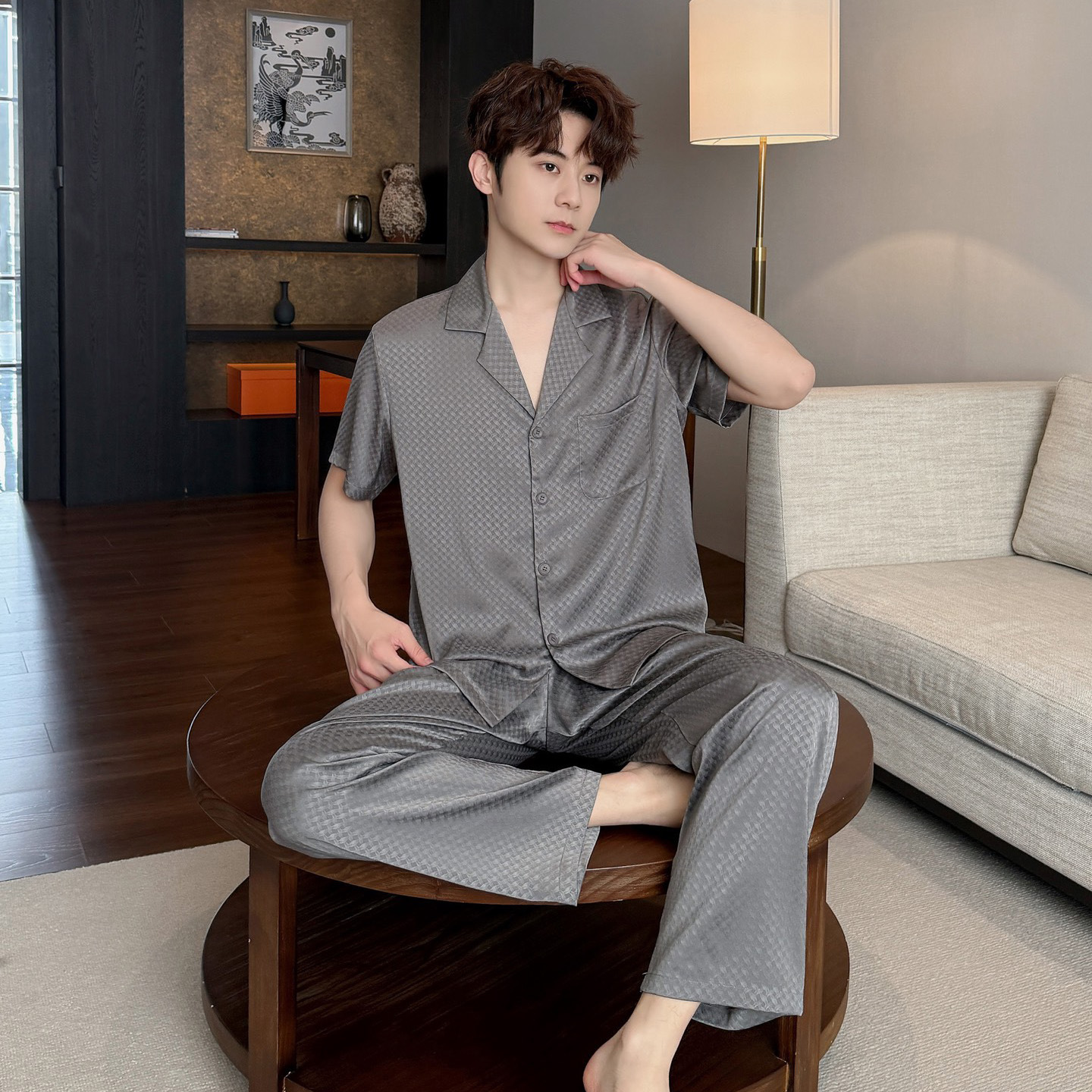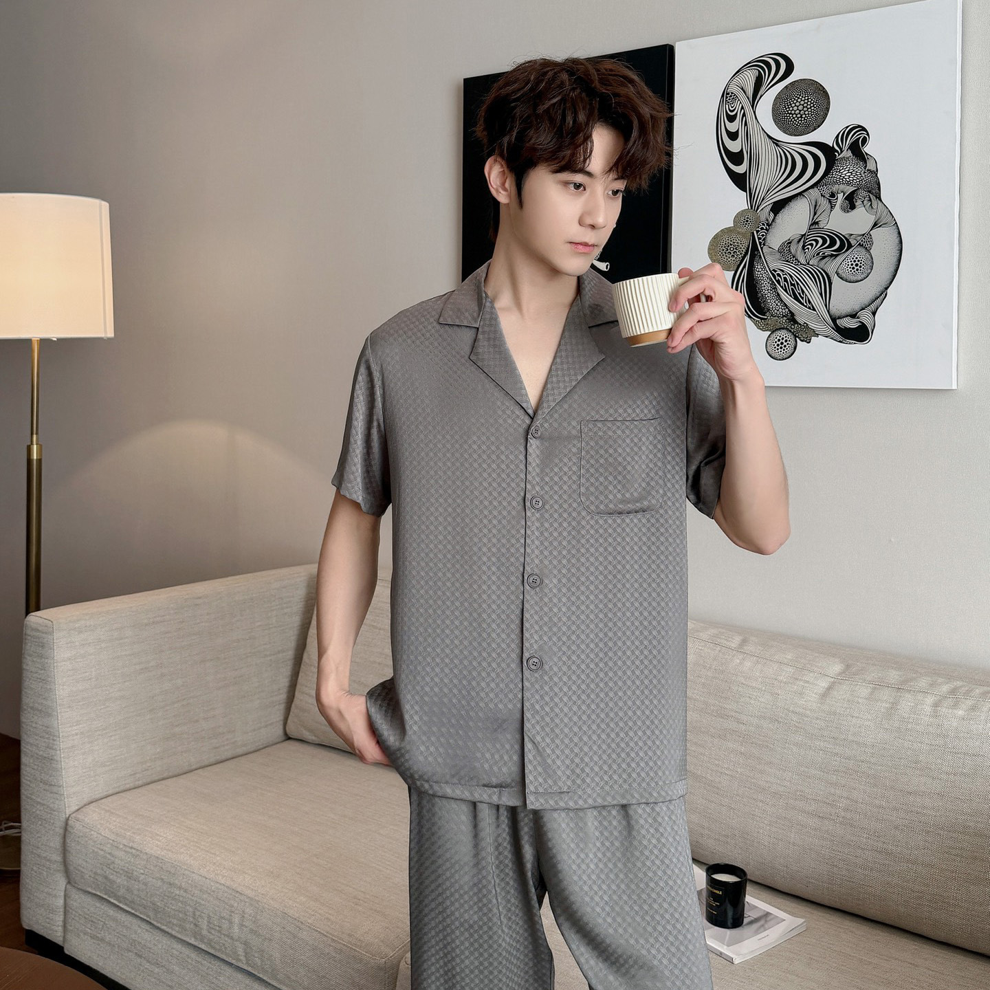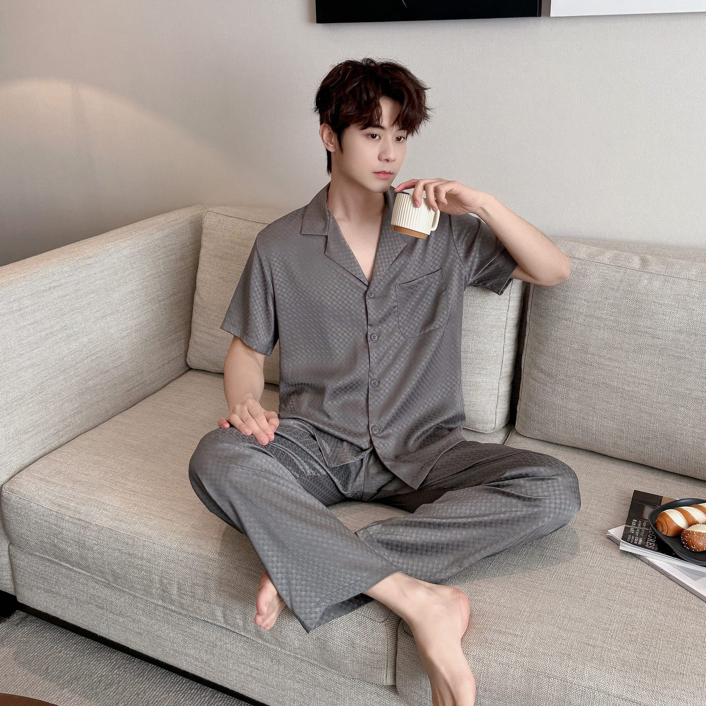 새로운 아세테이트 잠옷 남성 여름 얼음 실크 홈웨어 얇은 반팔 고급 홈웨어 세트는 밖에서 착용 가능