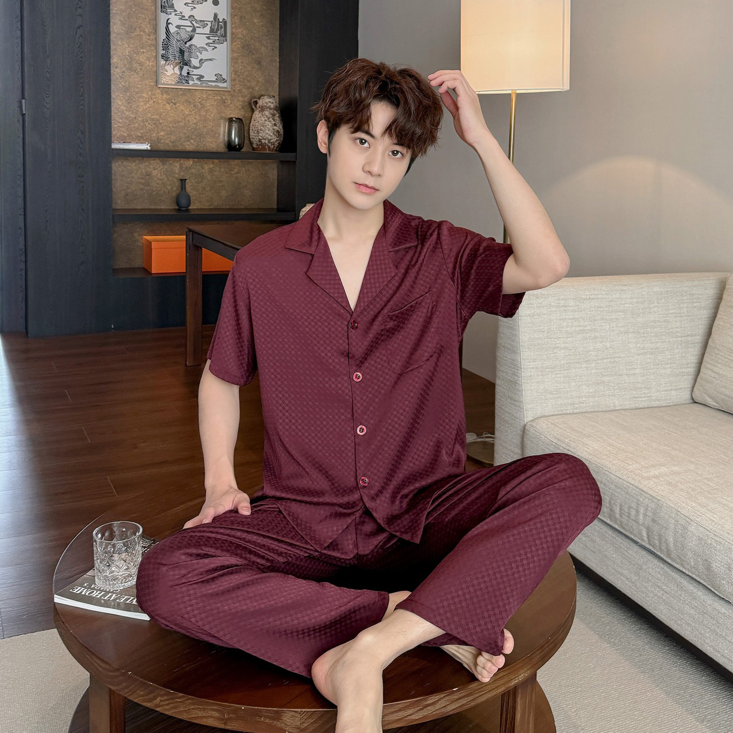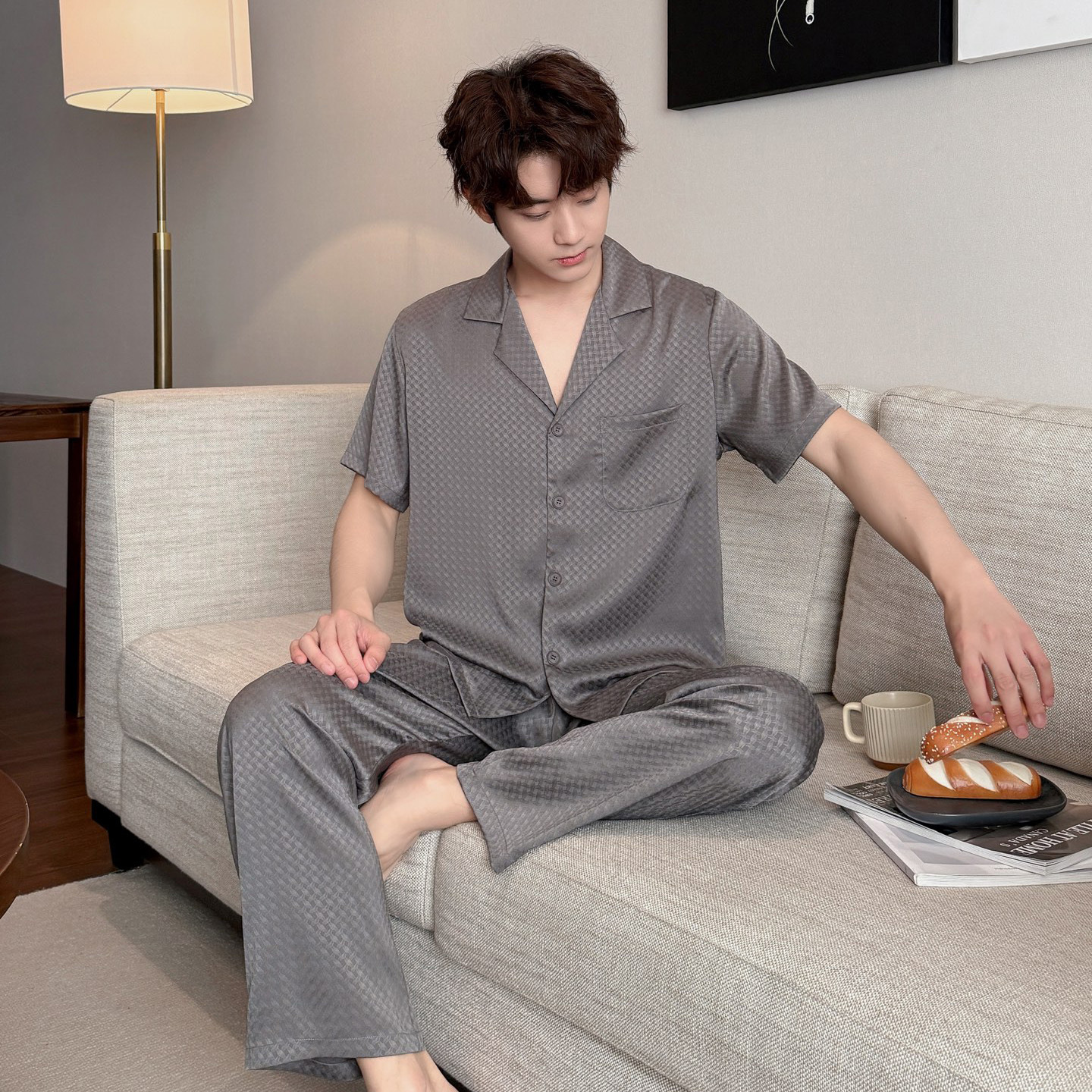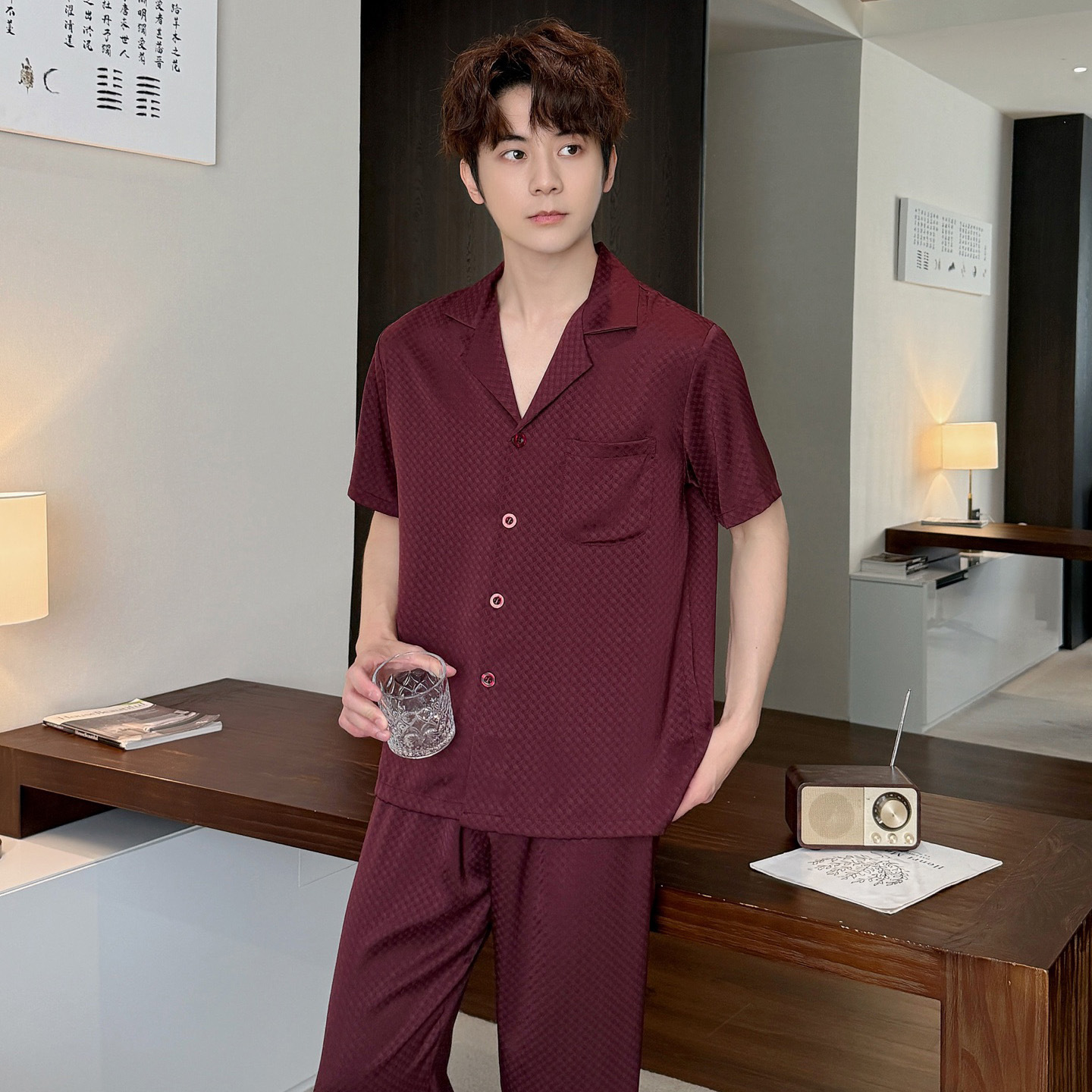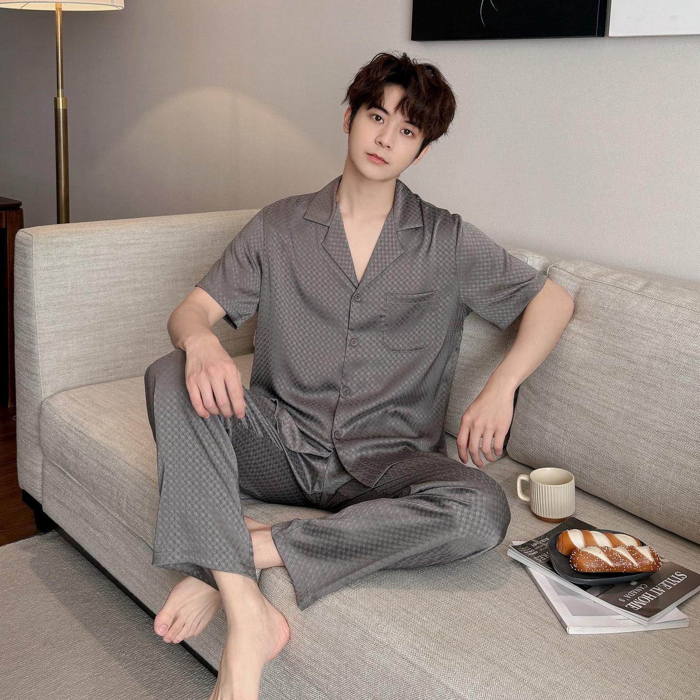 새로운 아세테이트 잠옷 남성 여름 얼음 실크 홈웨어 얇은 반팔 고급 홈웨어 세트는 밖에서 착용 가능