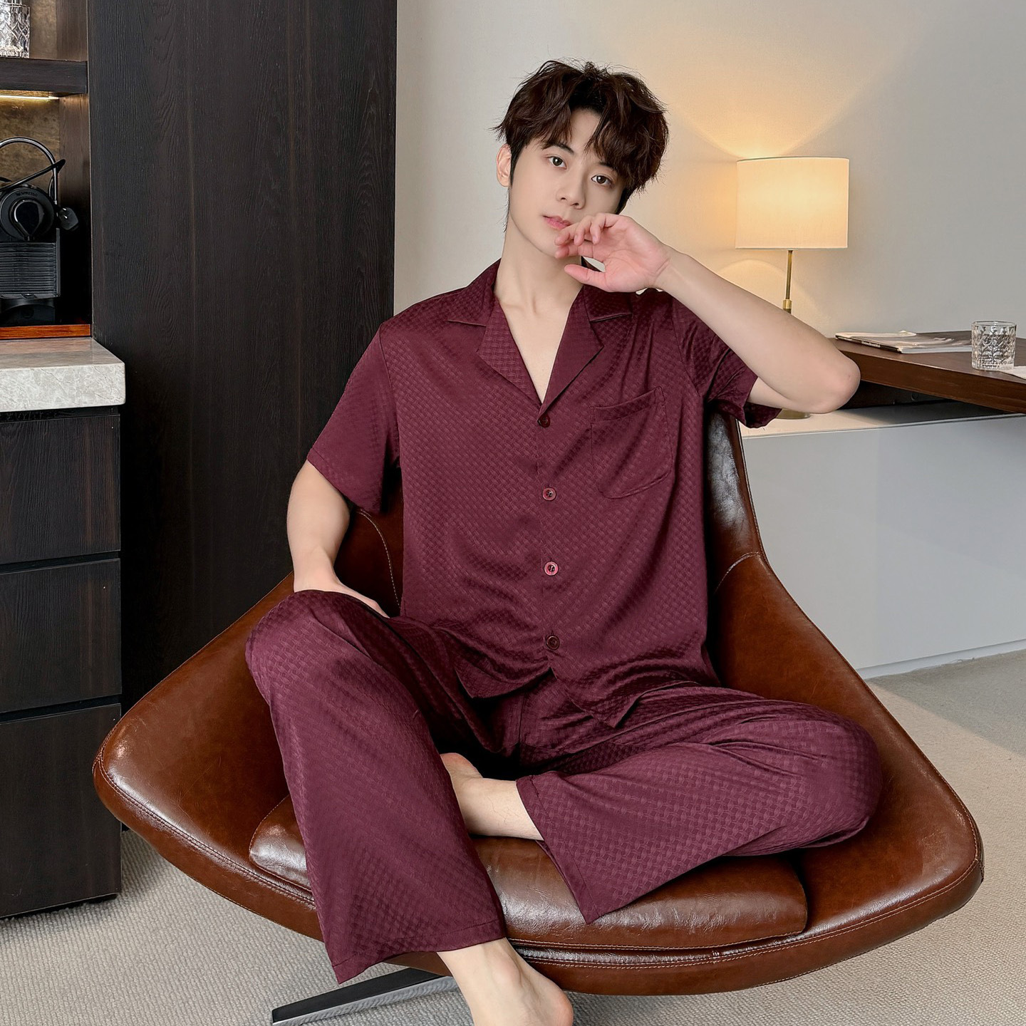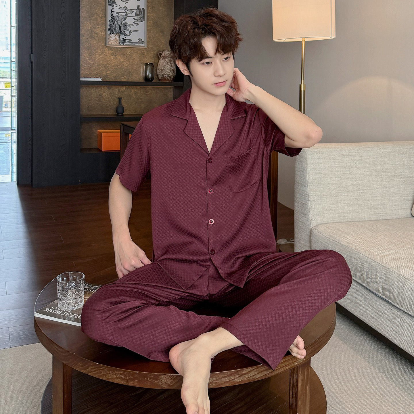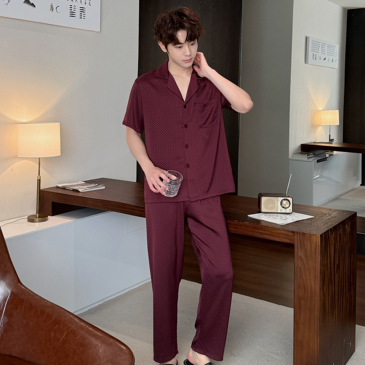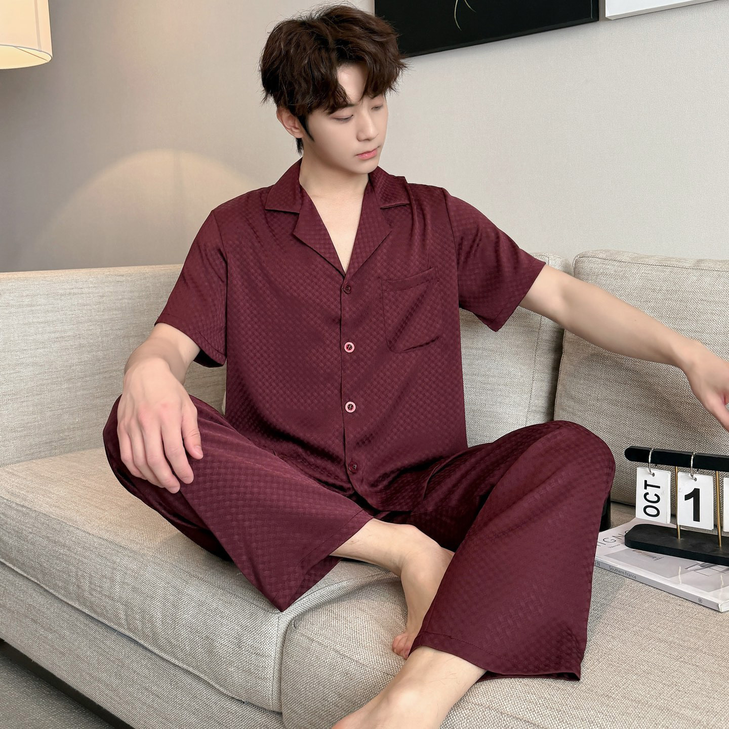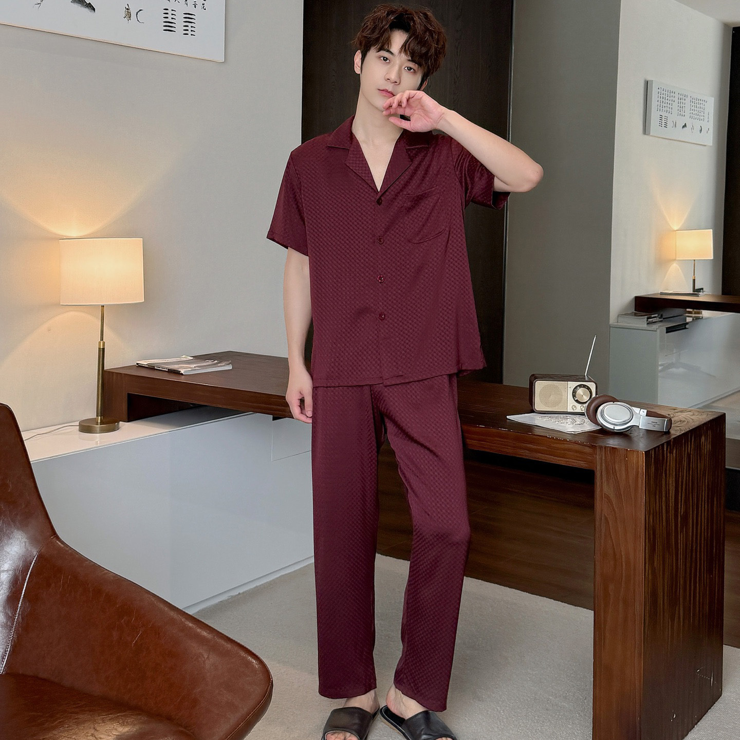 새로운 아세테이트 잠옷 남성 여름 얼음 실크 홈웨어 얇은 반팔 고급 홈웨어 세트는 밖에서 착용 가능