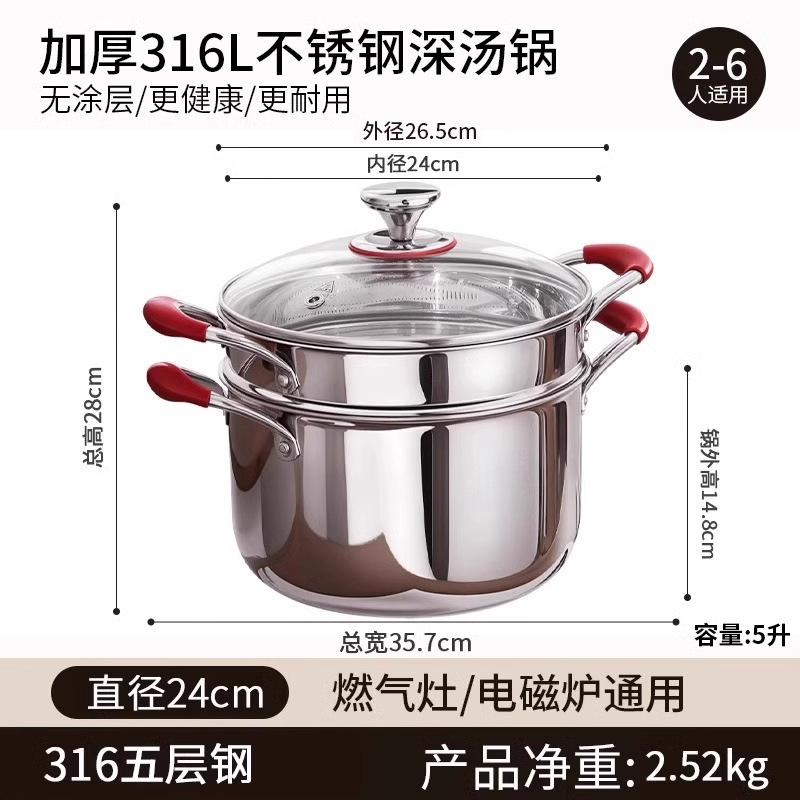 • 316 5단 스틸 스트레이트 냄비 + 스팀 그리드(빨간색 손잡이) 24cm