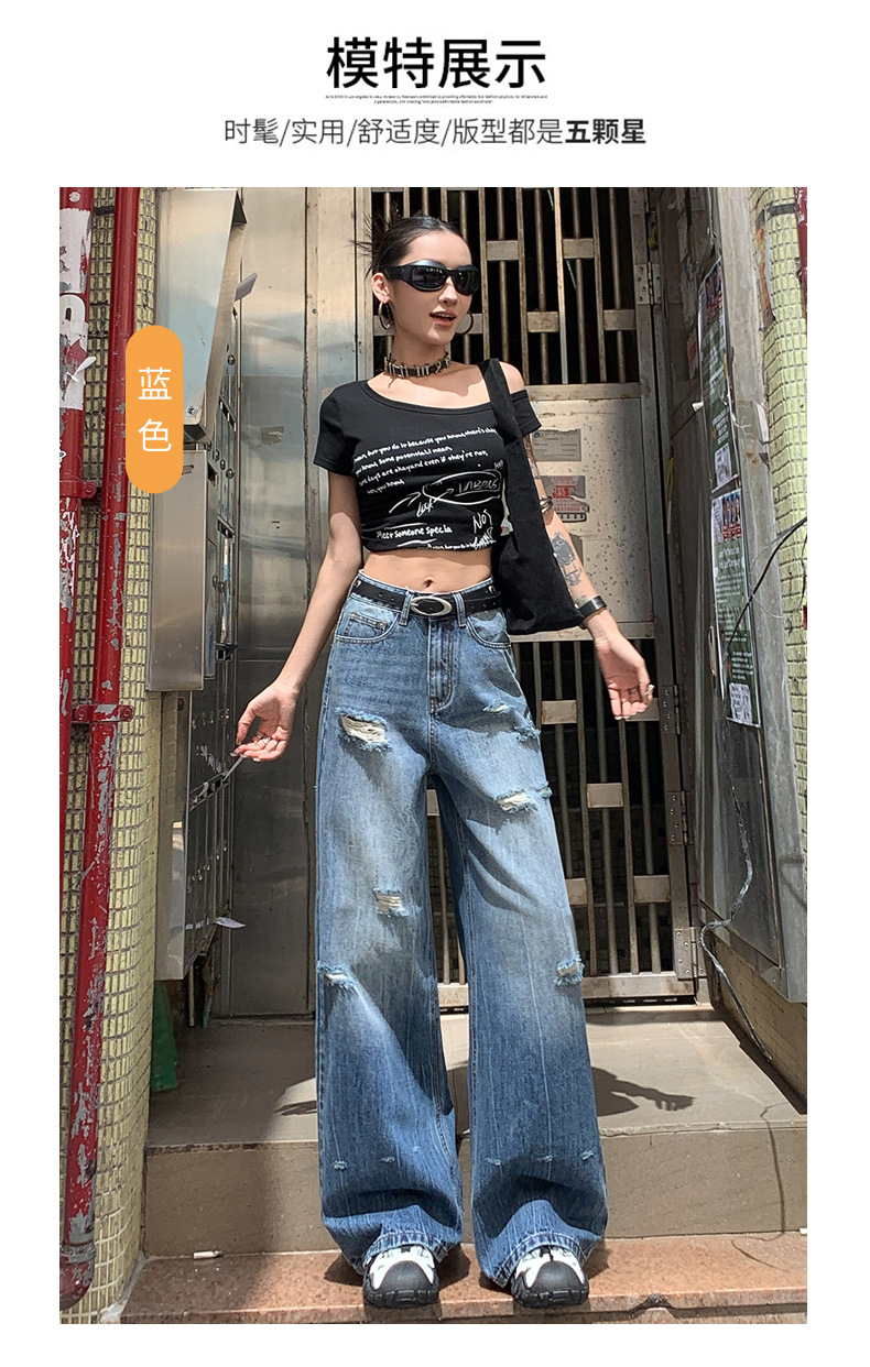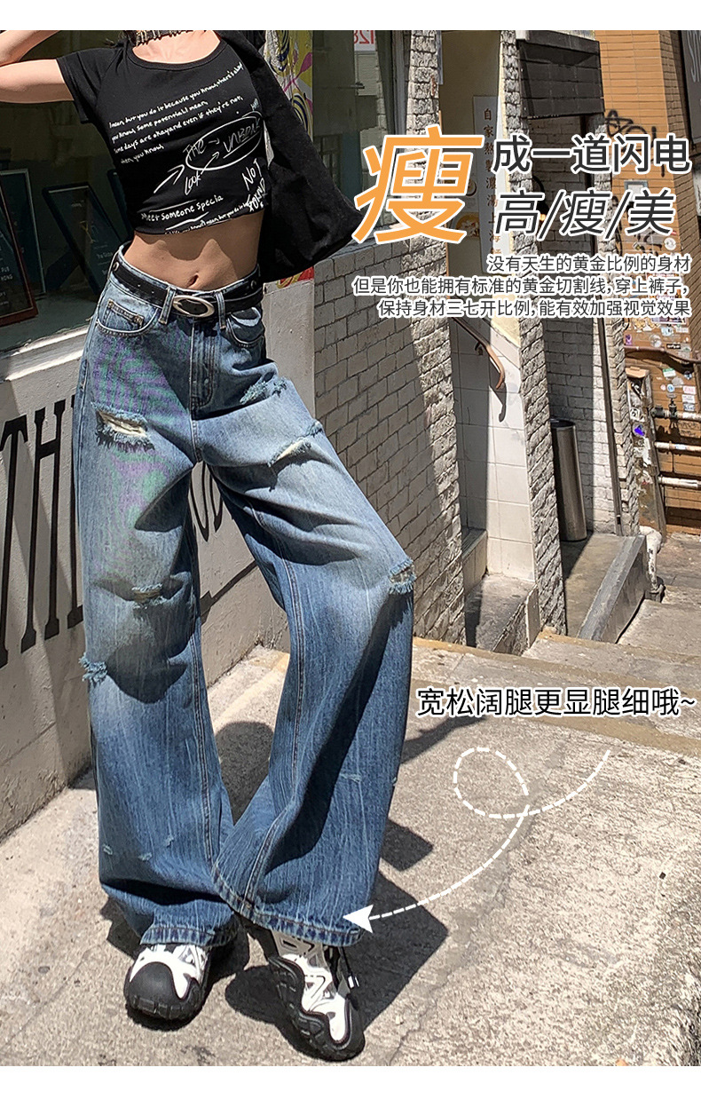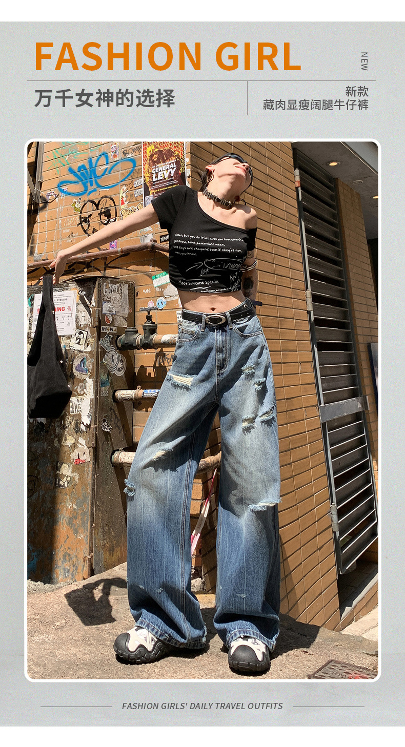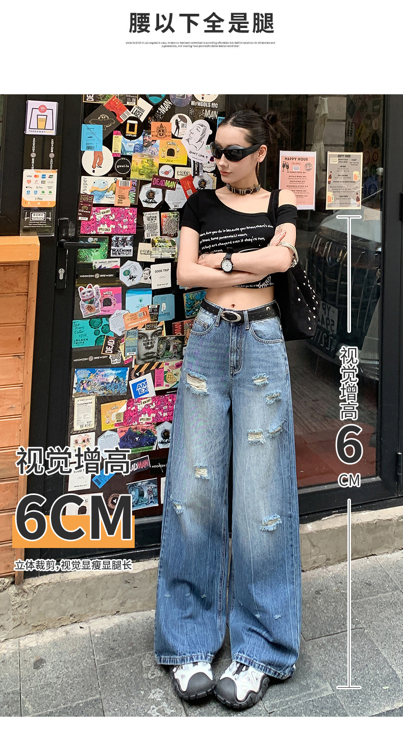 아메리칸 스타일 하이 스트리트 리핑 청바지 여자 2025 새로운 하이 웨이스트 슬리밍 루즈 와이드 레그 팬츠 패션 올 매치 팝 바지스토어 가기