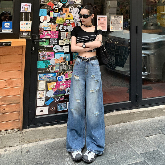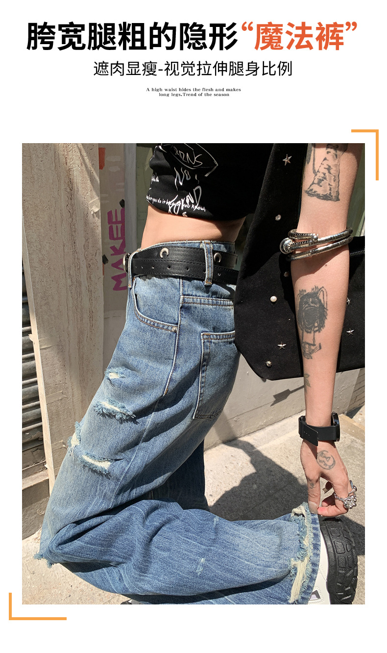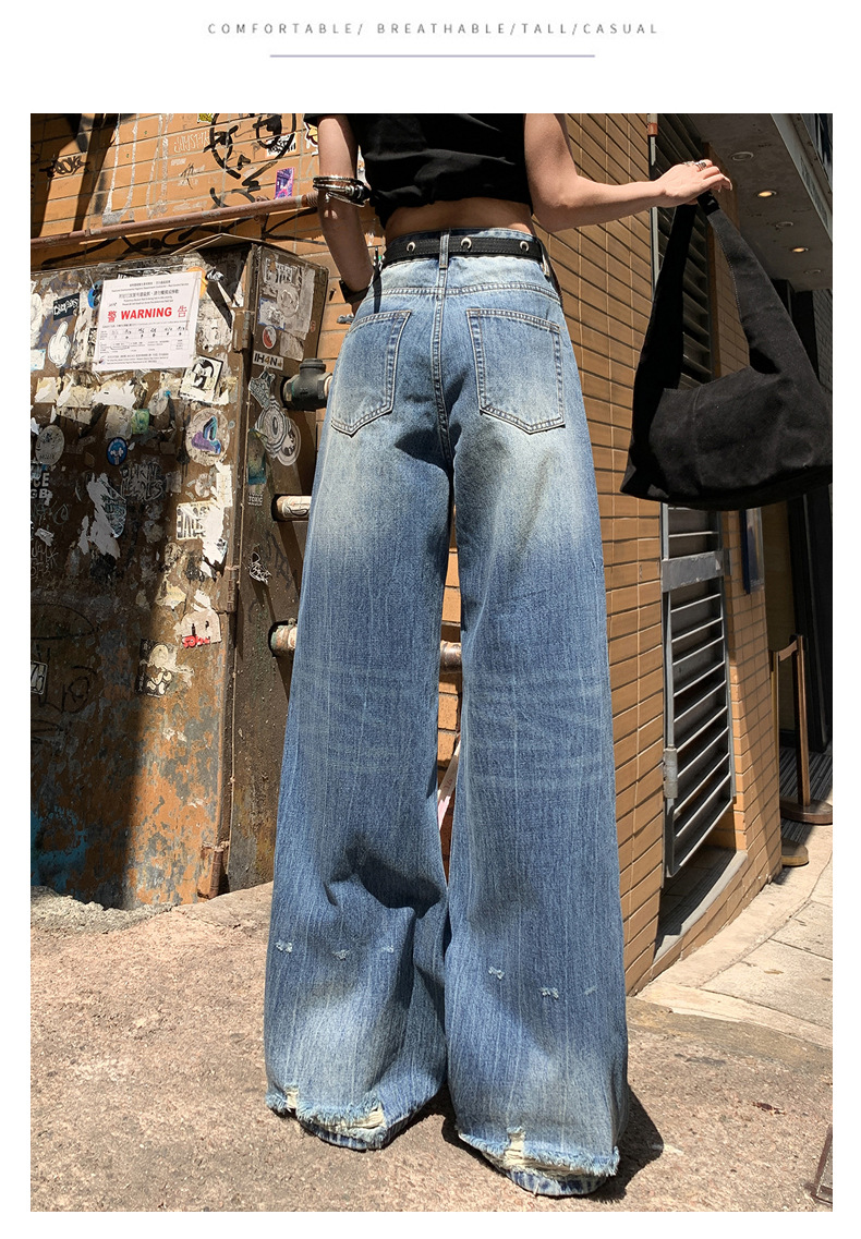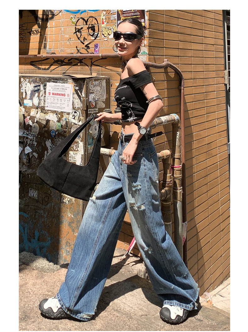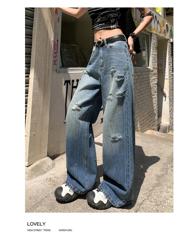 아메리칸 스타일 하이 스트리트 리핑 청바지 여자 2025 새로운 하이 웨이스트 슬리밍 루즈 와이드 레그 팬츠 패션 올 매치 팝 바지스토어 가기