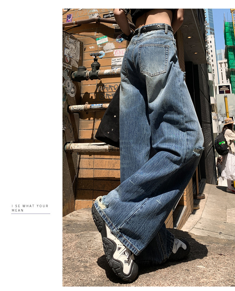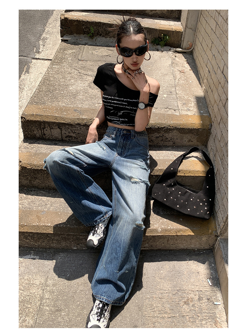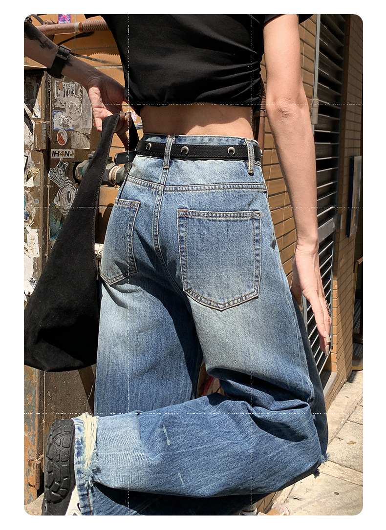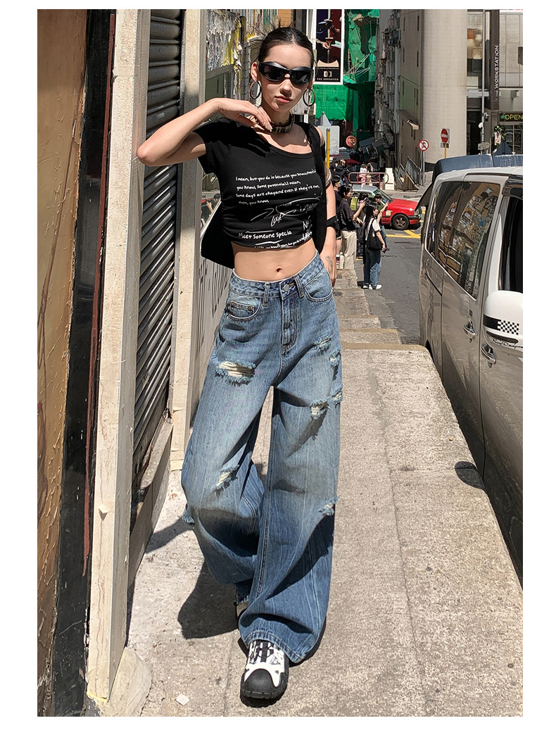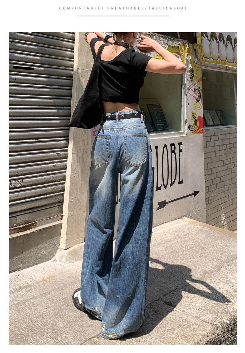 아메리칸 스타일 하이 스트리트 리핑 청바지 여자 2025 새로운 하이 웨이스트 슬리밍 루즈 와이드 레그 팬츠 패션 올 매치 팝 바지스토어 가기