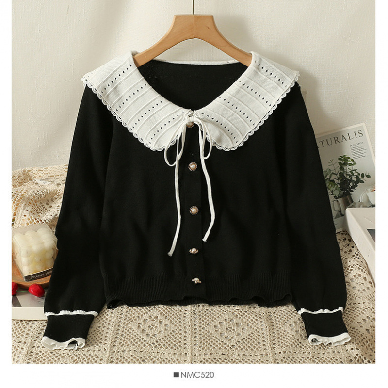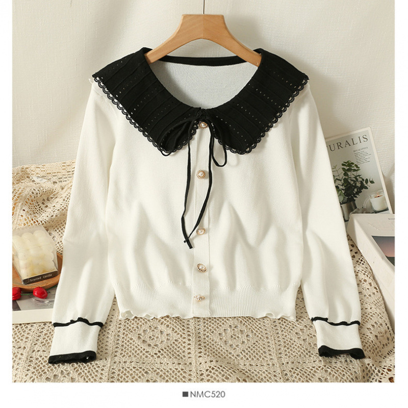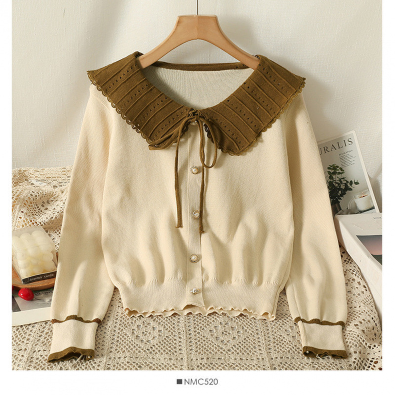 여성을위한 대비 색 인형 칼라 니트 바닥 셔츠 가을, 겨울 새로운 짧은 긴팔 슬림 탑 여성 셔츠