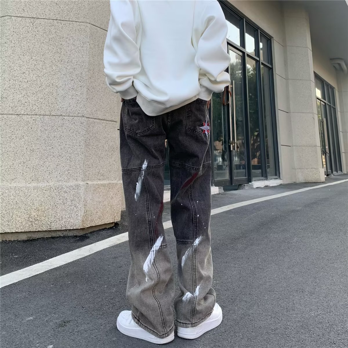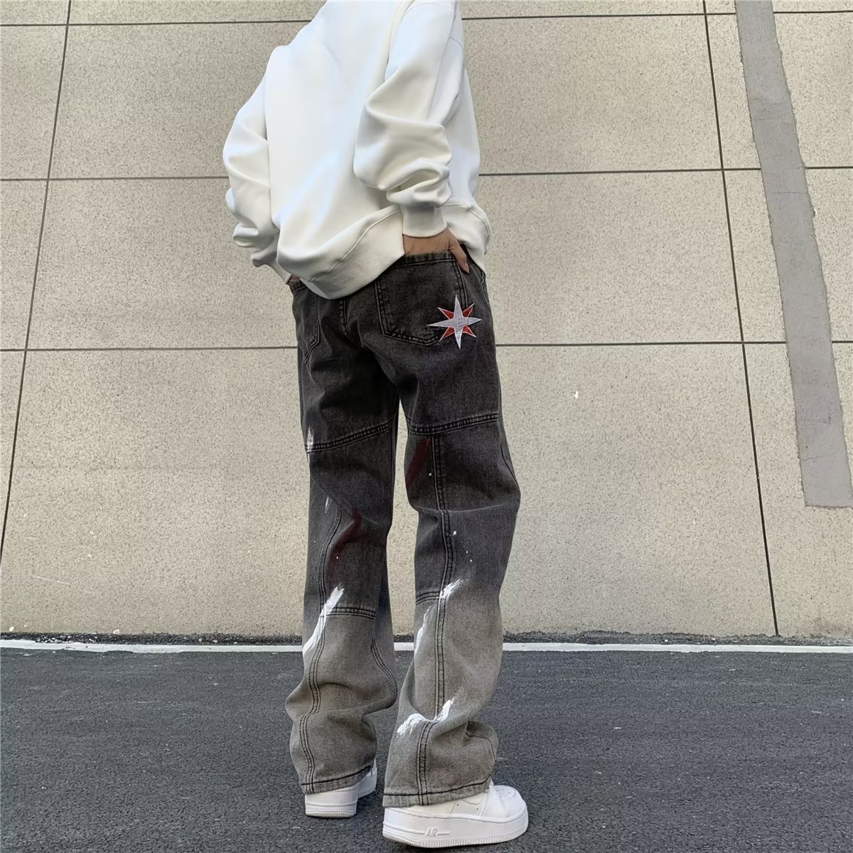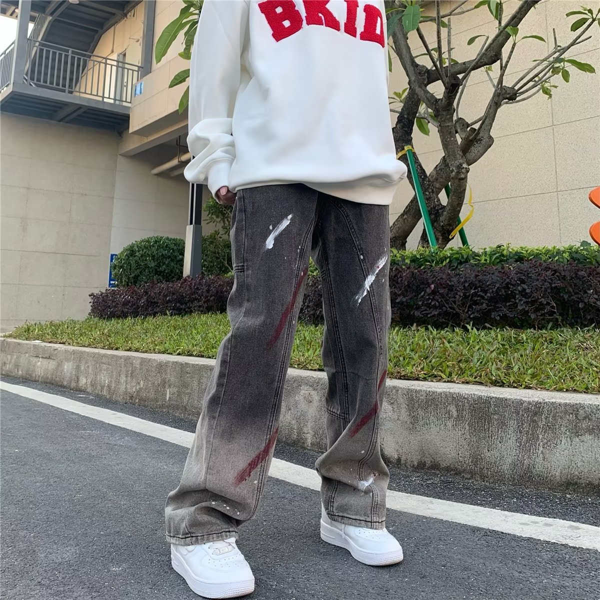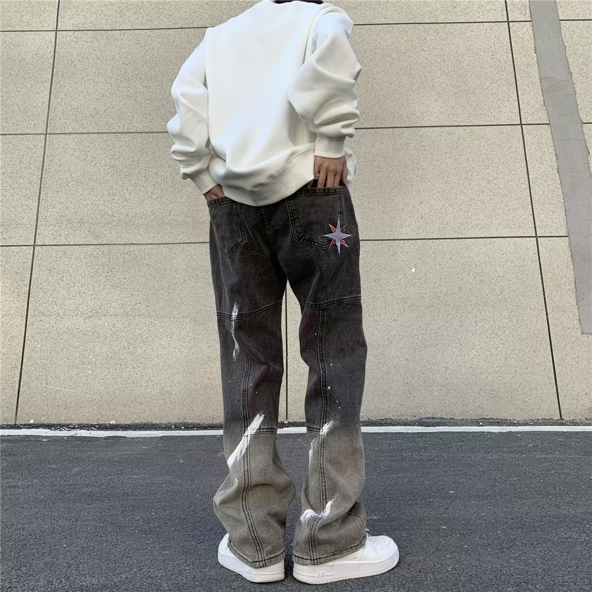 유럽과 미국의 하이 스트리트 힙합 청바지 남성 힙합 스트리트 작업복 스트레이트 팬츠 블랙 그레이 그라데이션 스플래시 잉크 팬츠스토어 가기