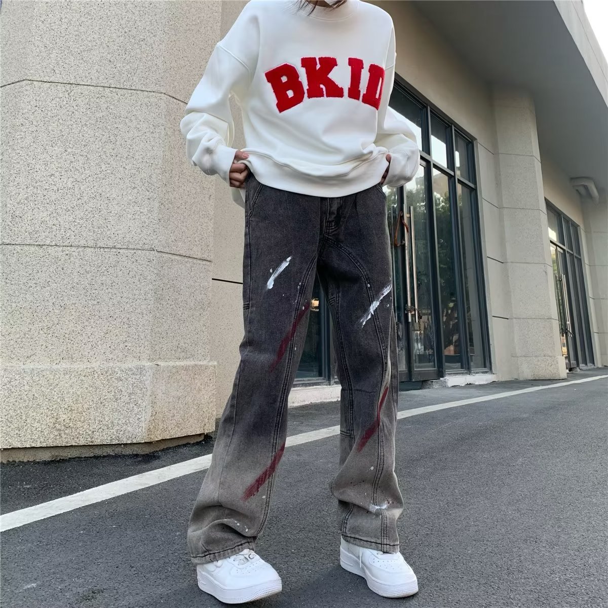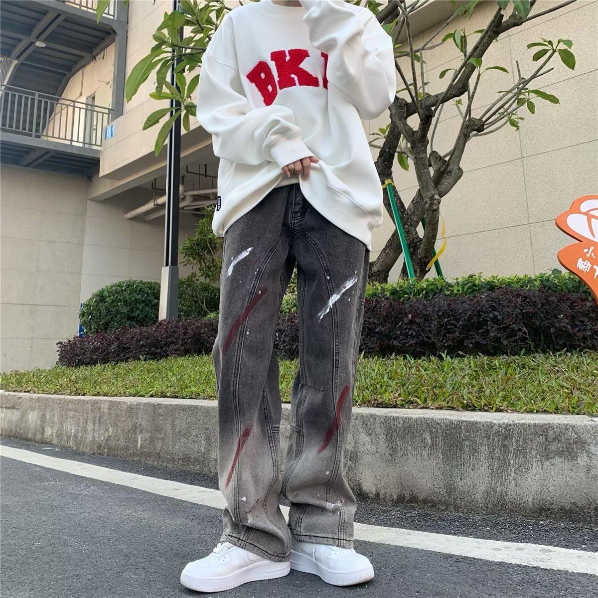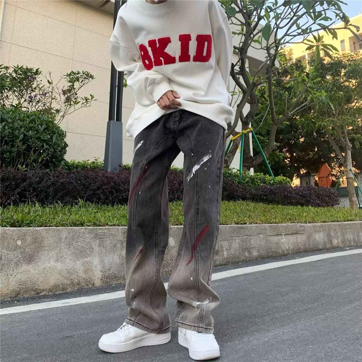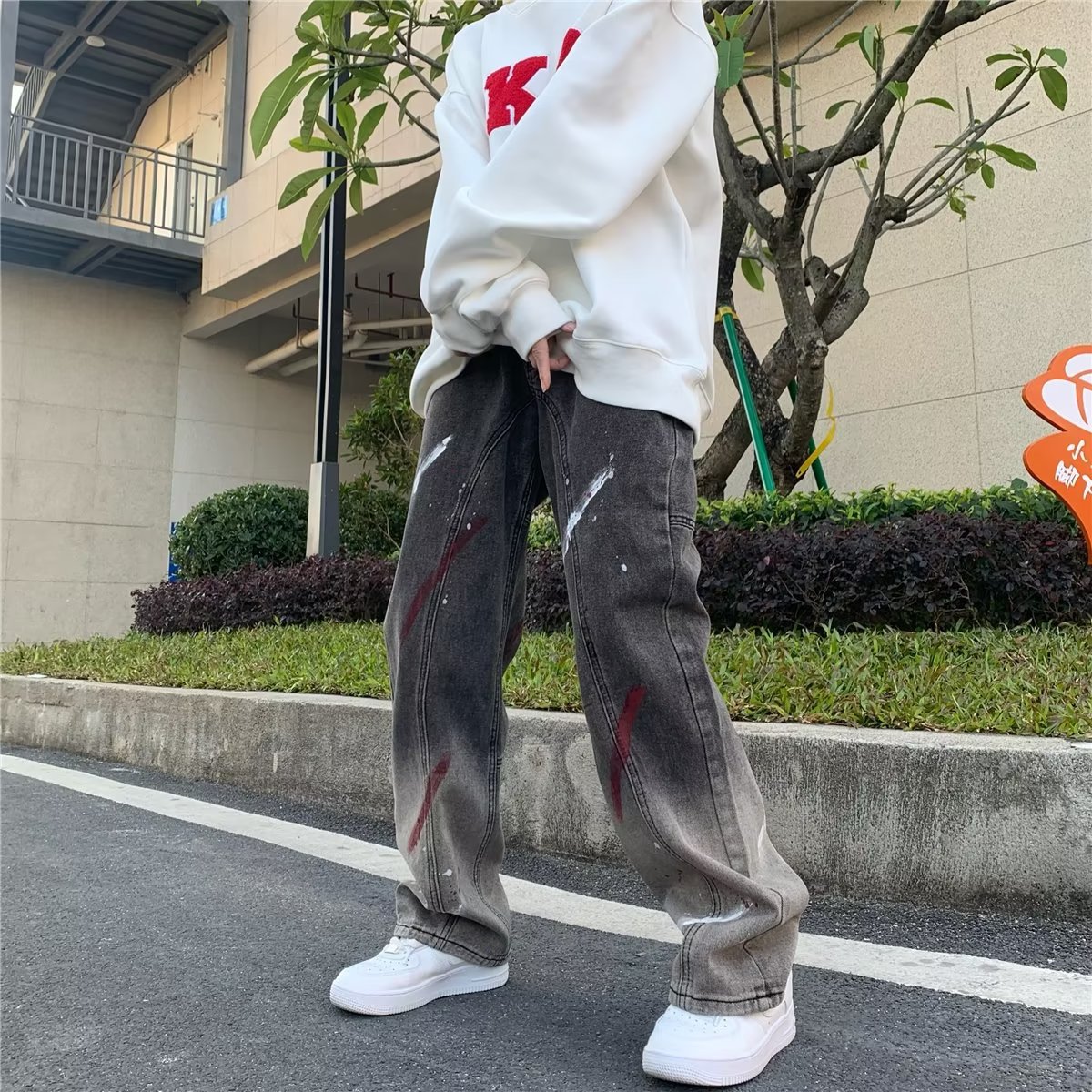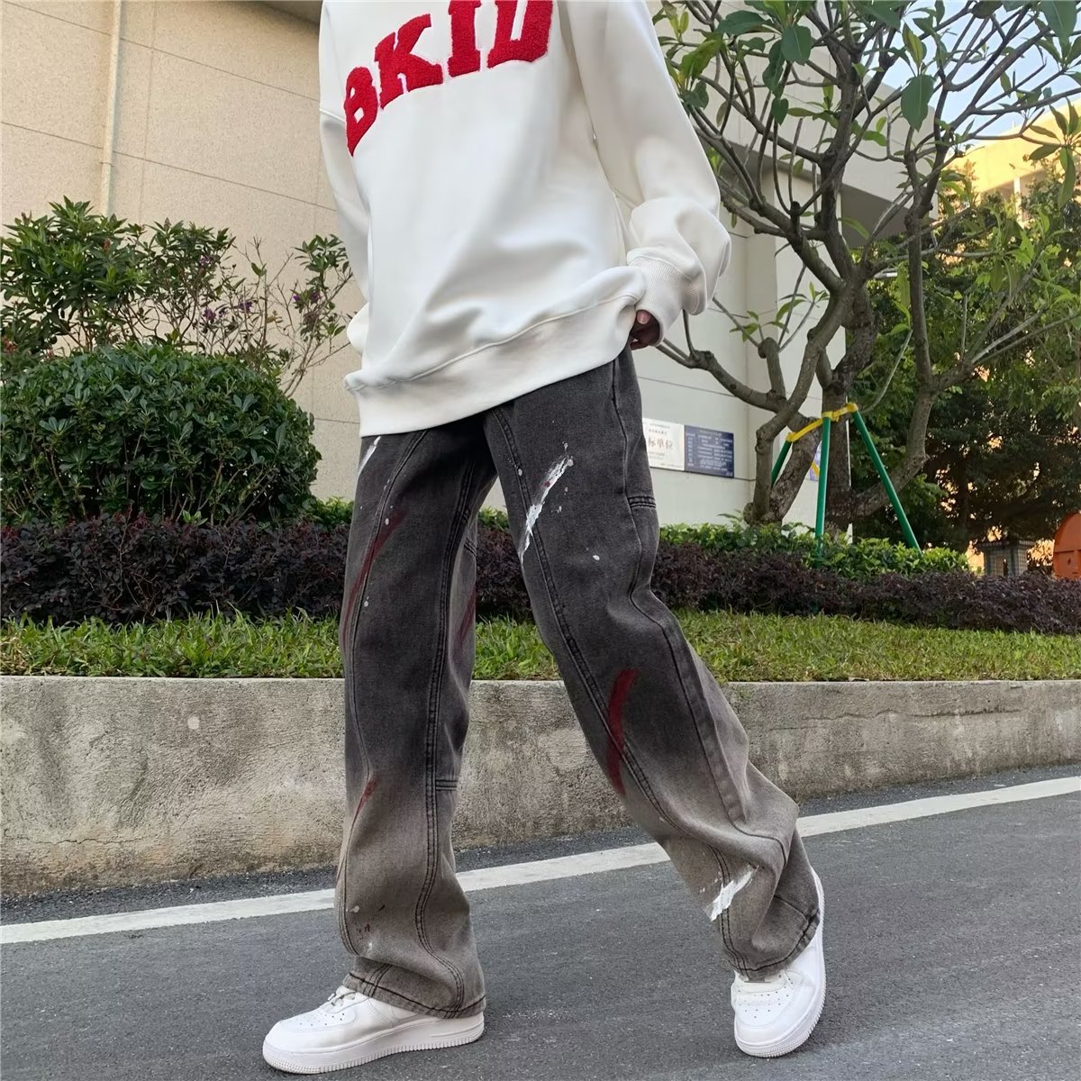 유럽과 미국의 하이 스트리트 힙합 청바지 남성 힙합 스트리트 작업복 스트레이트 팬츠 블랙 그레이 그라데이션 스플래시 잉크 팬츠스토어 가기