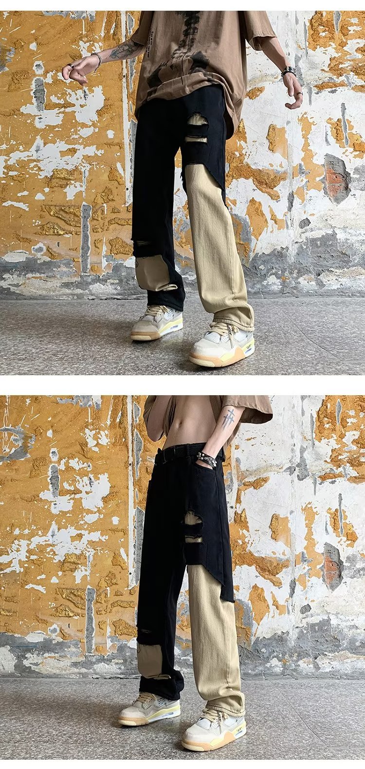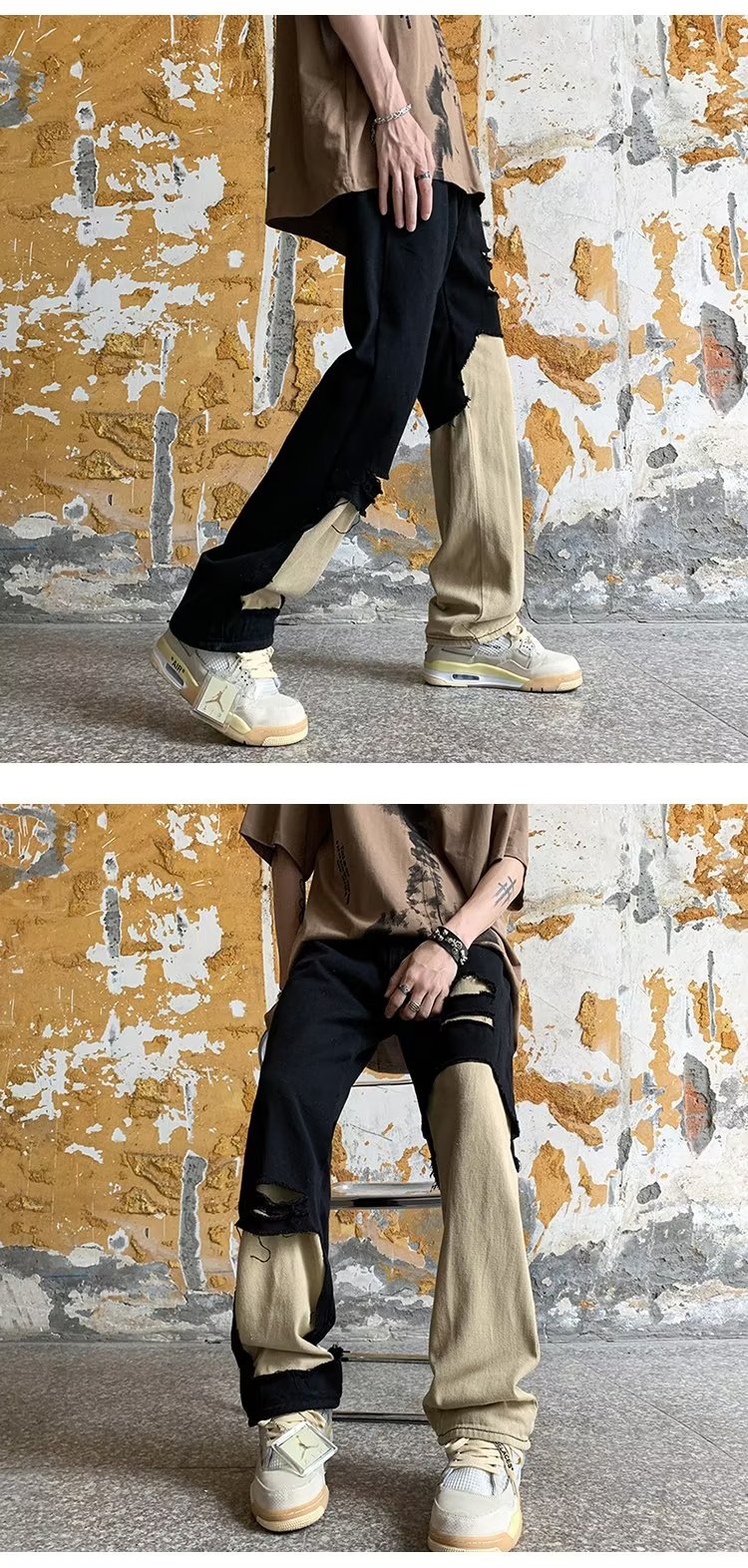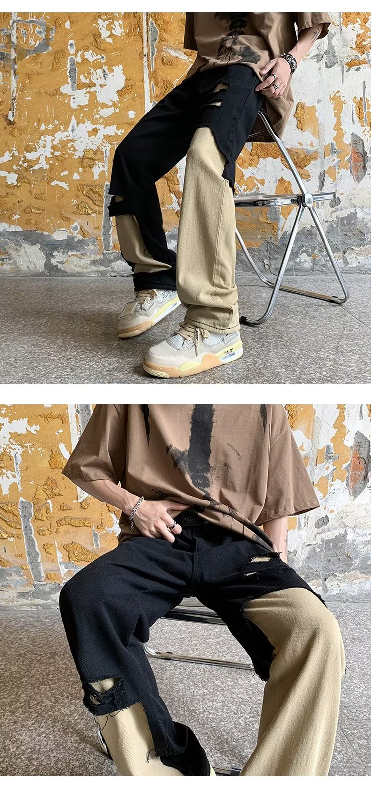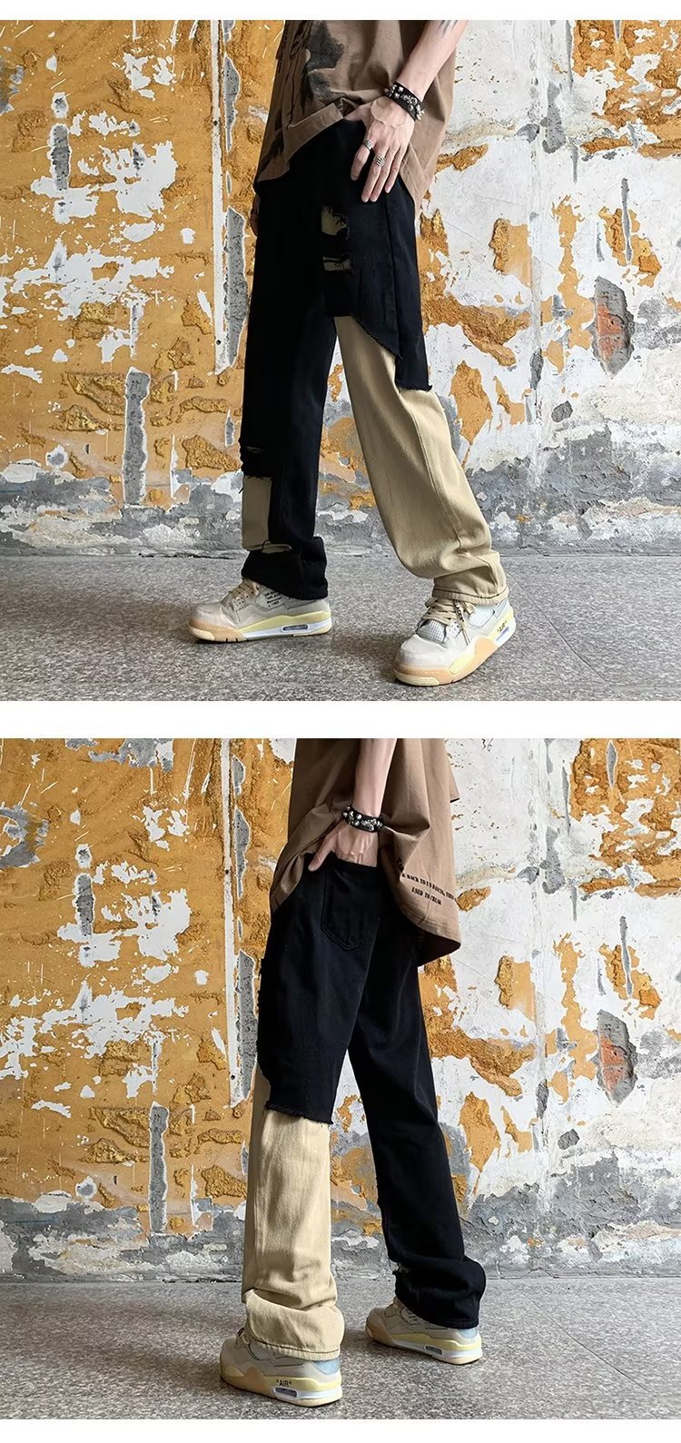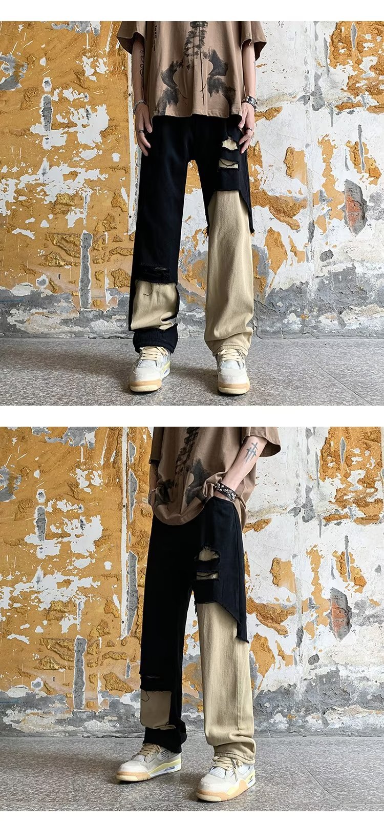 아메리칸 바이브 레트로 스플라이싱 콘트라스트 컬러 찢어진 청바지 남성 하이 스트리트 루즈 스트레이트 와이드 레그 오버올 트렌드
