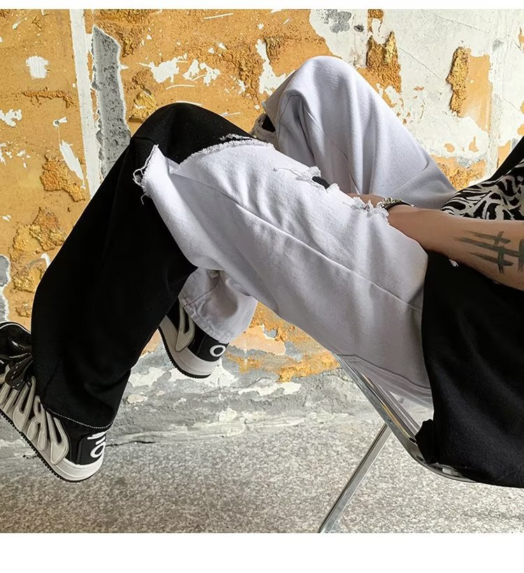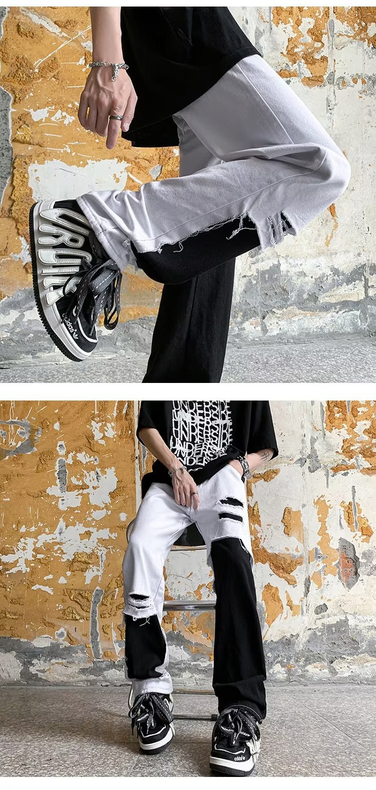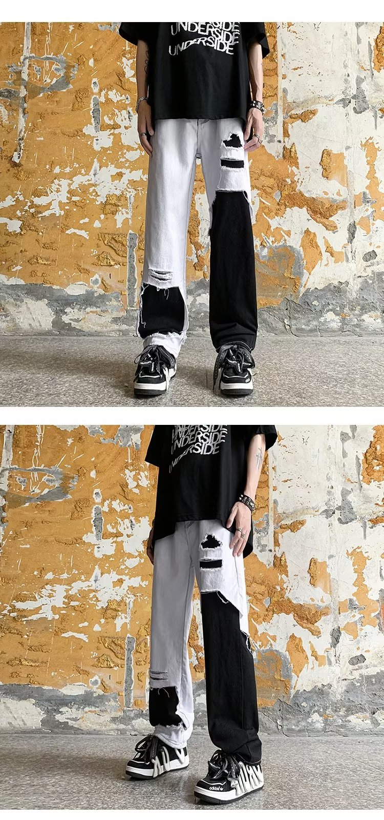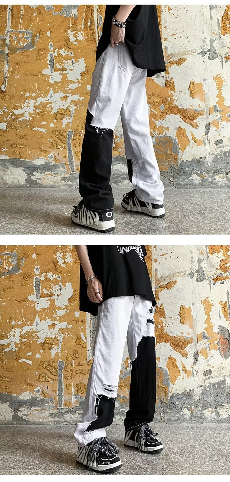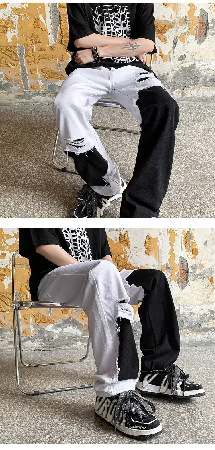 아메리칸 바이브 레트로 스플라이싱 콘트라스트 컬러 찢어진 청바지 남성 하이 스트리트 루즈 스트레이트 와이드 레그 오버올 트렌드