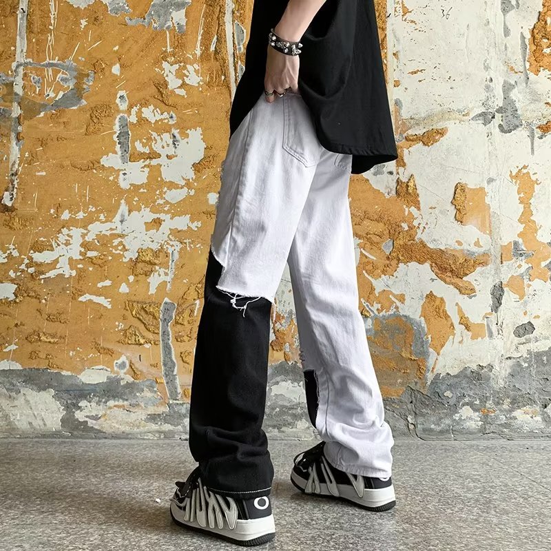아메리칸 바이브 레트로 스플라이싱 콘트라스트 컬러 찢어진 청바지 남성 하이 스트리트 루즈 스트레이트 와이드 레그 오버올 트렌드스토어 가기