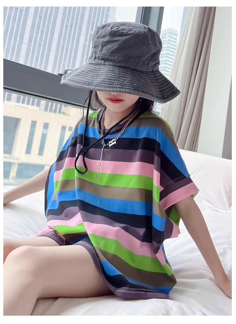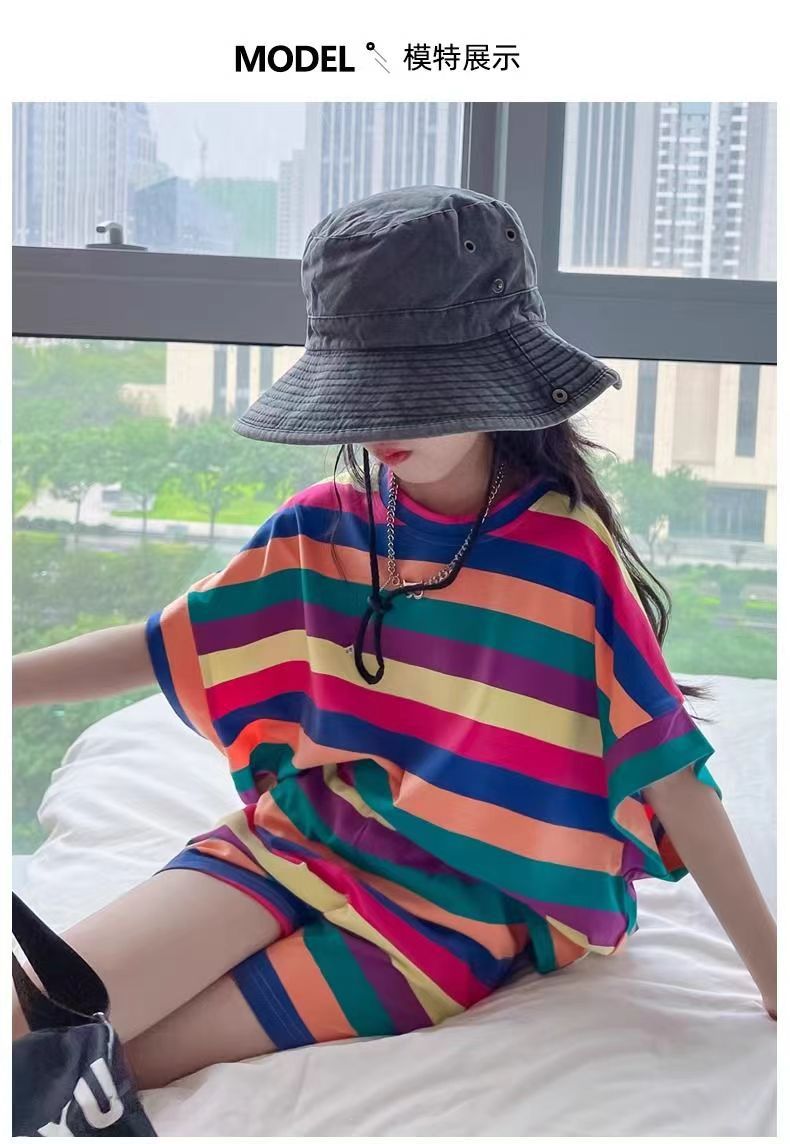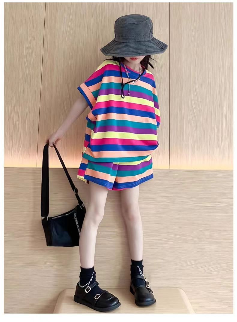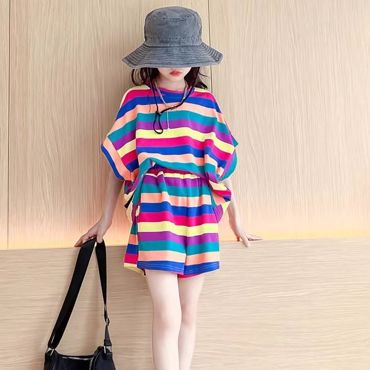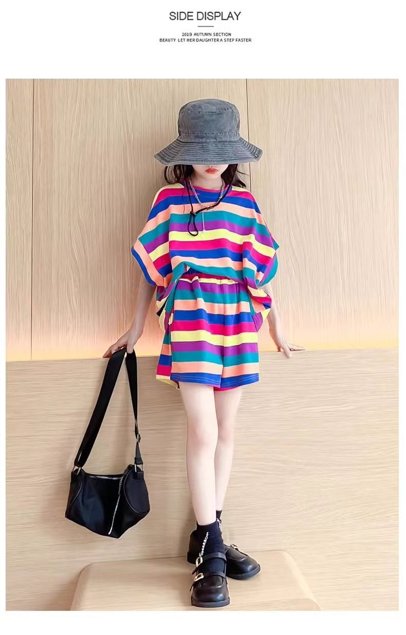 여성 아동복 유행 서양식 줄무늬 반팔 세트 새로운 어린이 캐주얼 착용 여름 인터넷 핫 프라이드 스트리트 큰 어린이 반바지 여름스토어 가기