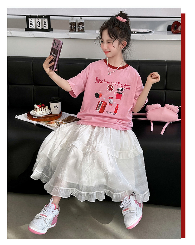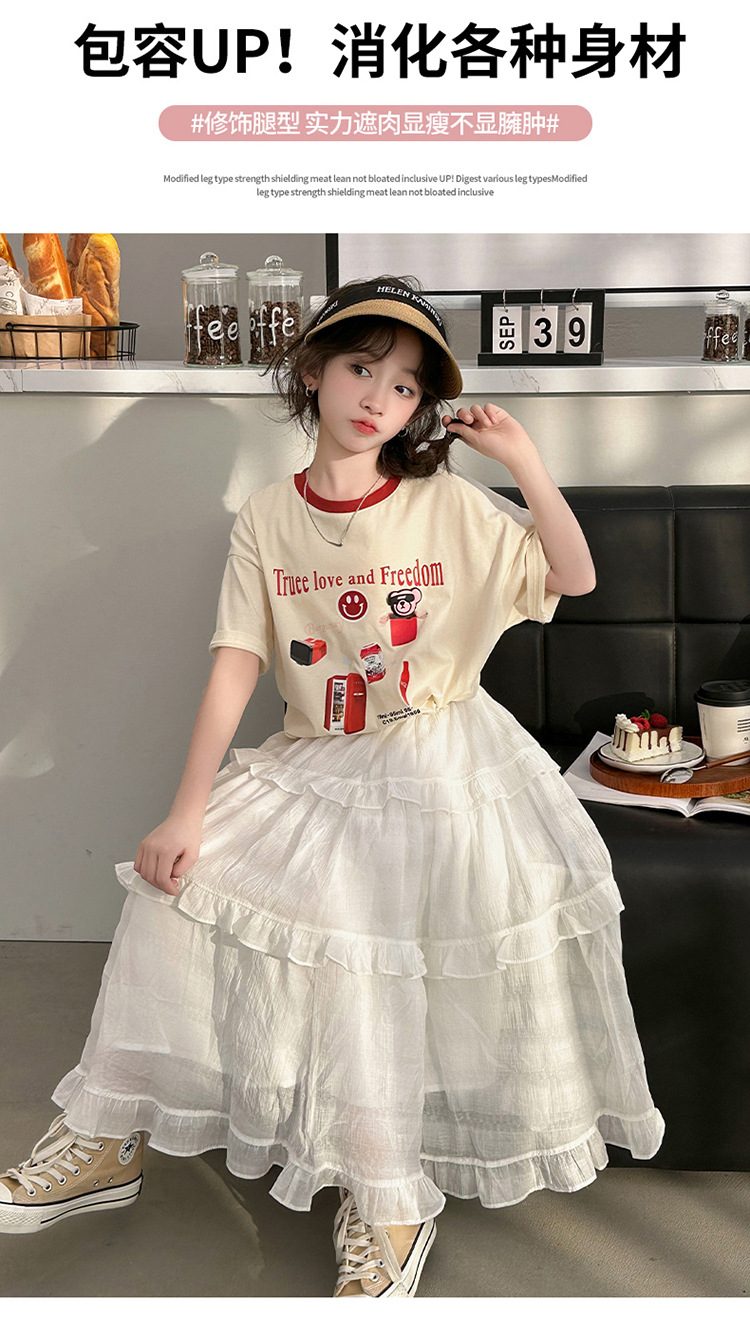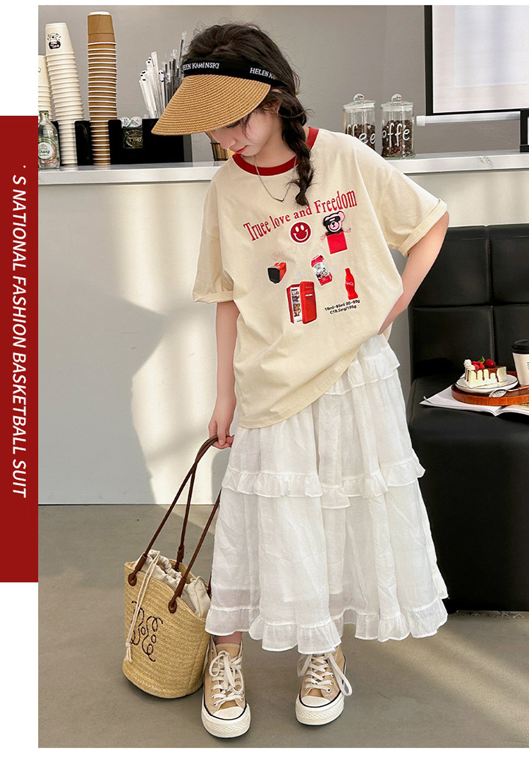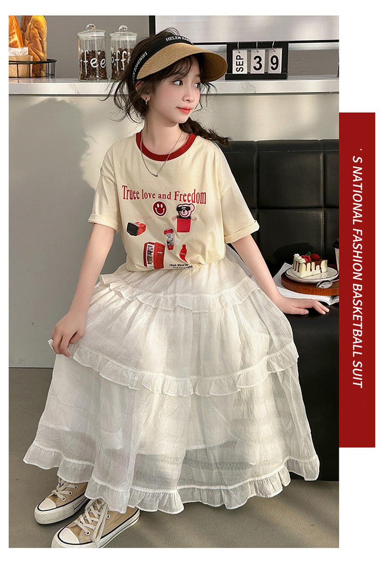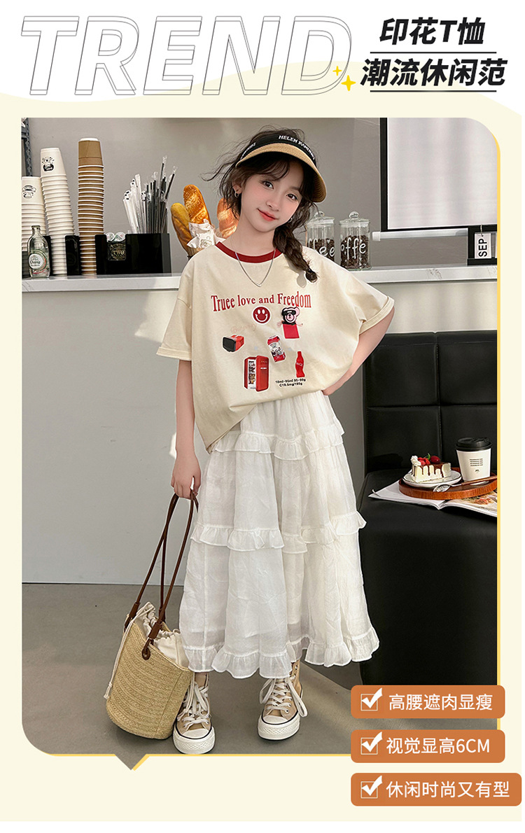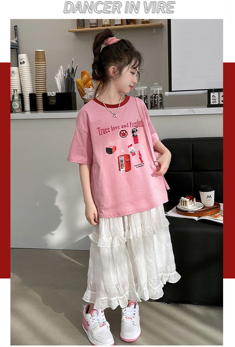 여자 여름 세트 여름 2025 새로운 캐주얼 올 매치 탑 어린이 스위트 티셔츠 케이크 스커트 투피스 세트 6
