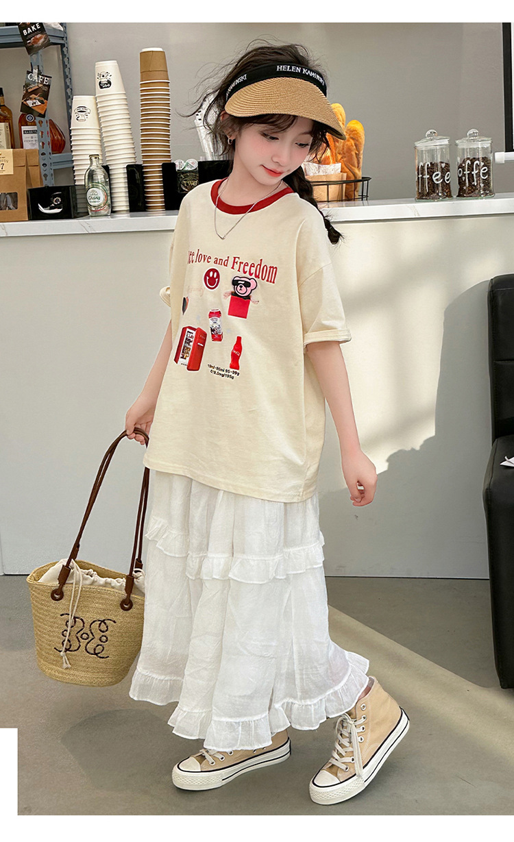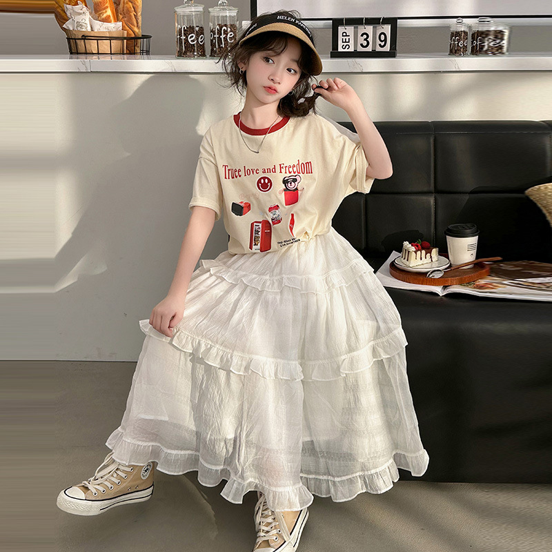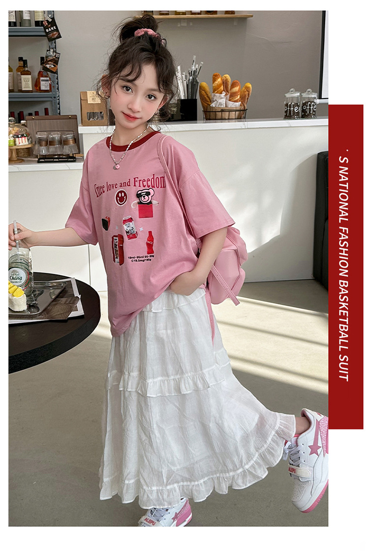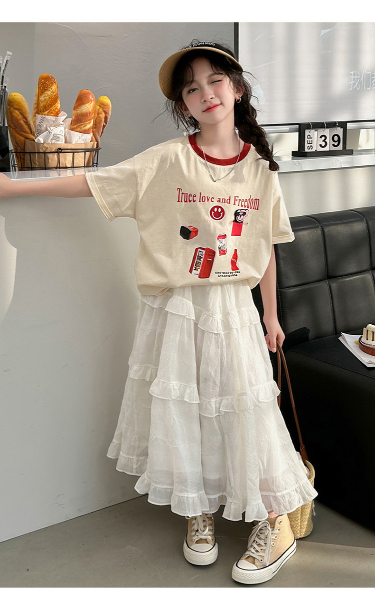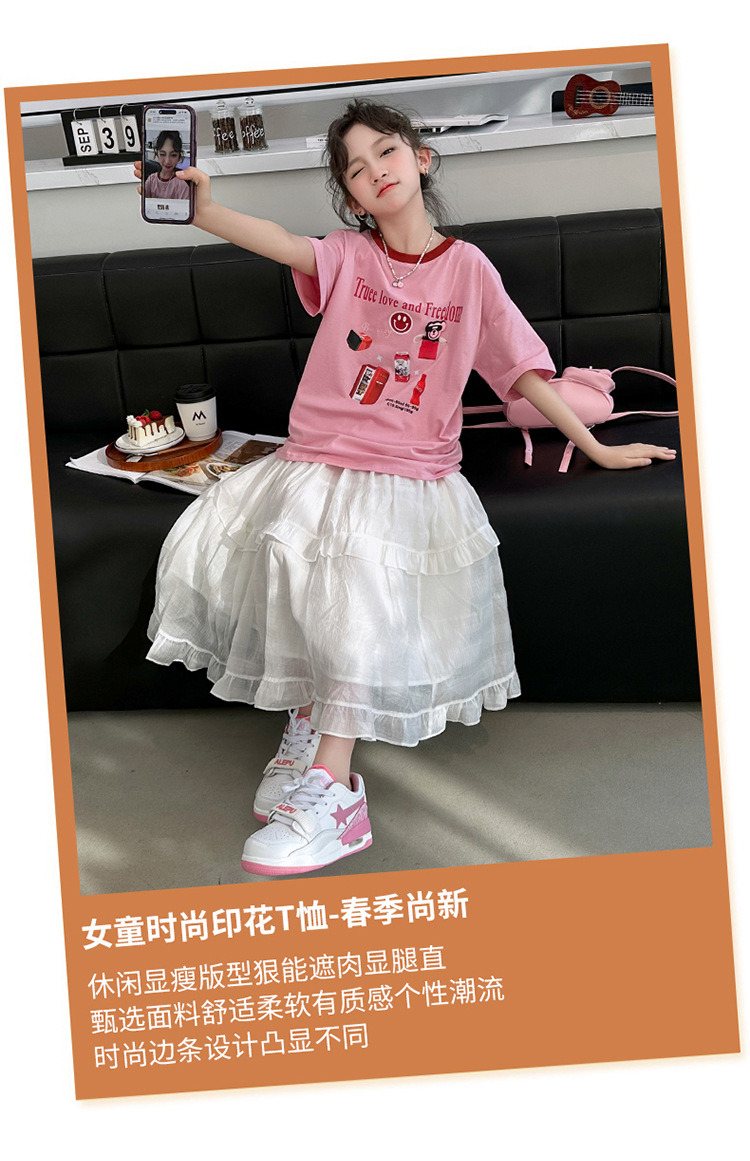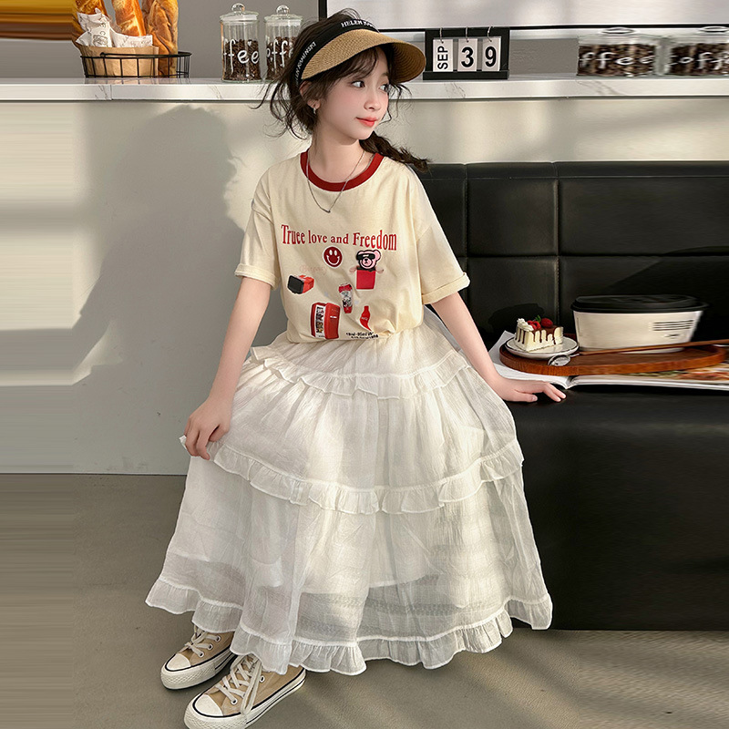 여자 여름 세트 여름 2025 새로운 캐주얼 올 매치 탑 어린이 스위트 티셔츠 케이크 스커트 투피스 세트 6