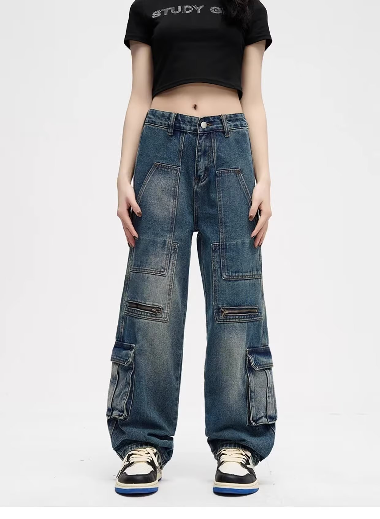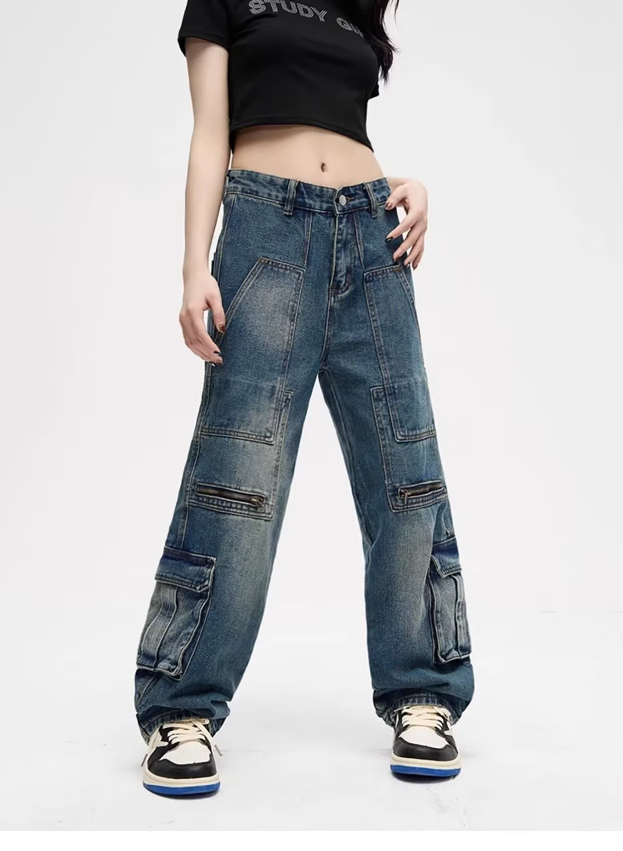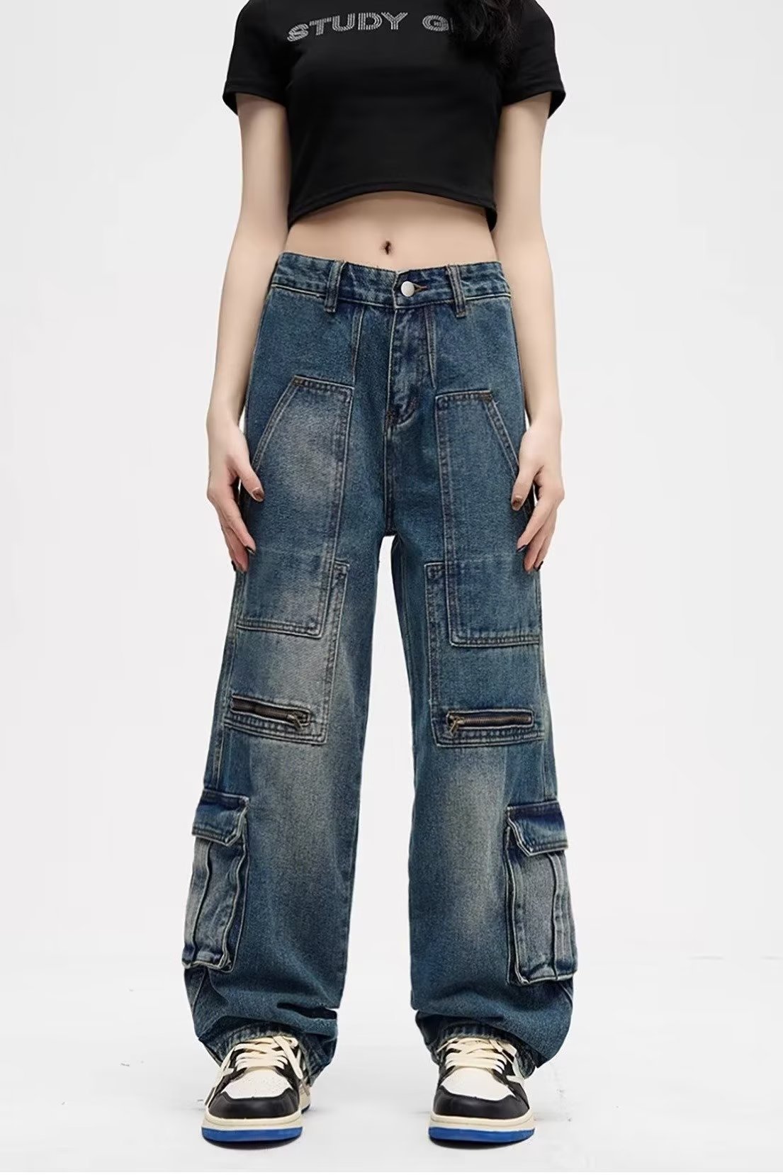 2023 새로운 미국 스타일 빈티지 오래 된 멀티 포켓 툴링 청바지 남성과 여성의 여름 스트레이트 캐주얼 바지