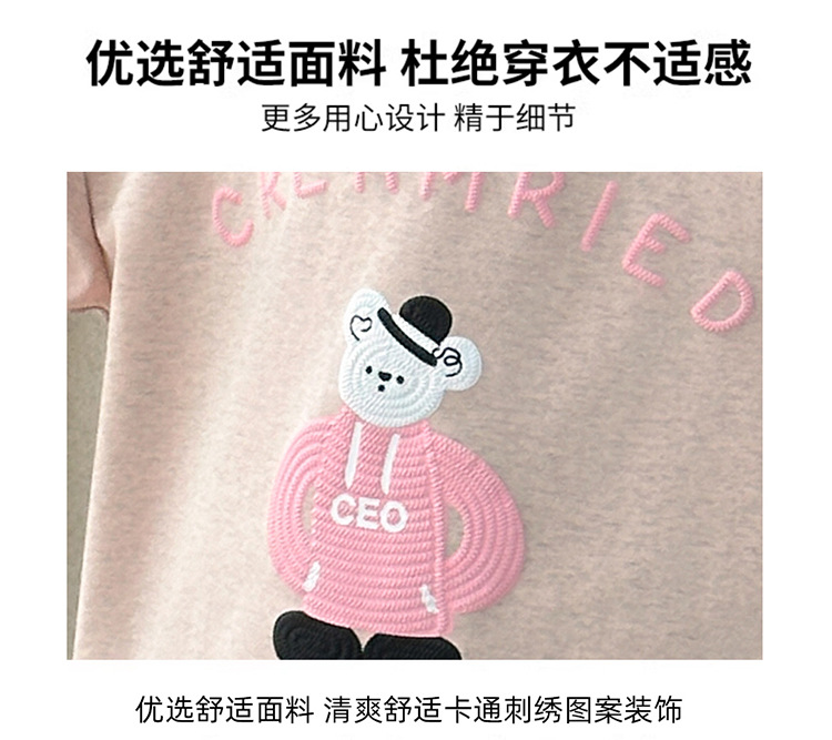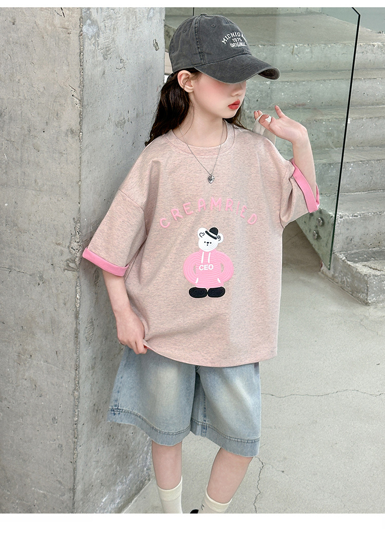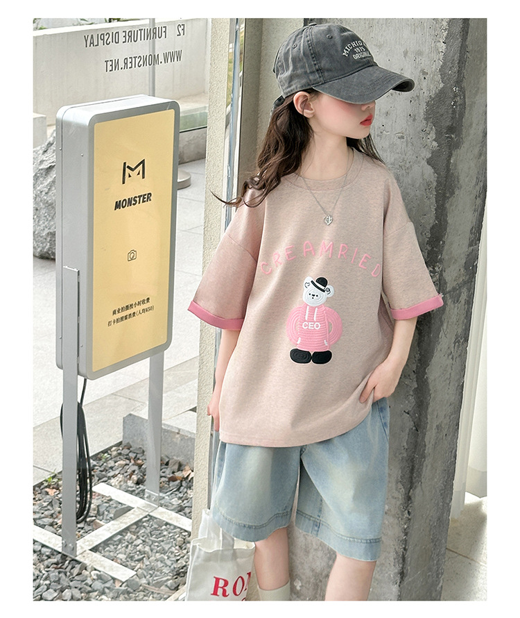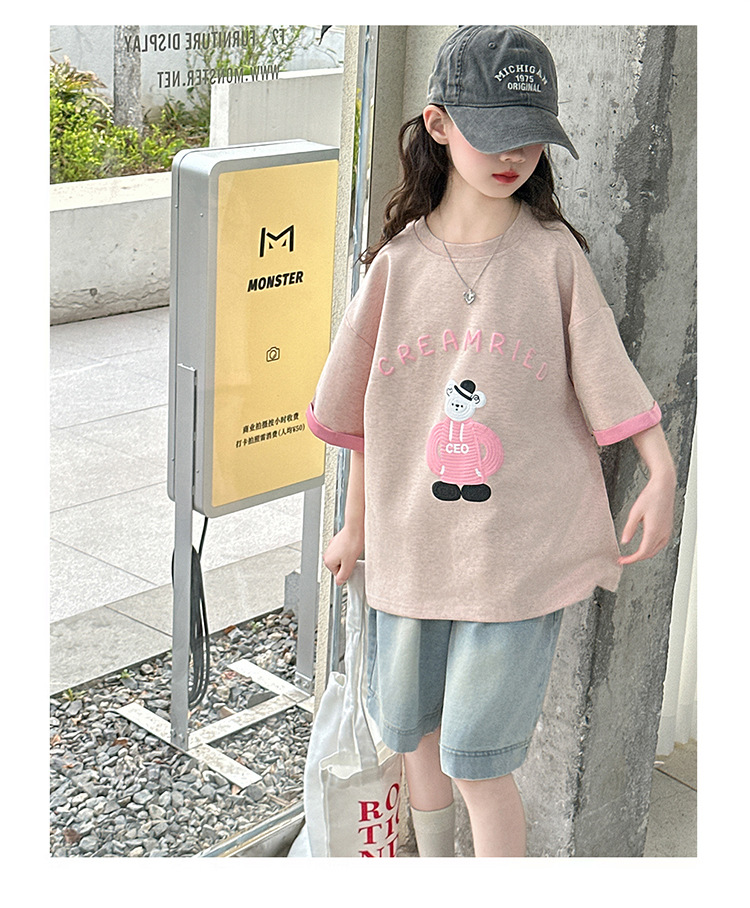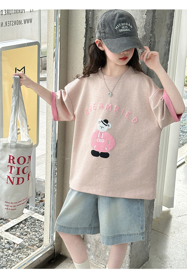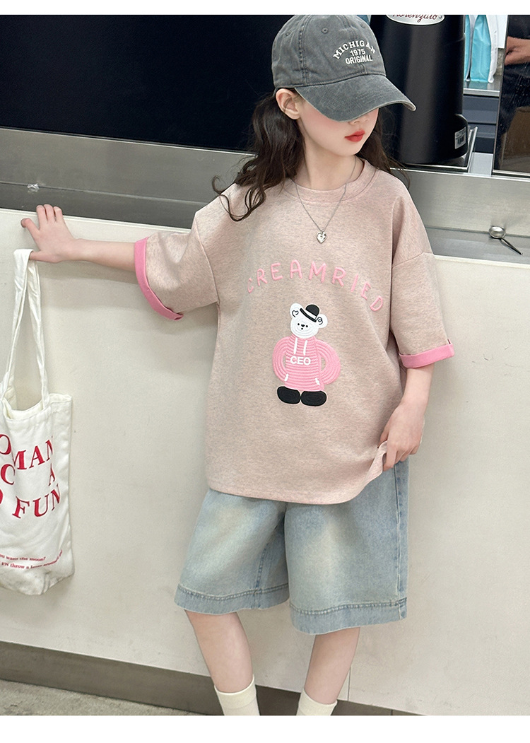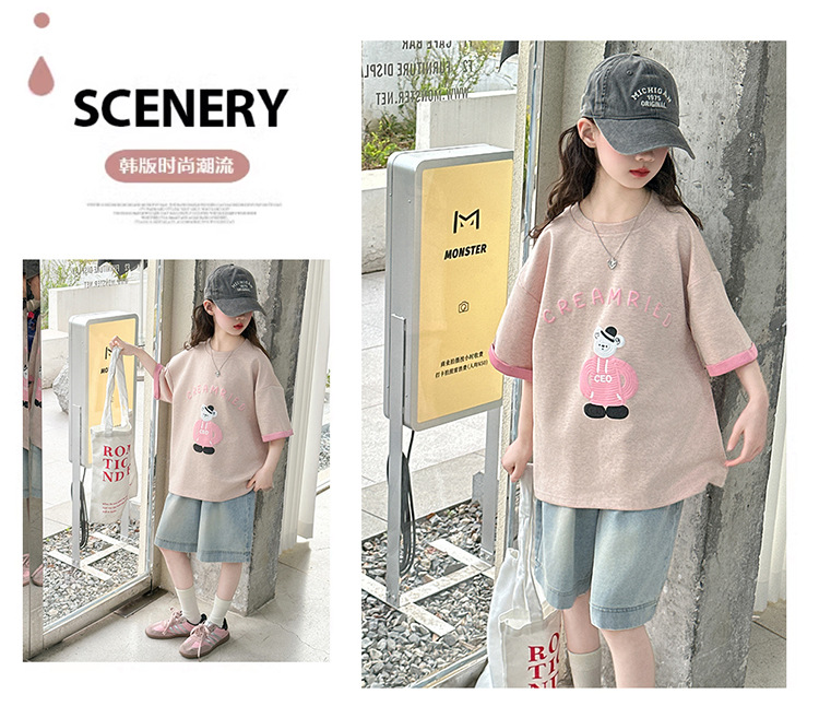 여자 여름 세트 2025 새로운 스타일 여자 패션 양면 컬러 베어 프린트 반팔 티셔츠 데님 트렌디 바지스토어 가기