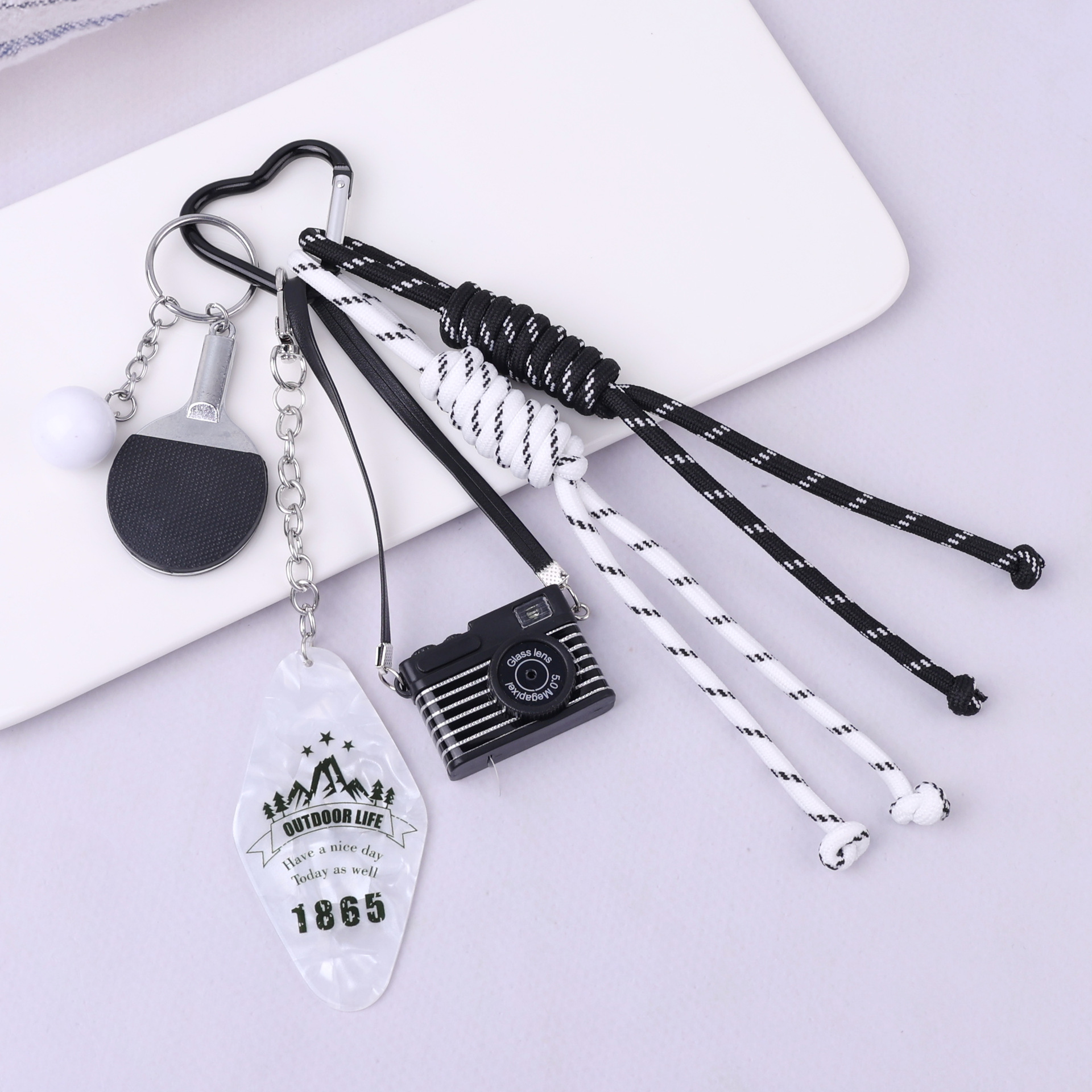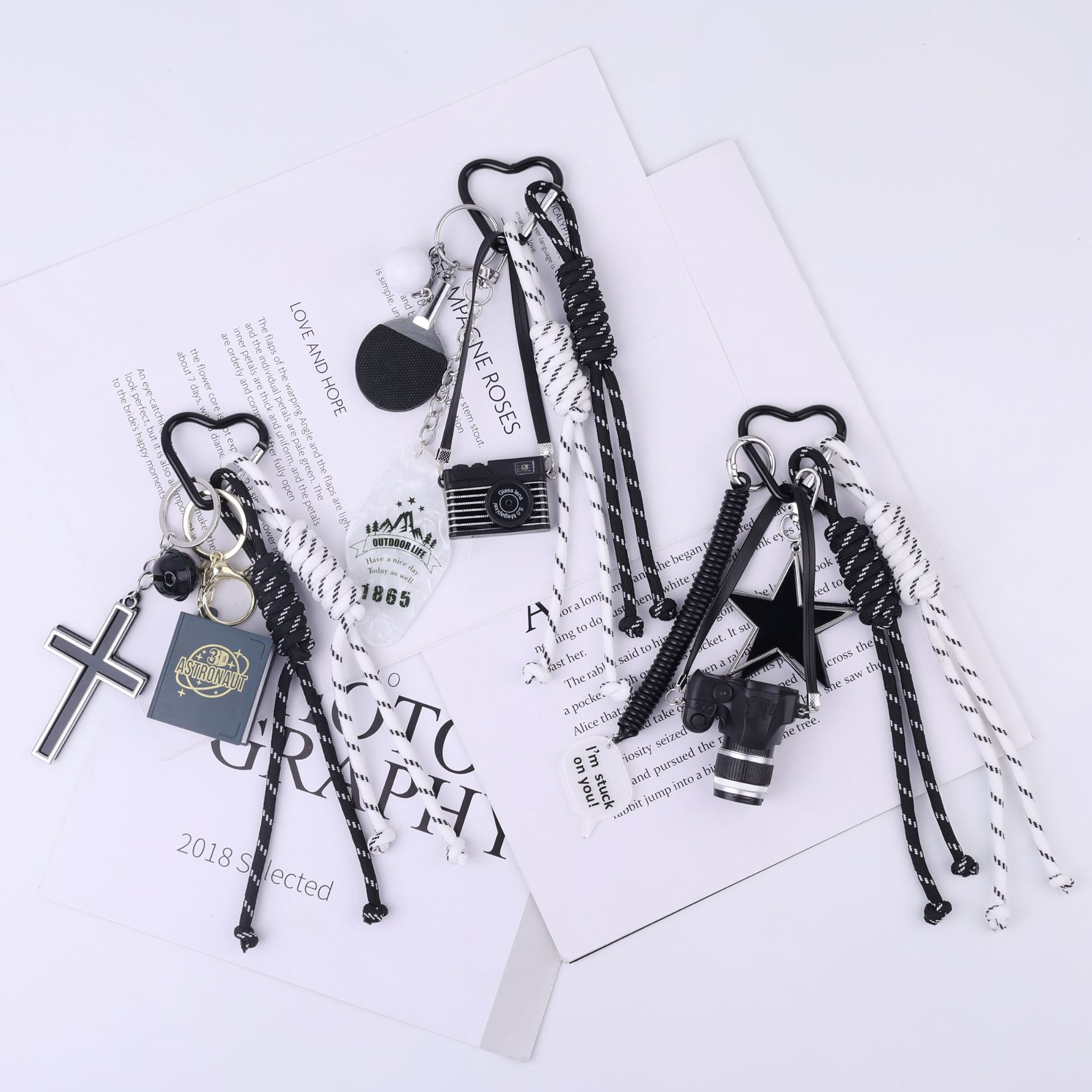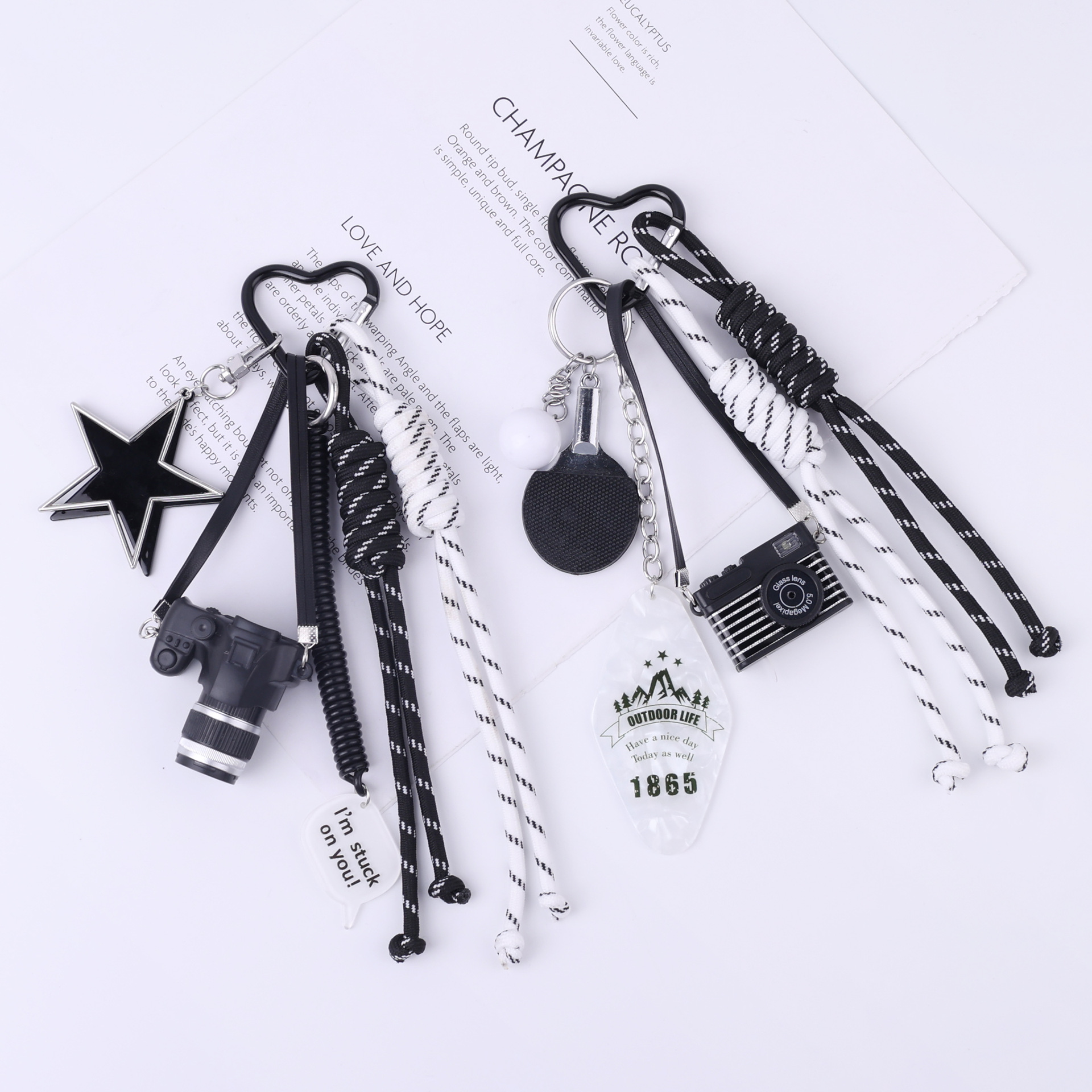 Ins 스타일 카메라 스타 키 체인 Miu 블랙 및 화이트 꼰 로프 하트 모양의 후크 자동차 액세서리 가방 교수형 펜던트