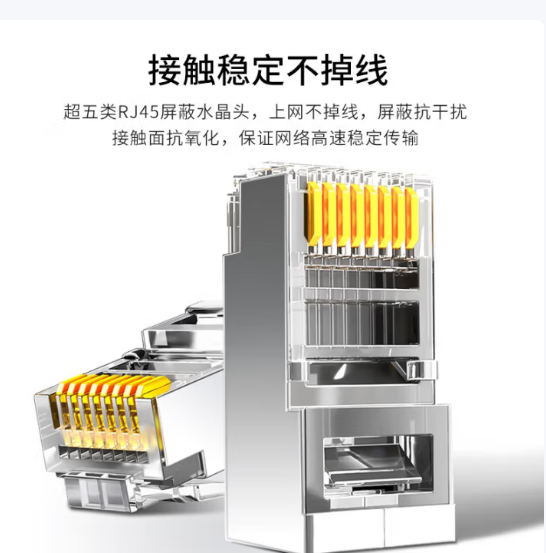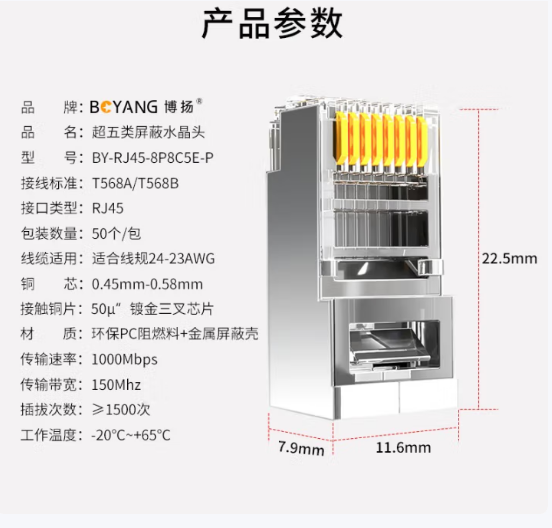 博扬 超五类RJ45屏蔽水晶头FTP 工程级Cat5e类千兆网线连接头(50U镀金)50/盒银色 BY-RJ45-8P8C5E-P*1 合格证*1