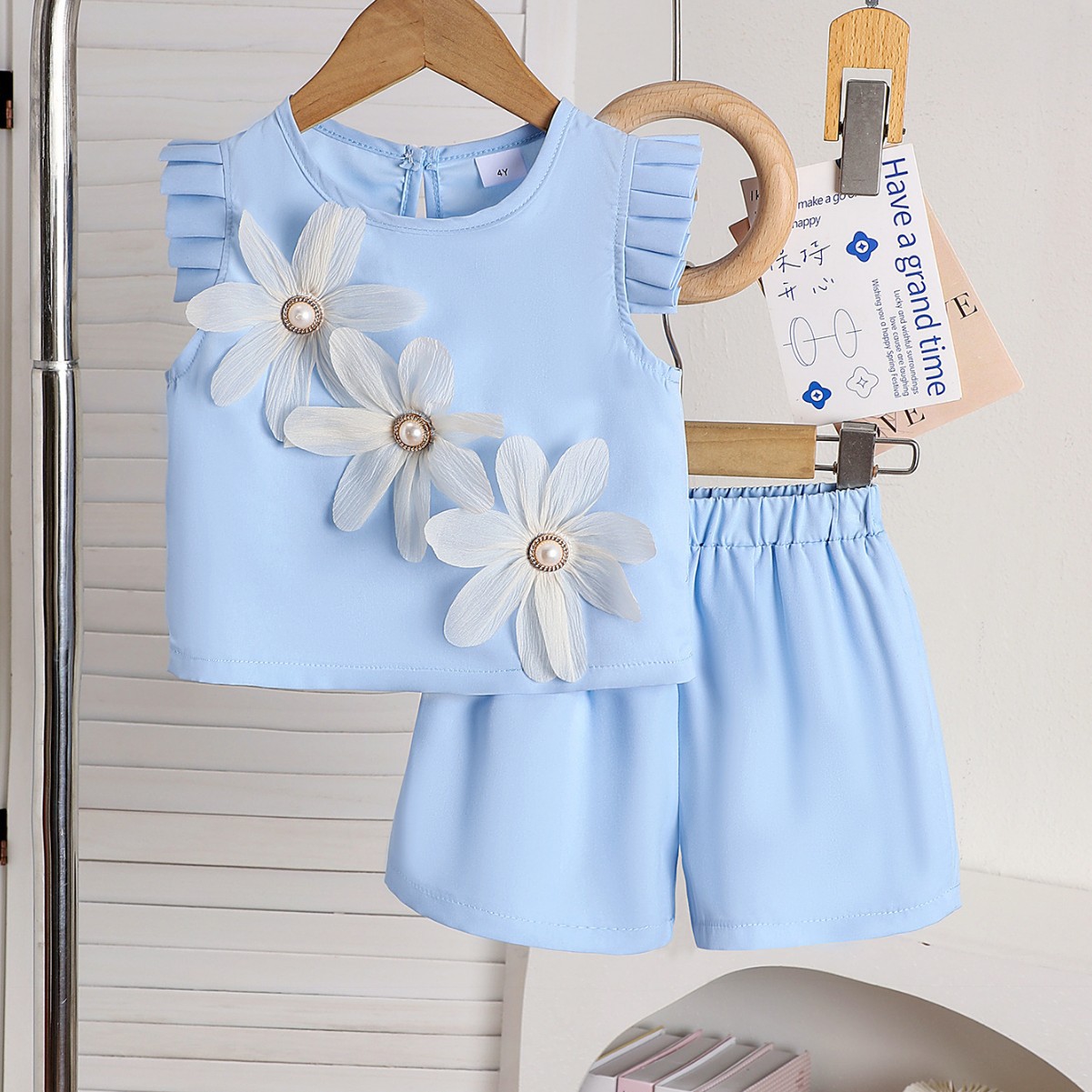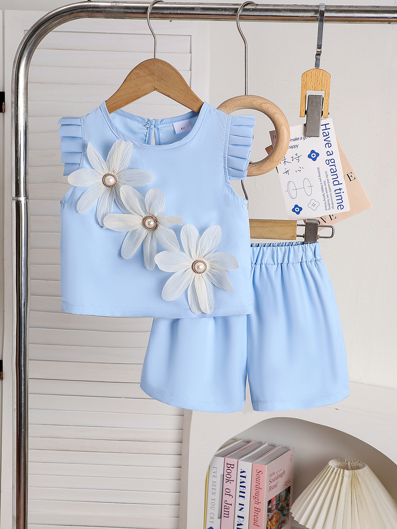 국경 간 유럽과 미국 여름 패션 패션 팬 소녀 세트 중소 규모 어린이 둥근 목 3 차원 꽃 짧은 소매 반바지 투피스 세트스토어 가기