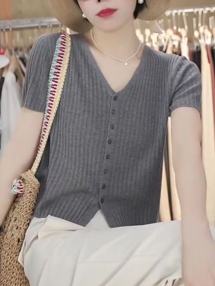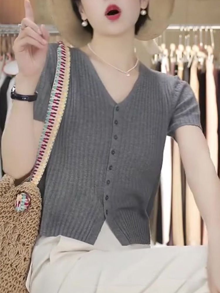 [팩토리 아울렛] 솔리드 컬러 V 넥 루즈 슬림 우아한 니트 카디건 티셔츠 여성 2025 뉴 여름 패션스토어 가기