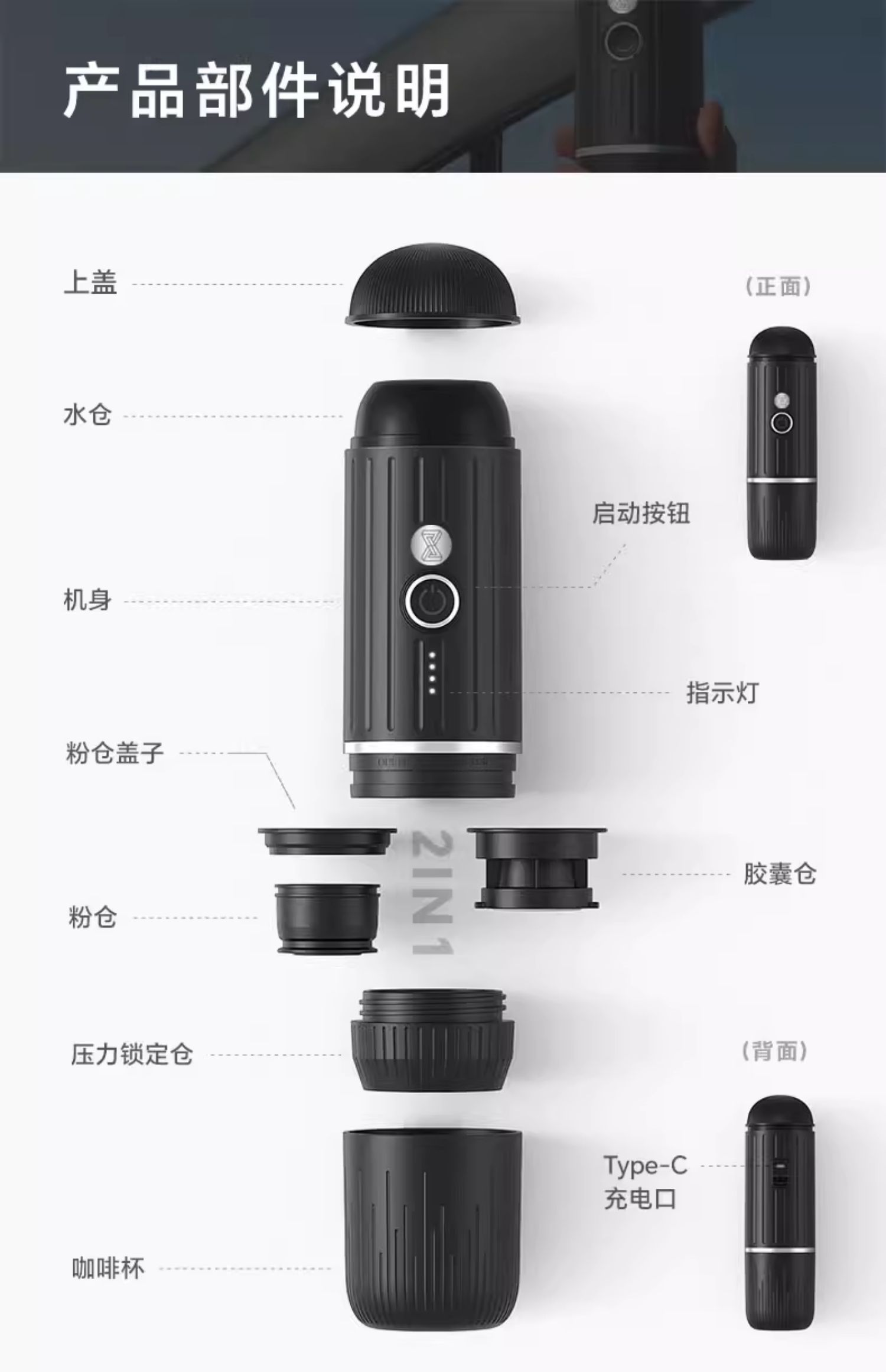 • 우아한 블랙 무선 난방 모델| 캡슐 커피 파우더 겸용| 파우더 공급 스푼 + R30 핸드 그라인더