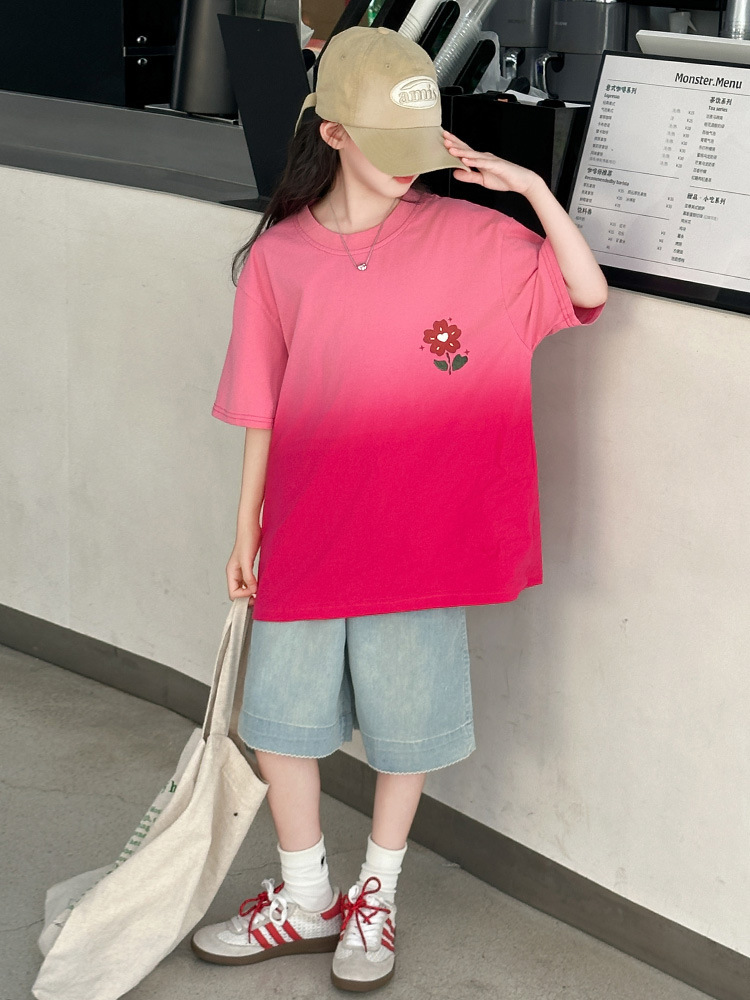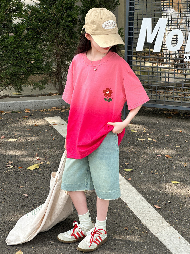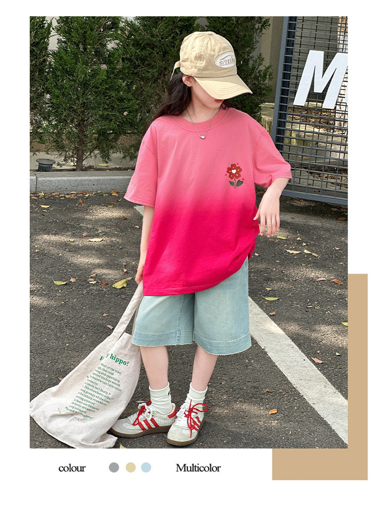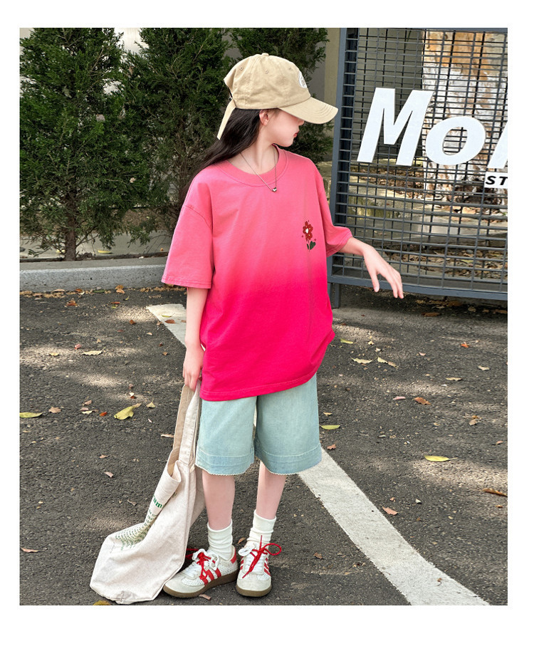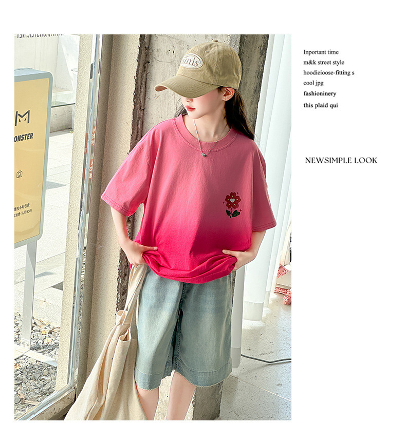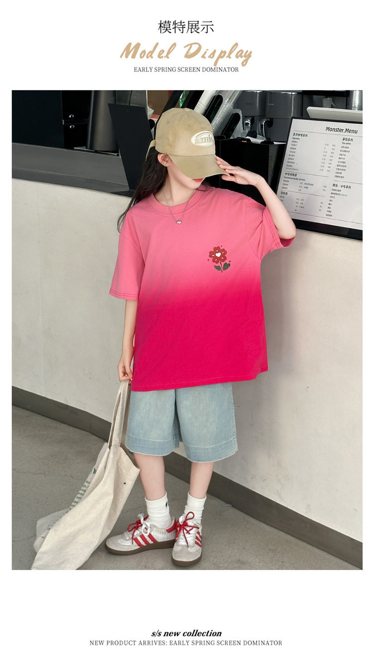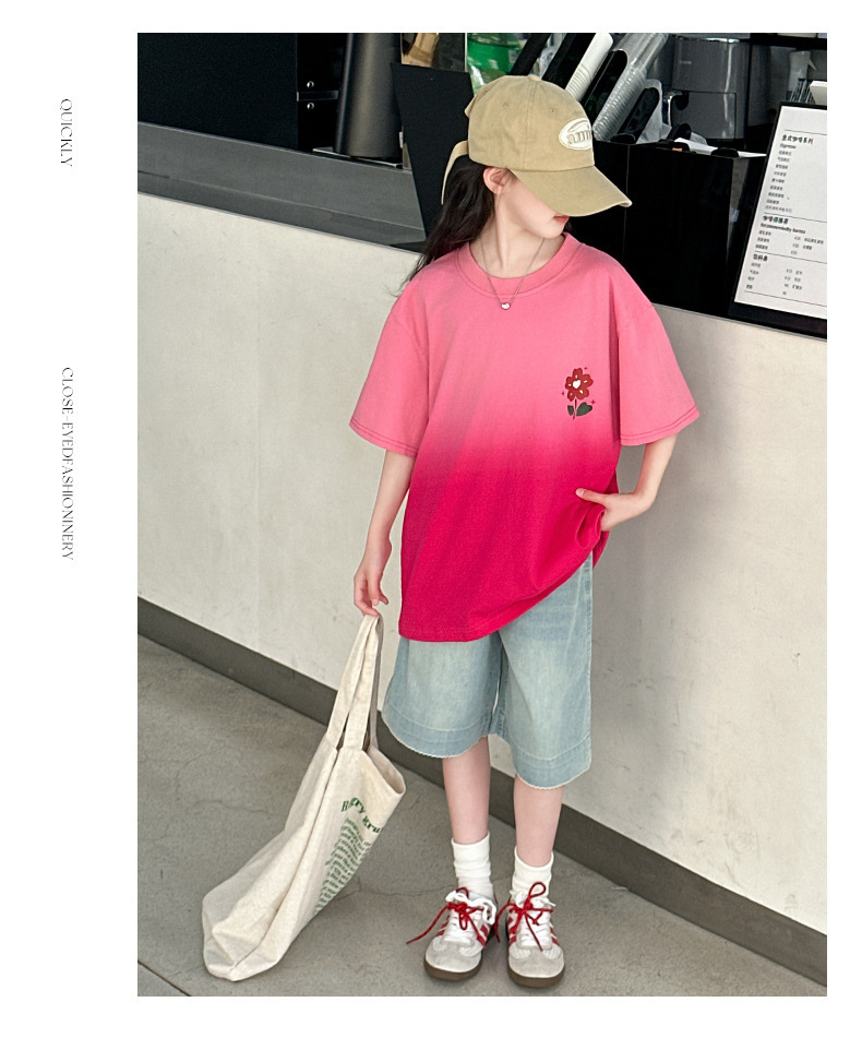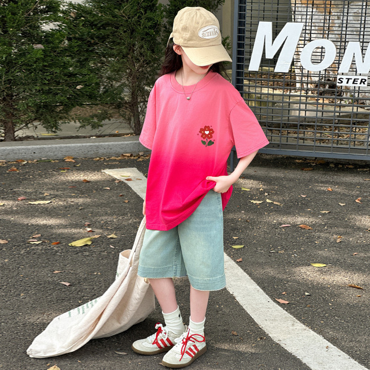 대외 무역 소녀 드롭 염색 꽃 반팔 티셔츠 소녀 한국 스타일 데님 바지 캐주얼 정장 여름 어린이 얇은 스타일