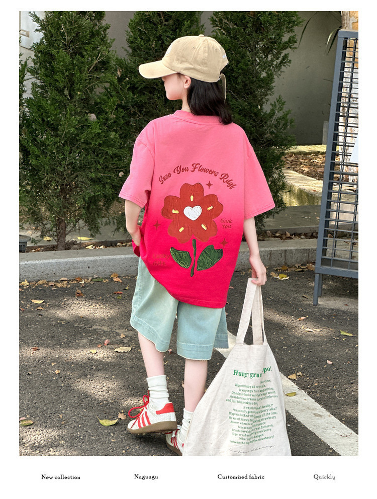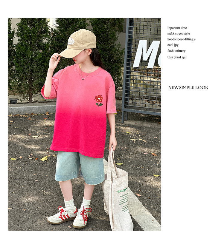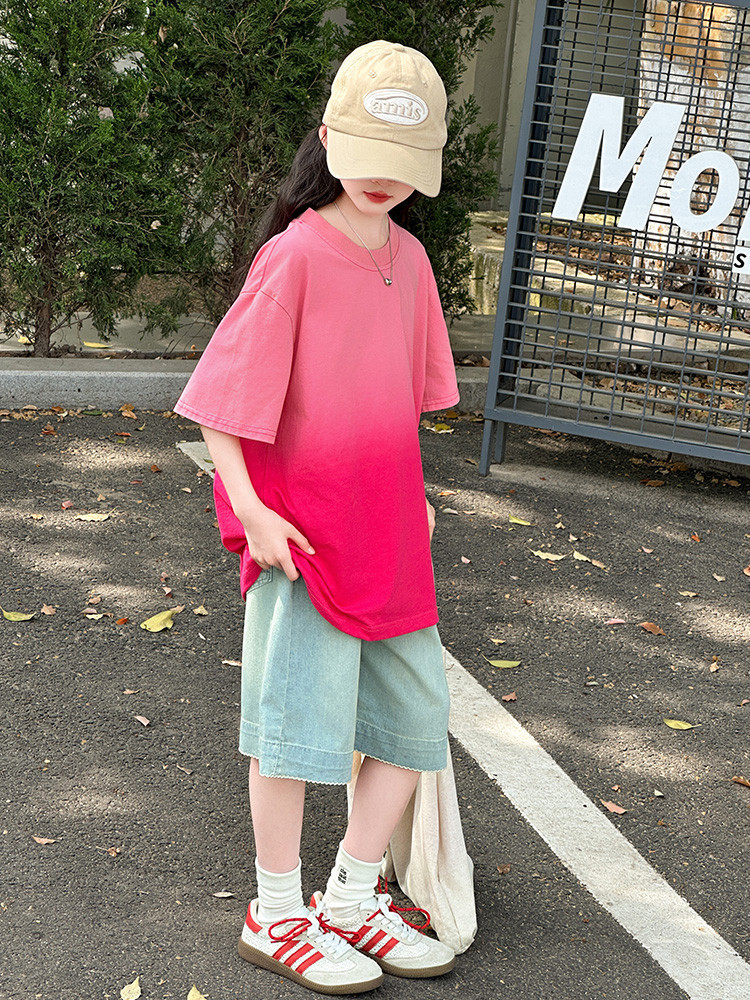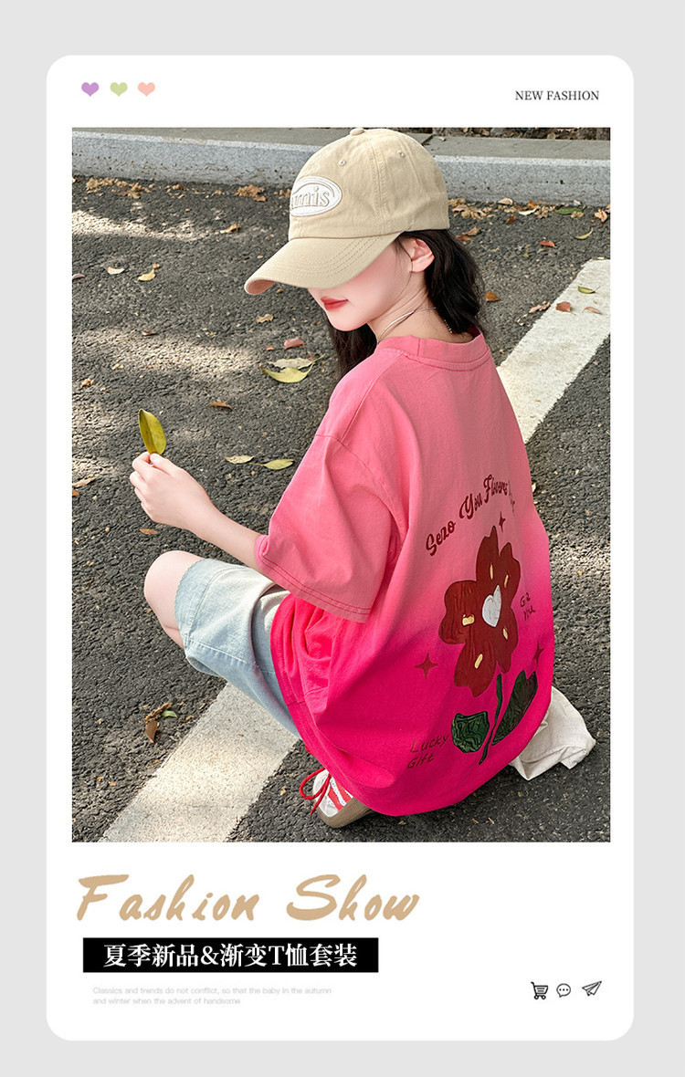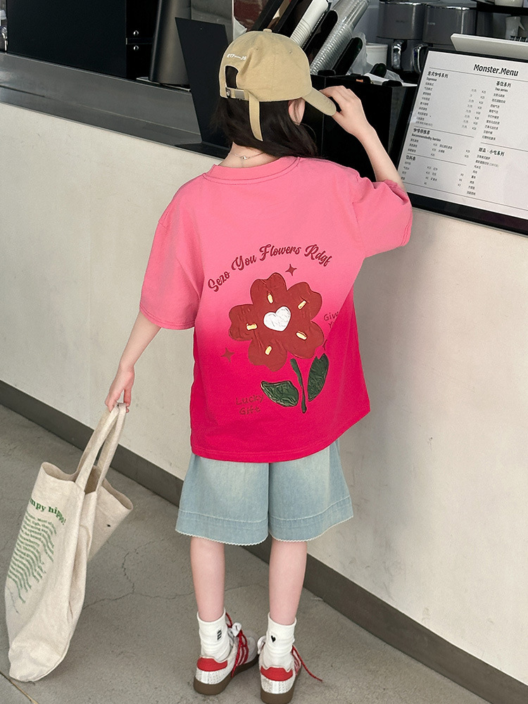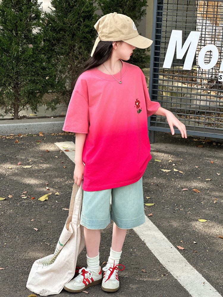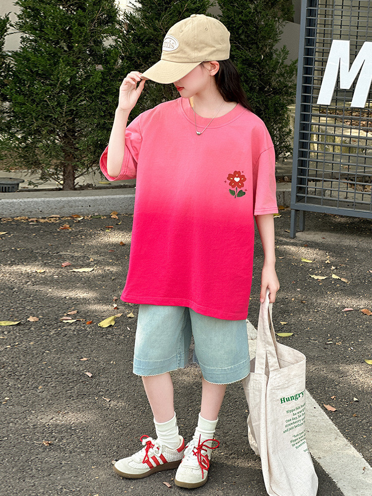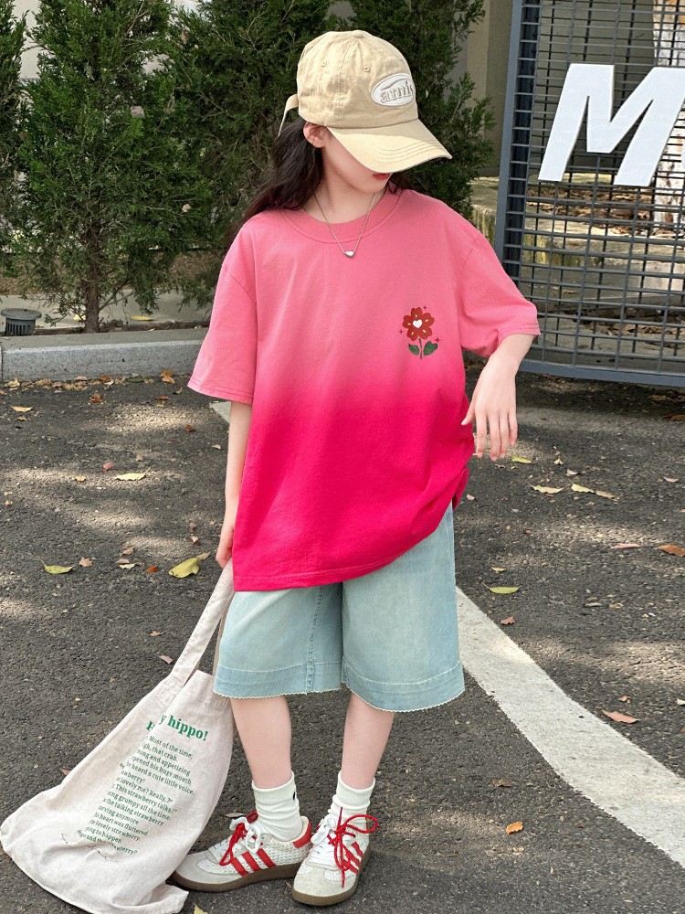 대외 무역 소녀 드롭 염색 꽃 반팔 티셔츠 소녀 한국 스타일 데님 바지 캐주얼 정장 여름 어린이 얇은 스타일
