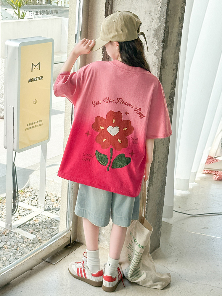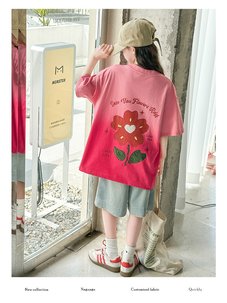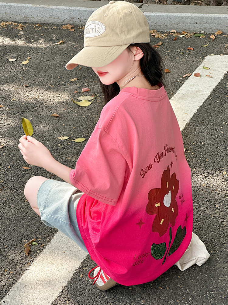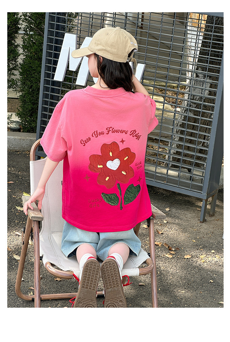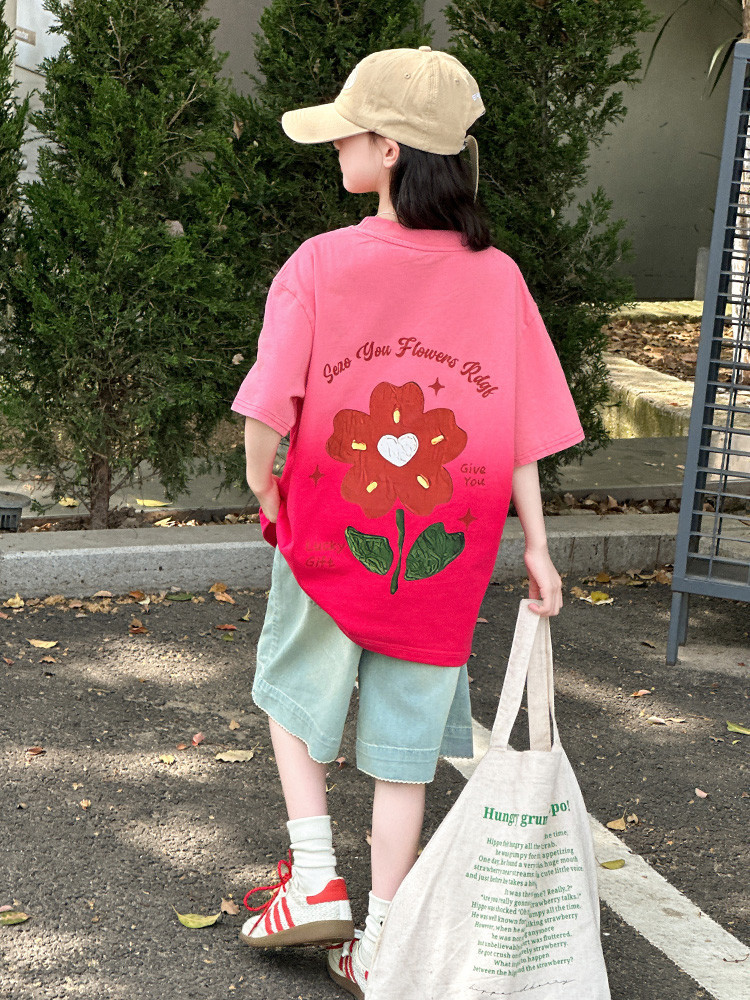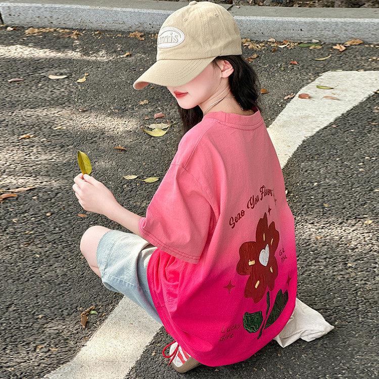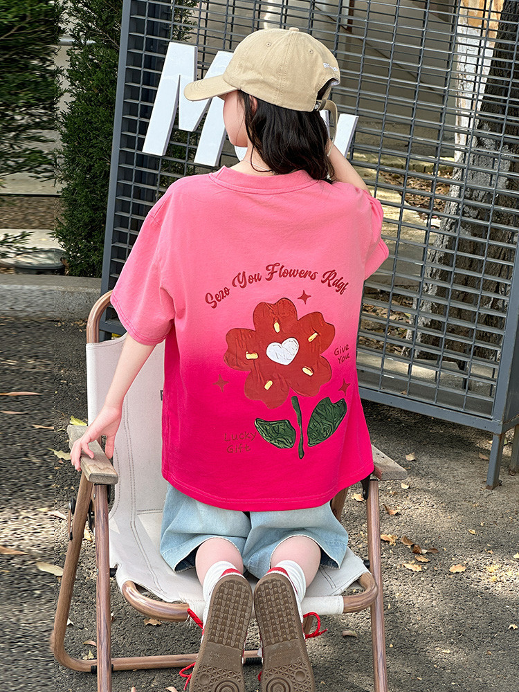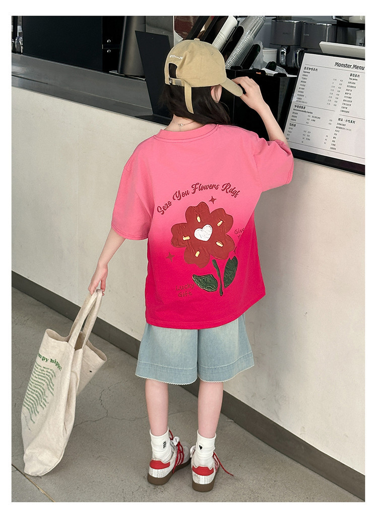 대외 무역 소녀 드롭 염색 꽃 반팔 티셔츠 소녀 한국 스타일 데님 바지 캐주얼 정장 여름 어린이 얇은 스타일