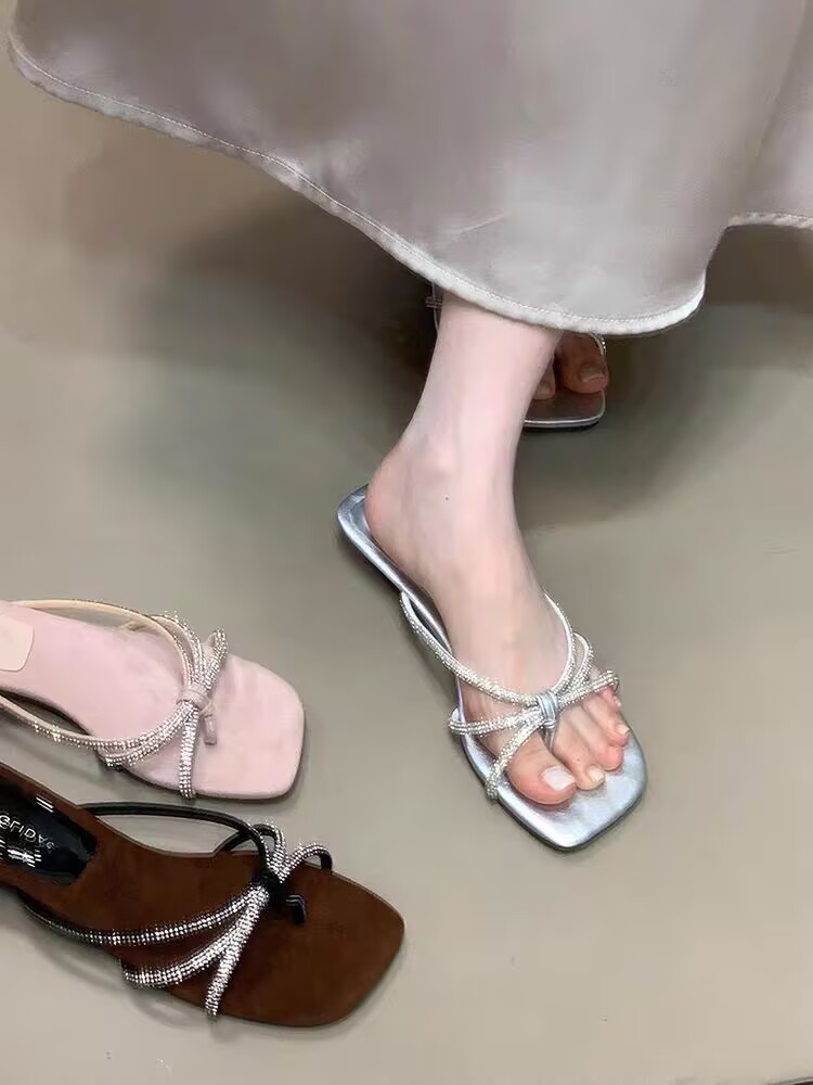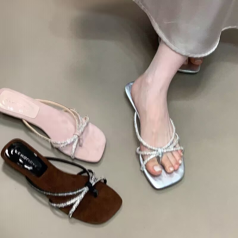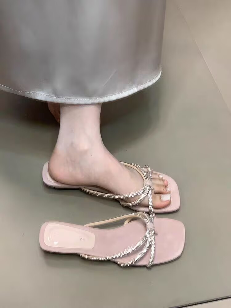 스퀘어 헤드 라인스톤 슬리퍼 여성용 아우터 2025 여름 새로운 프랑스 스타일 페어리 스타일 원통 플랫 플립 온 샌들스토어 가기