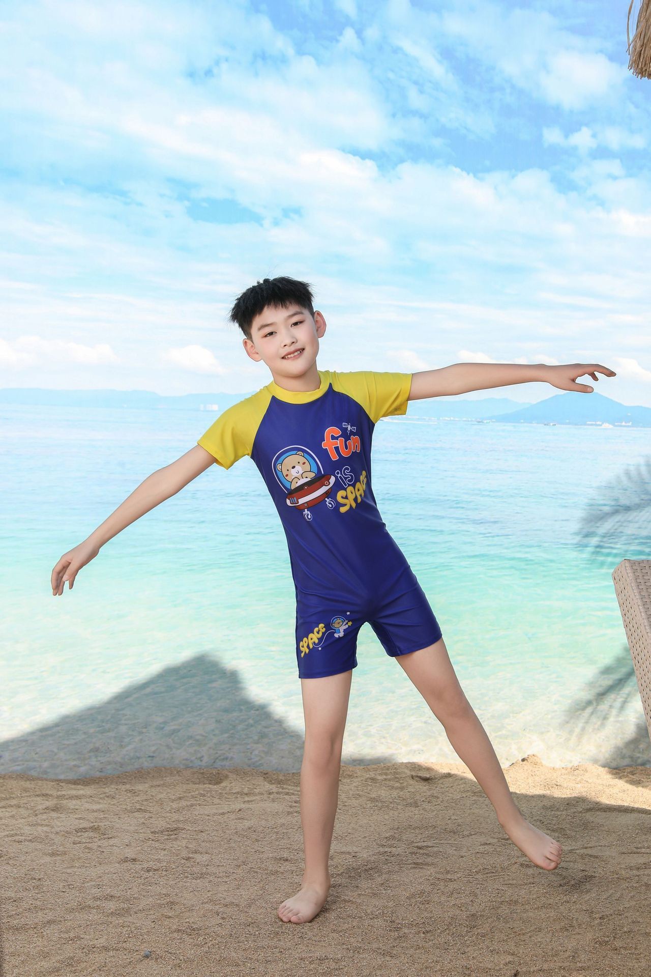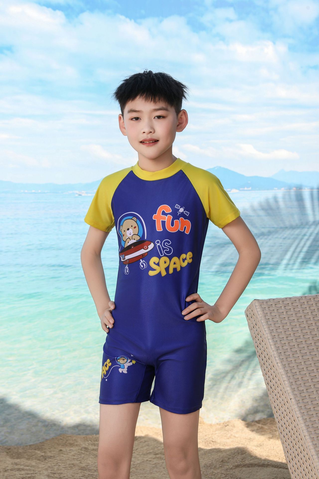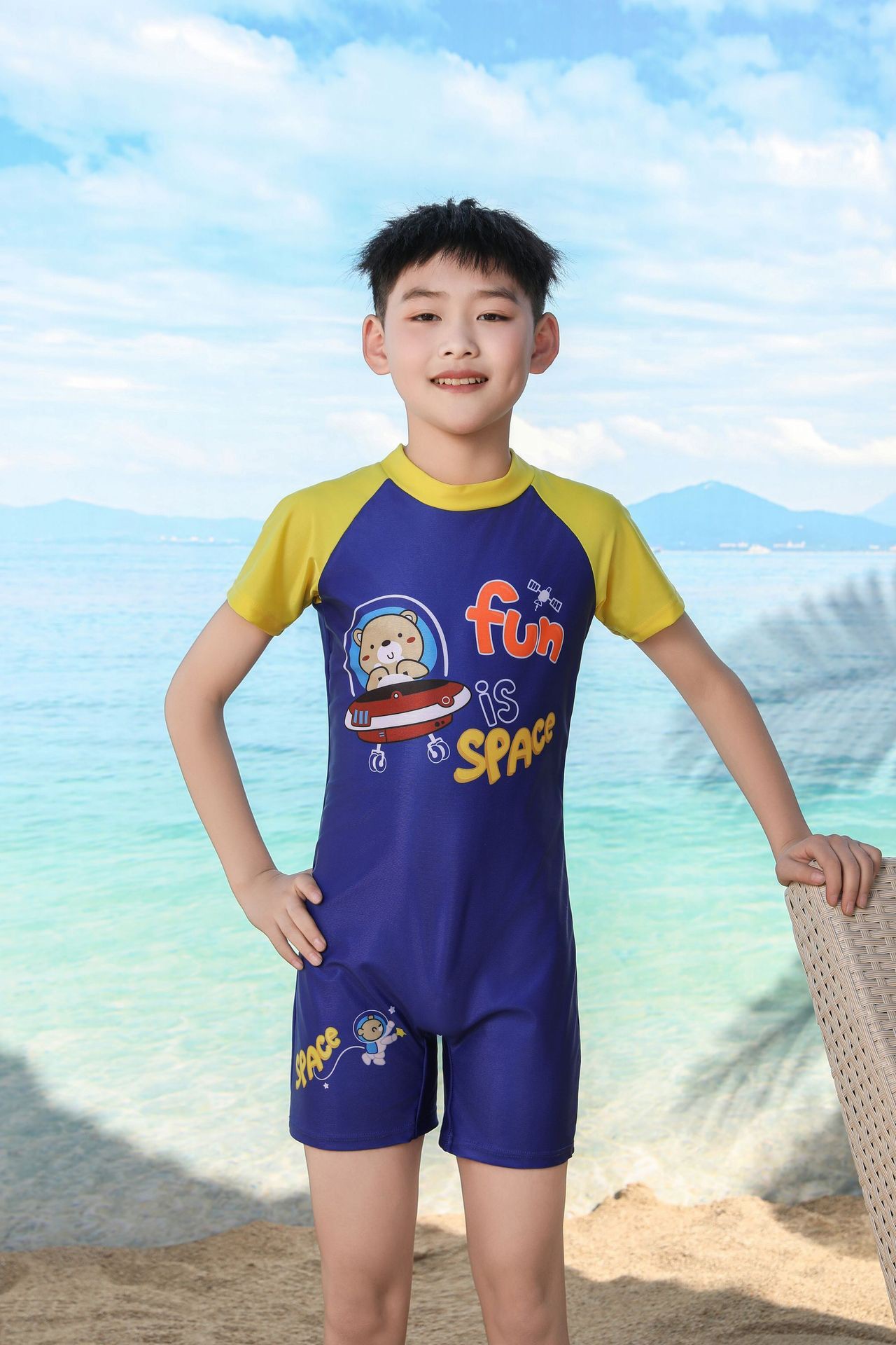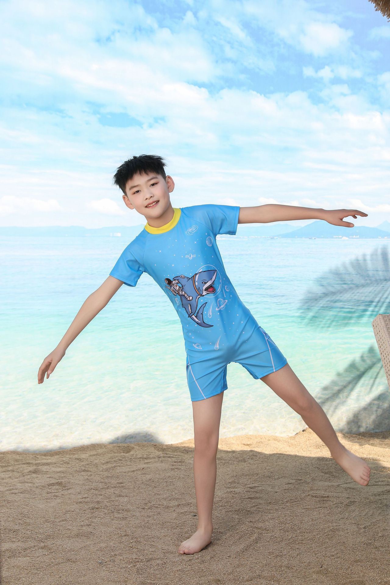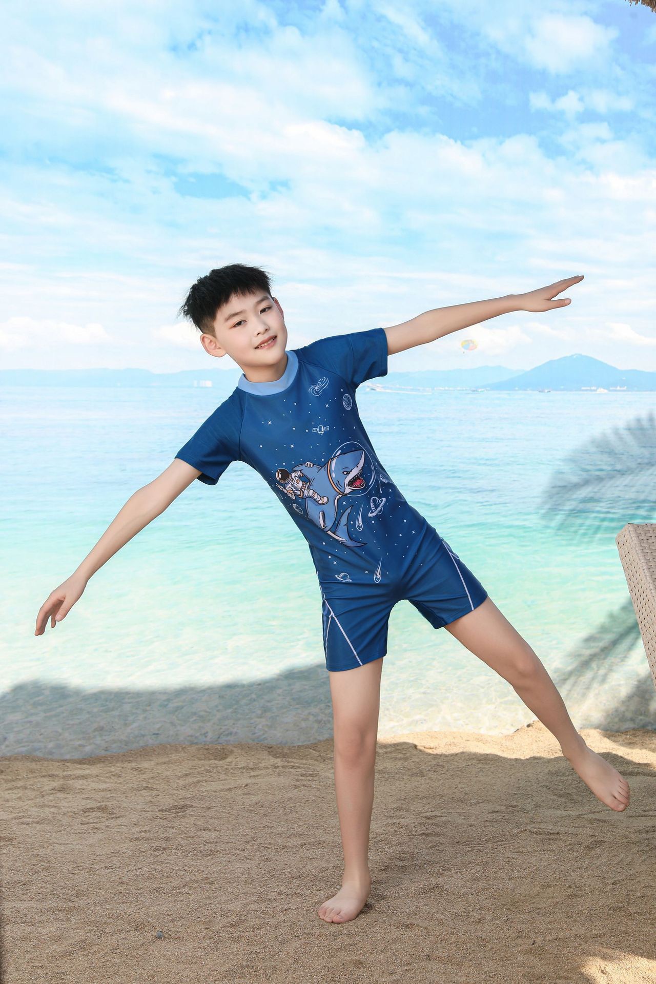 쪼개지는 어린이 수영복 소년의 원피스 반팔 빠른 건조 수영복 큰 소년의 수영 트렁크 온천 수영복 도매