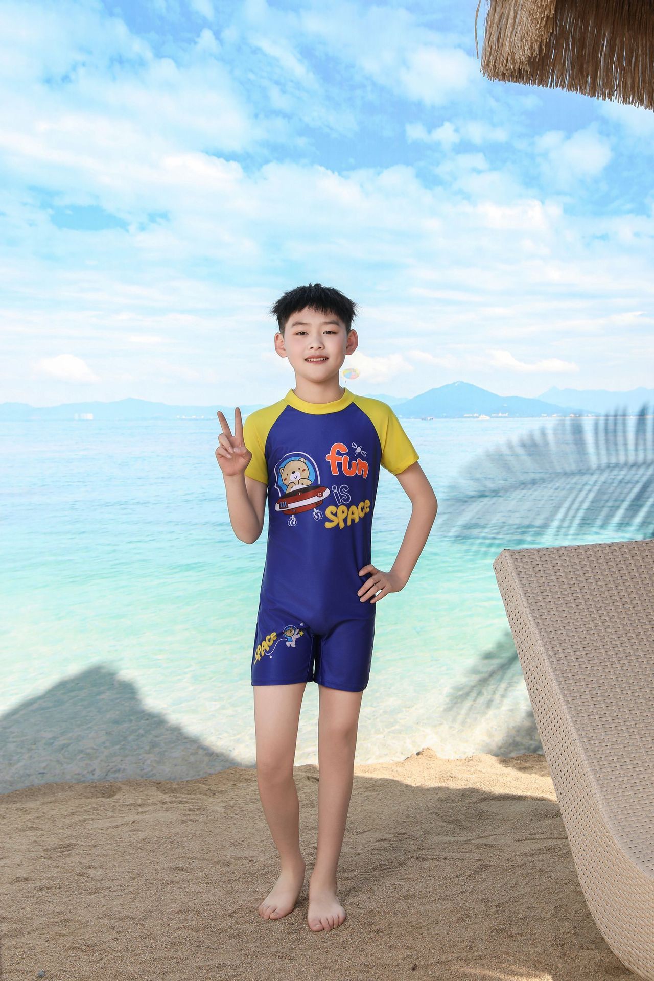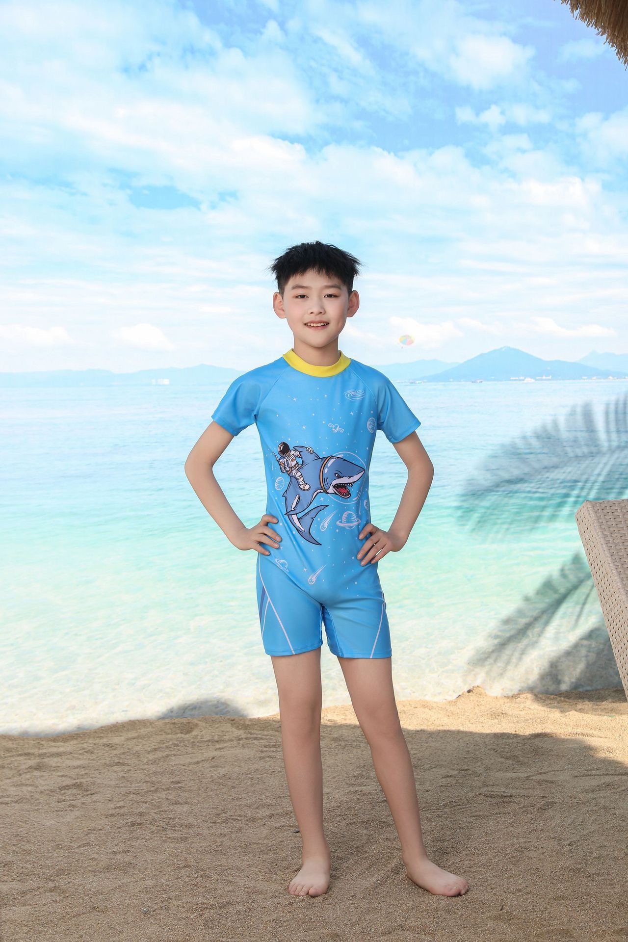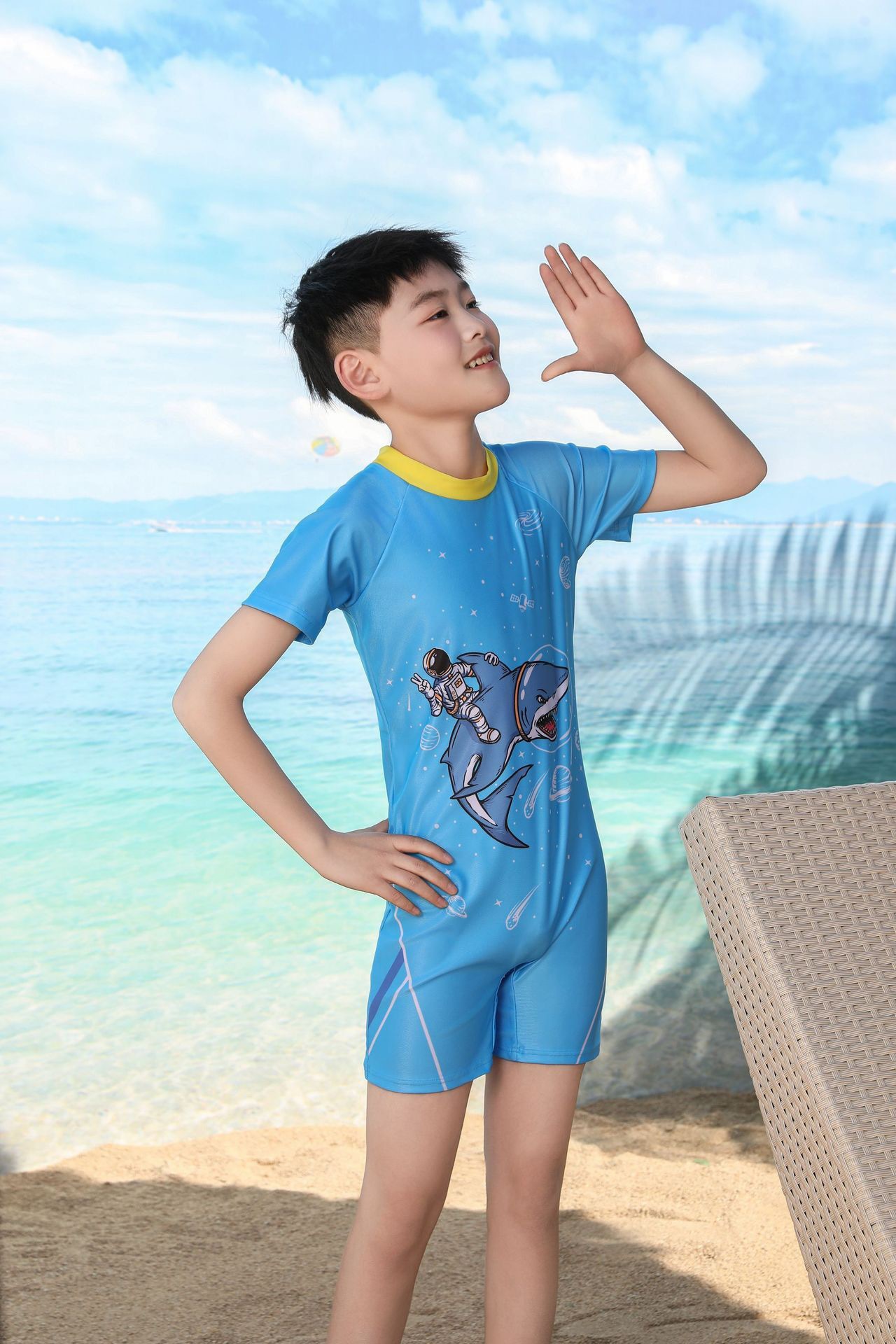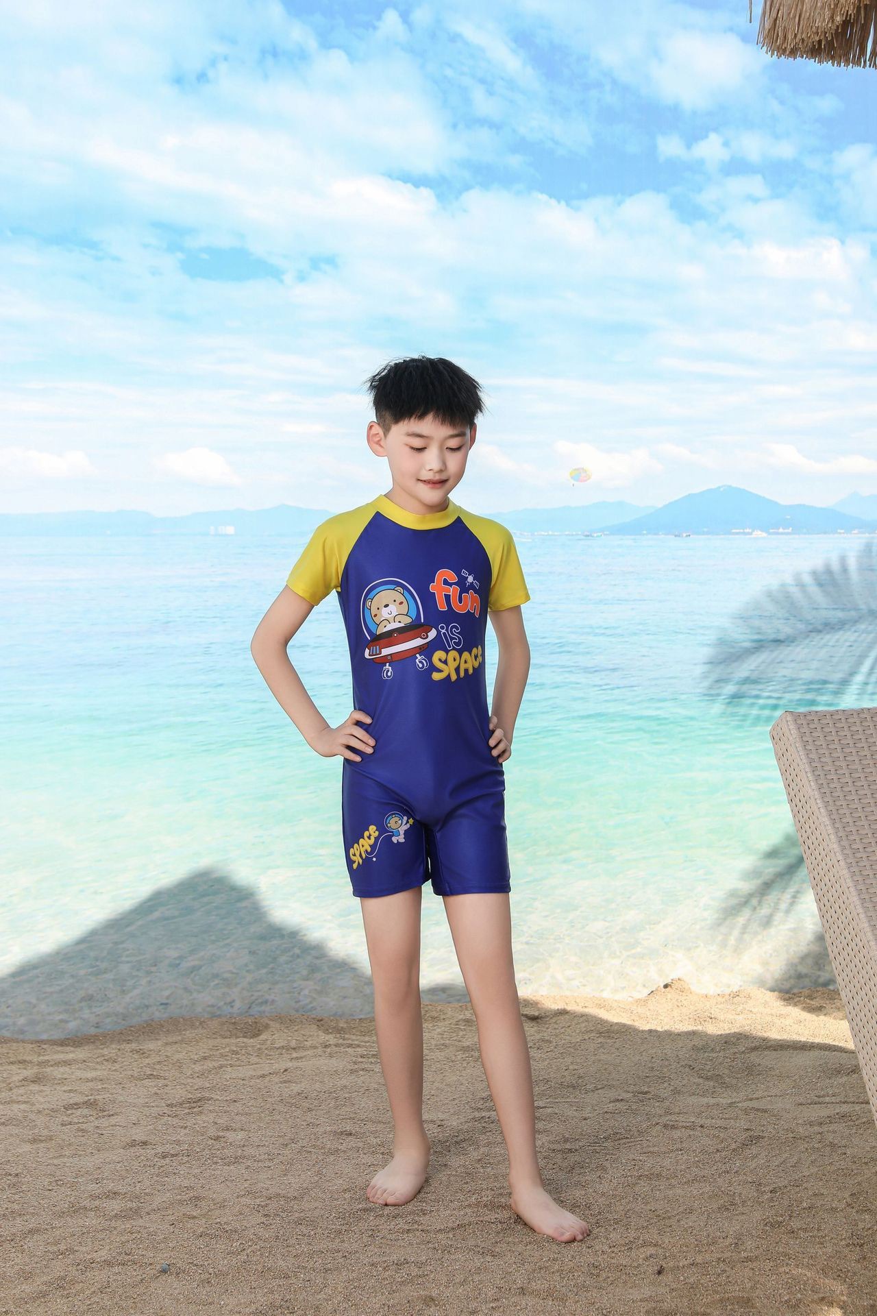 쪼개지는 어린이 수영복 소년의 원피스 반팔 빠른 건조 수영복 큰 소년의 수영 트렁크 온천 수영복 도매