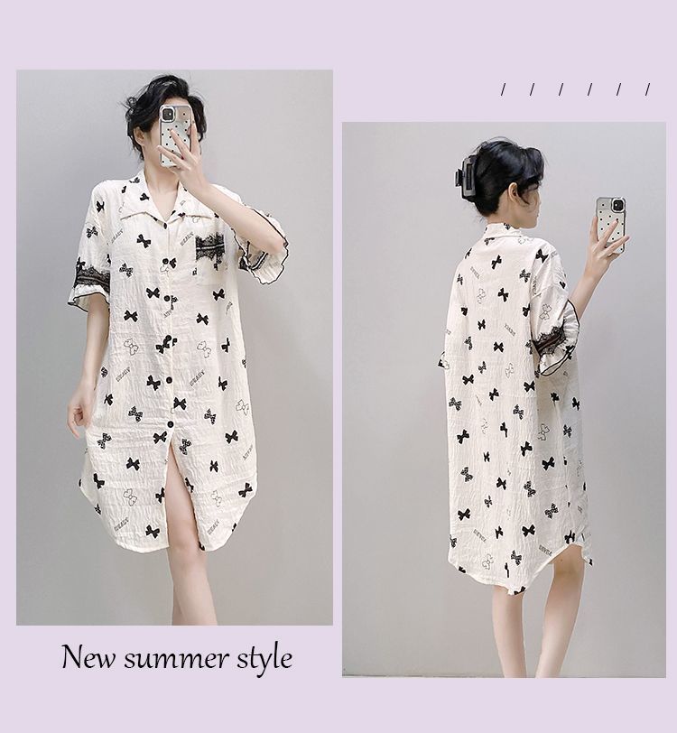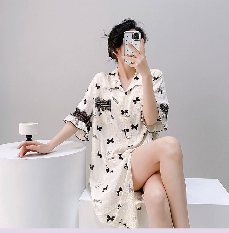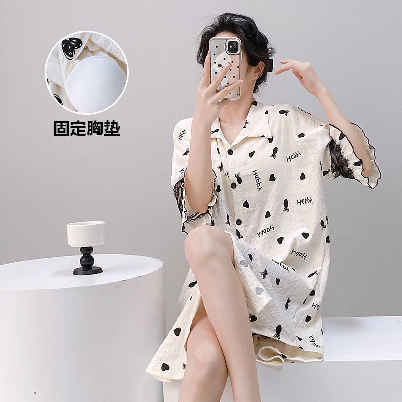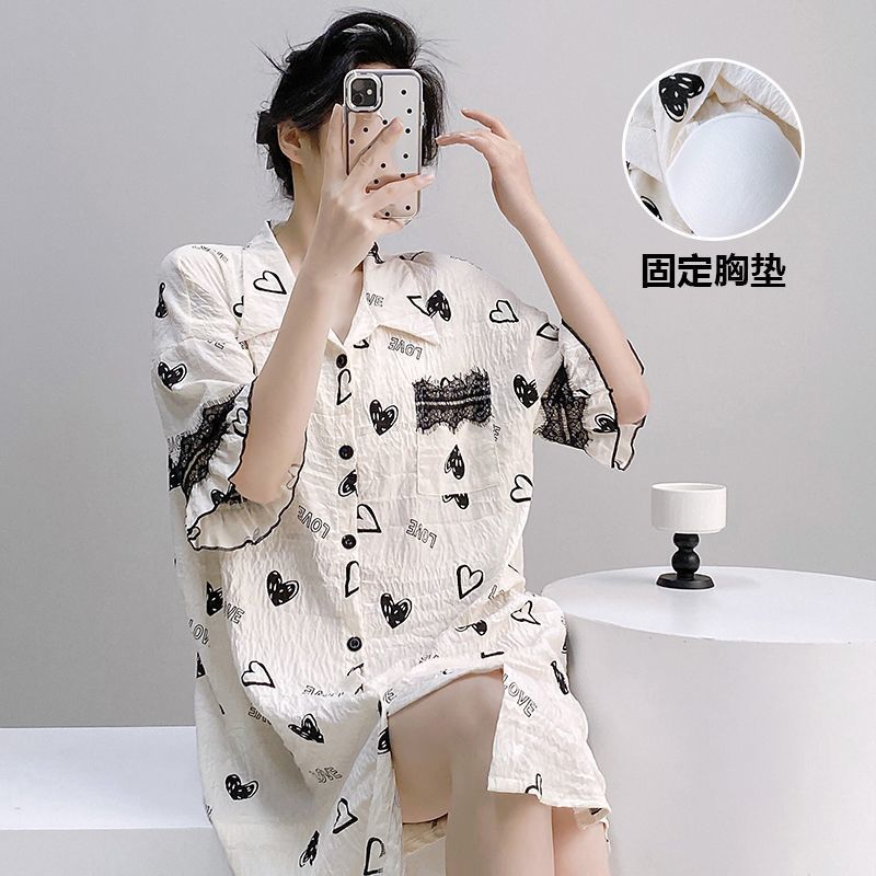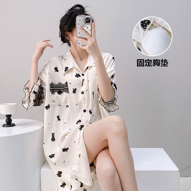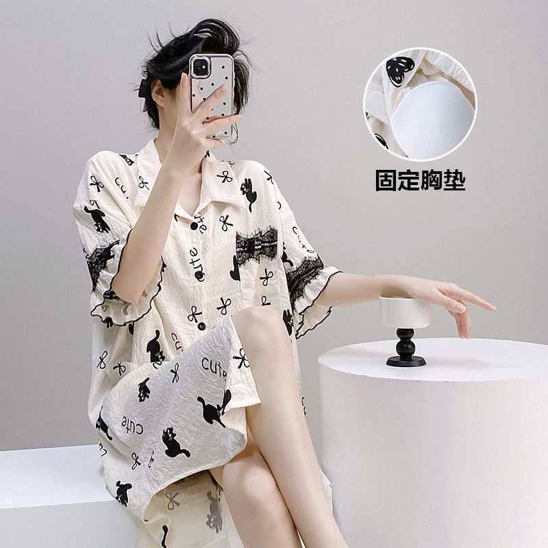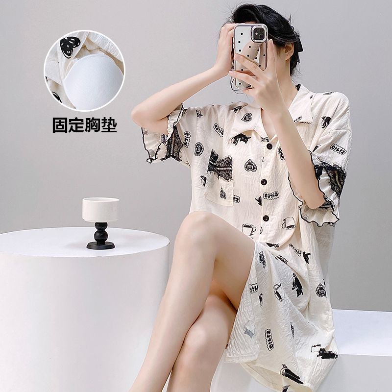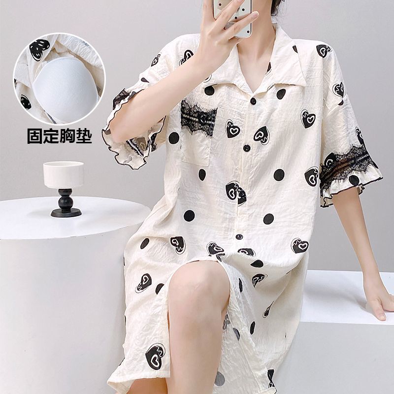여름 얇은 나이트 드레스 중간 소매 작은 옷깃 카디건 홈 원피스 레이스 포켓 인쇄 서양식 파자마 고정 가슴 패드스토어 가기