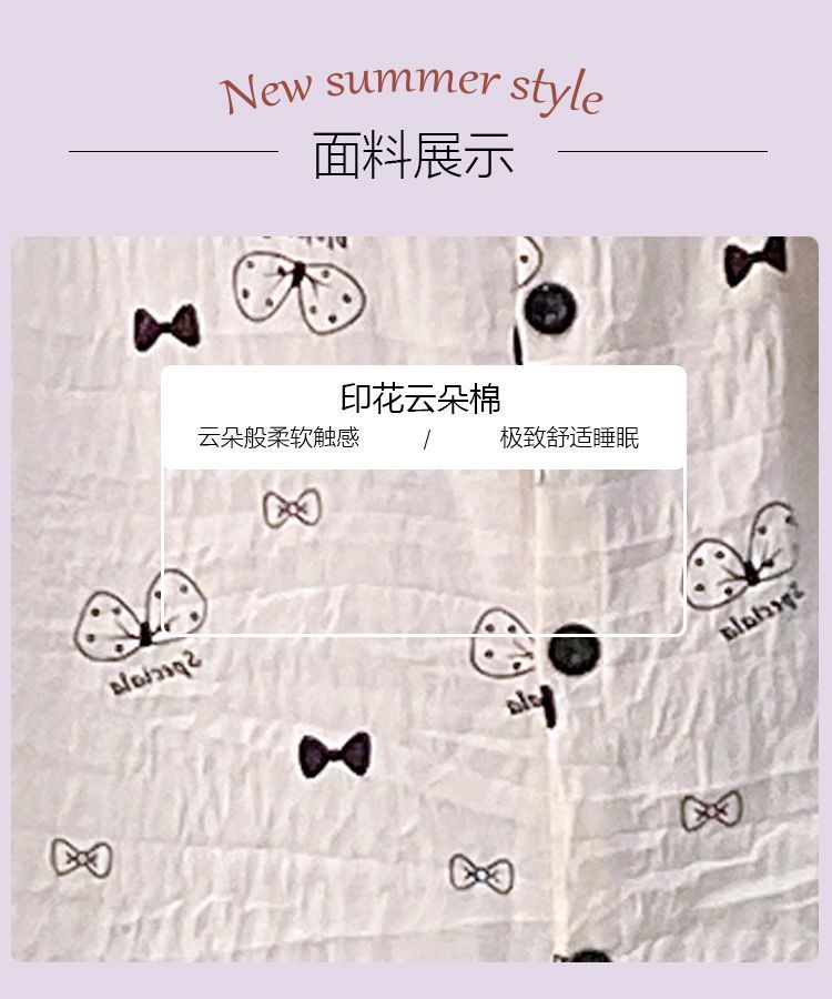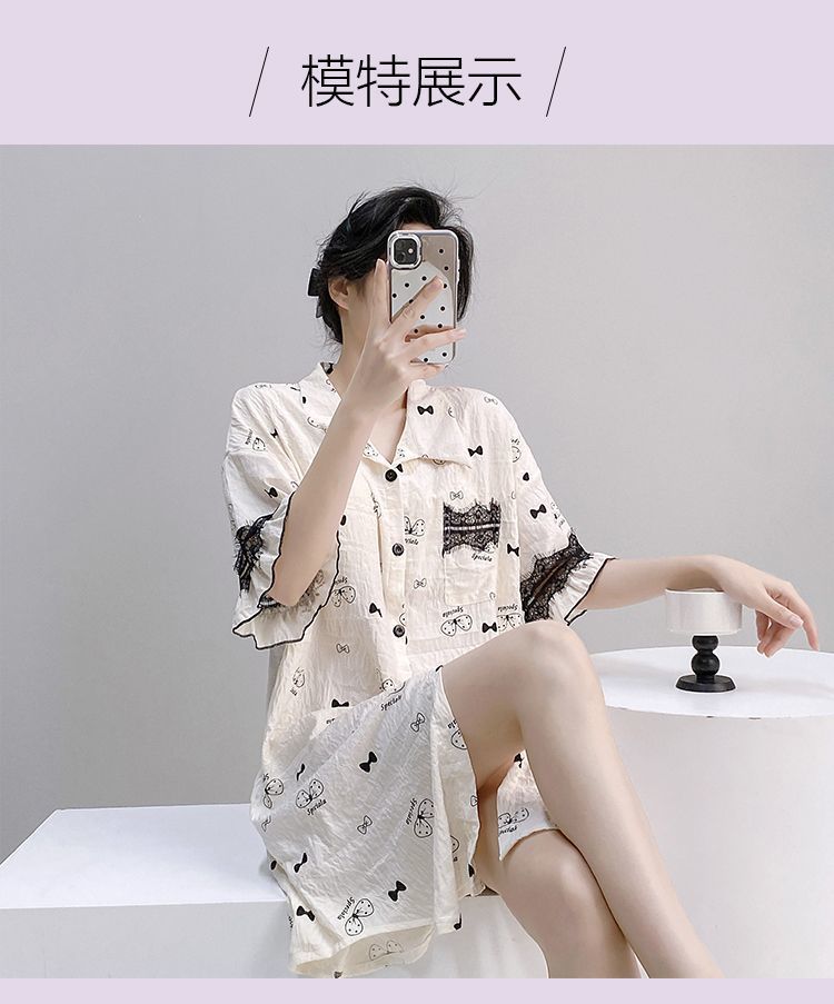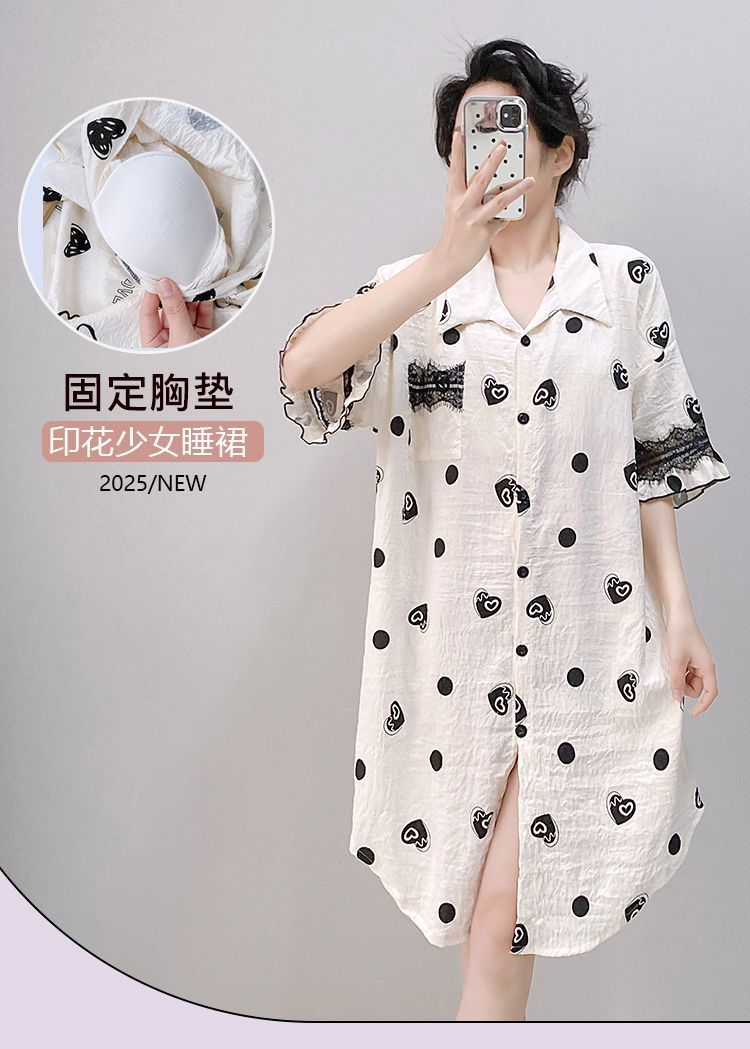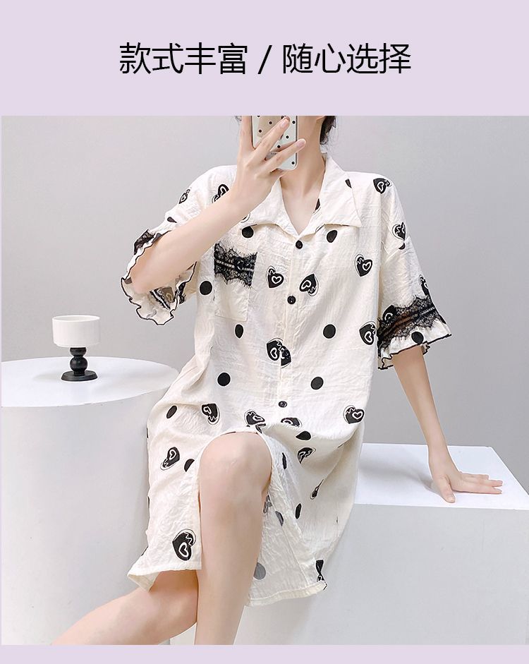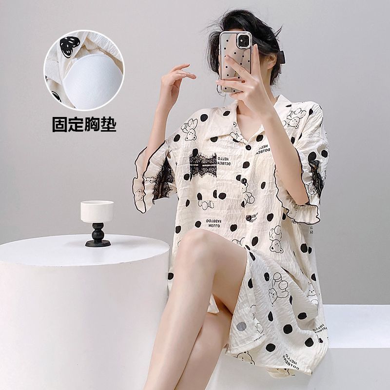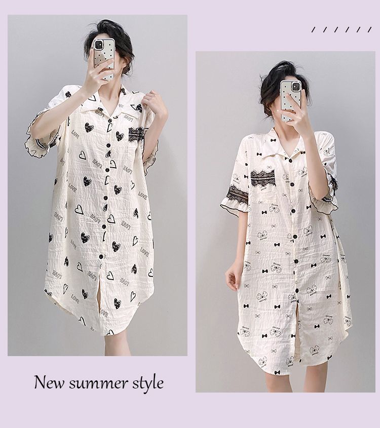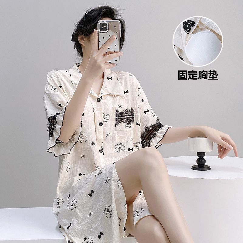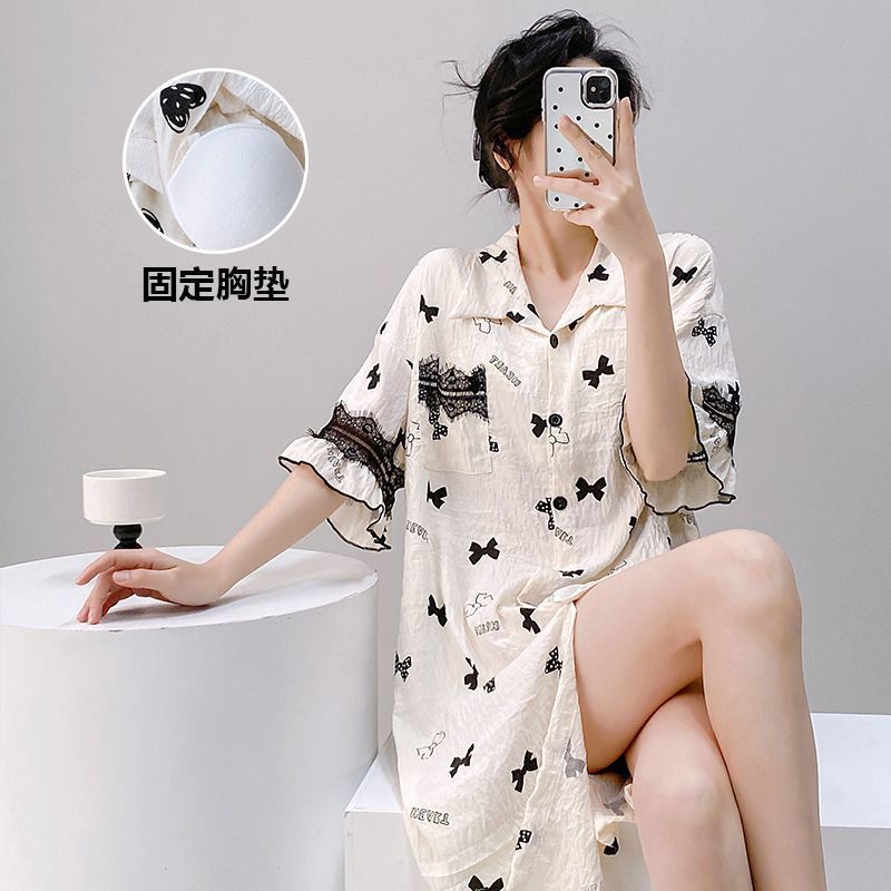 여름 얇은 나이트 드레스 중간 소매 작은 옷깃 카디건 홈 원피스 레이스 포켓 인쇄 서양식 파자마 고정 가슴 패드스토어 가기