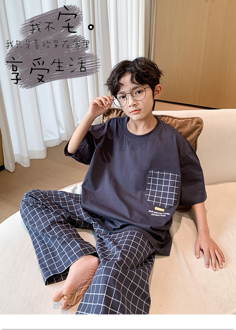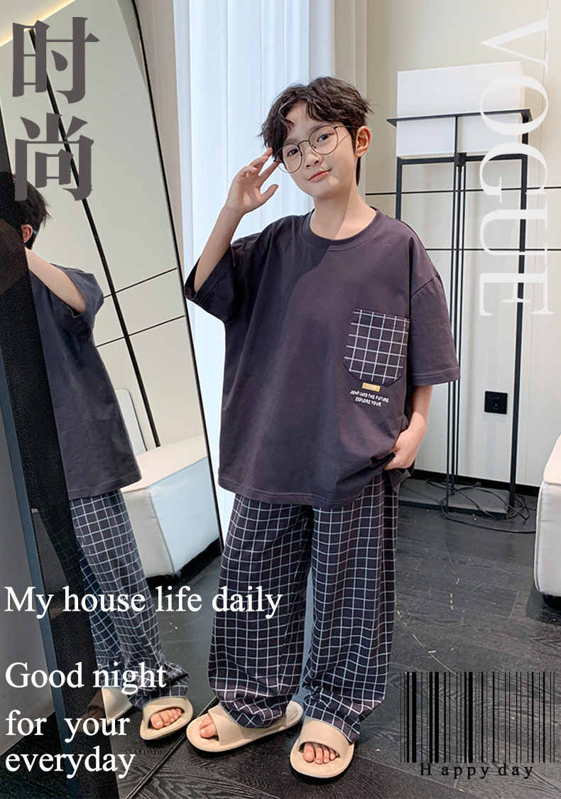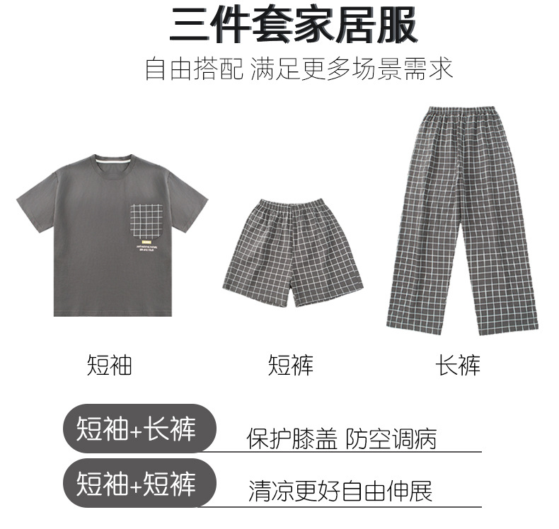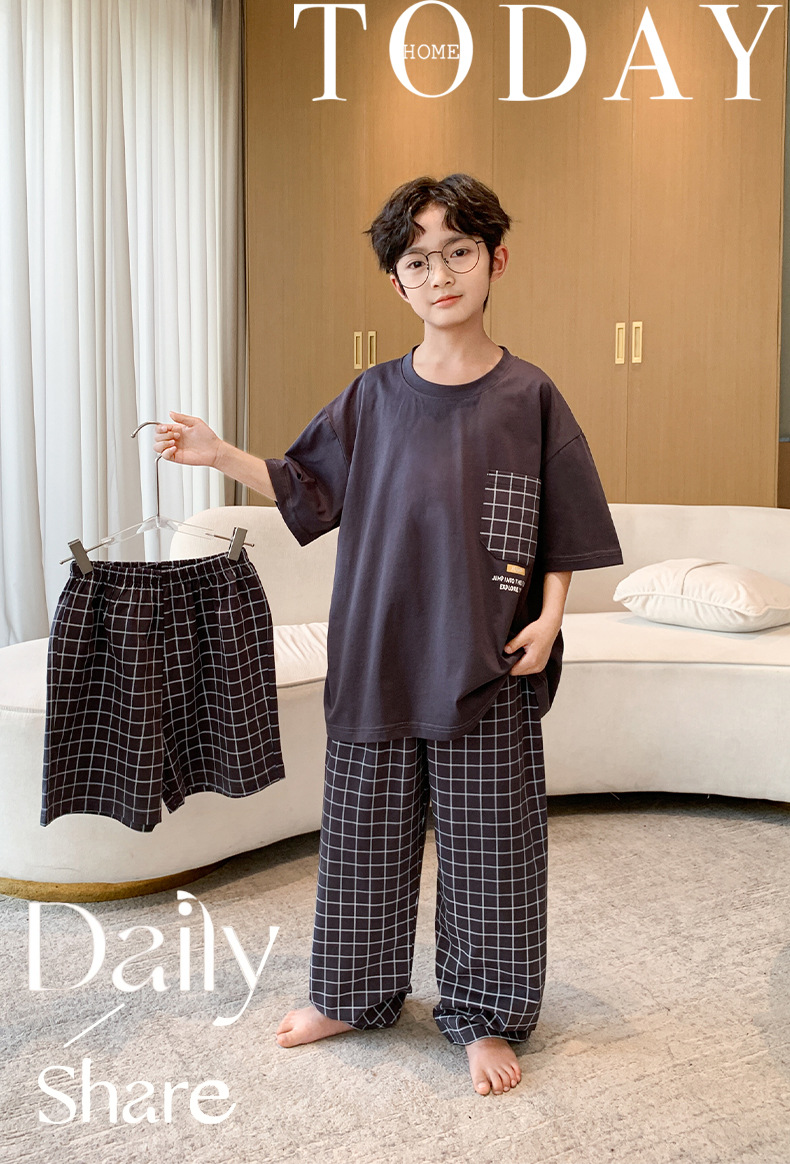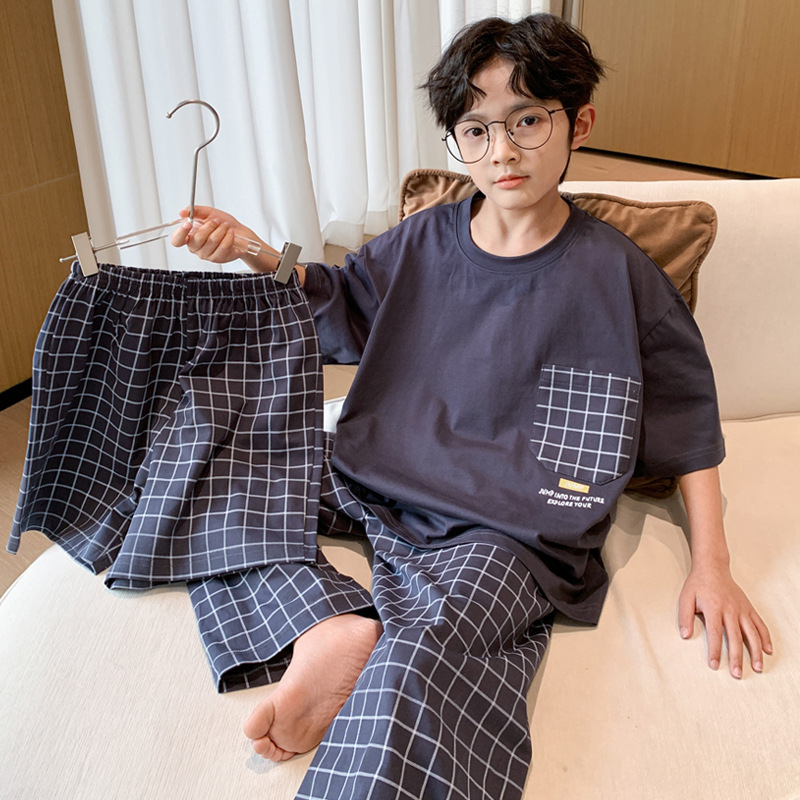소년 여름 소년 및 청소년을위한 순면 잠옷 중대형 어린이를위한 반팔 3 피스 세트 에어컨 가정복 어린이 여름 스타일스토어 가기